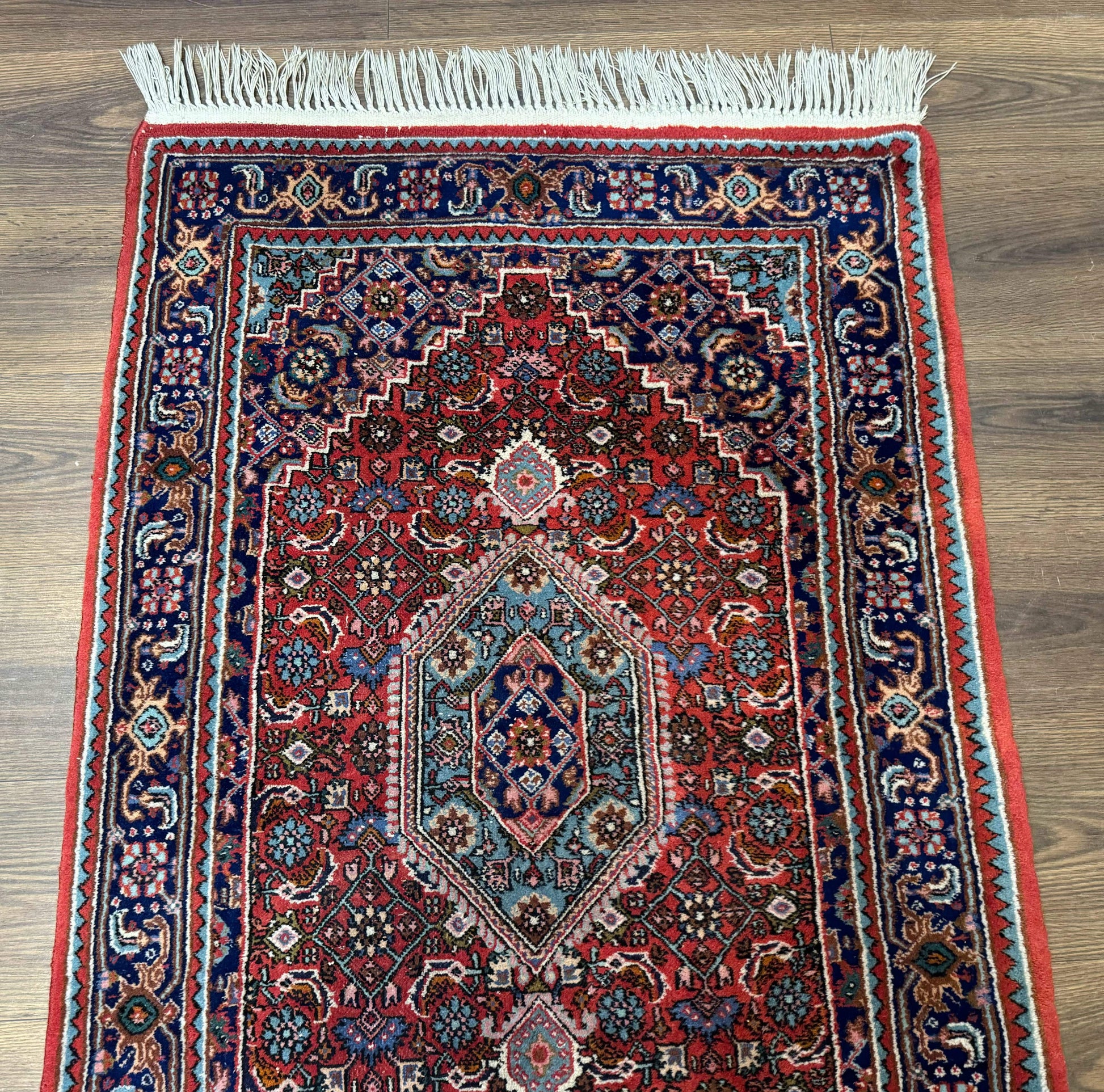Indo Persian Bidjar Runner Rug 3 x 18.6, Red Navy Blue, Long Runner, Wool Oriental Carpet