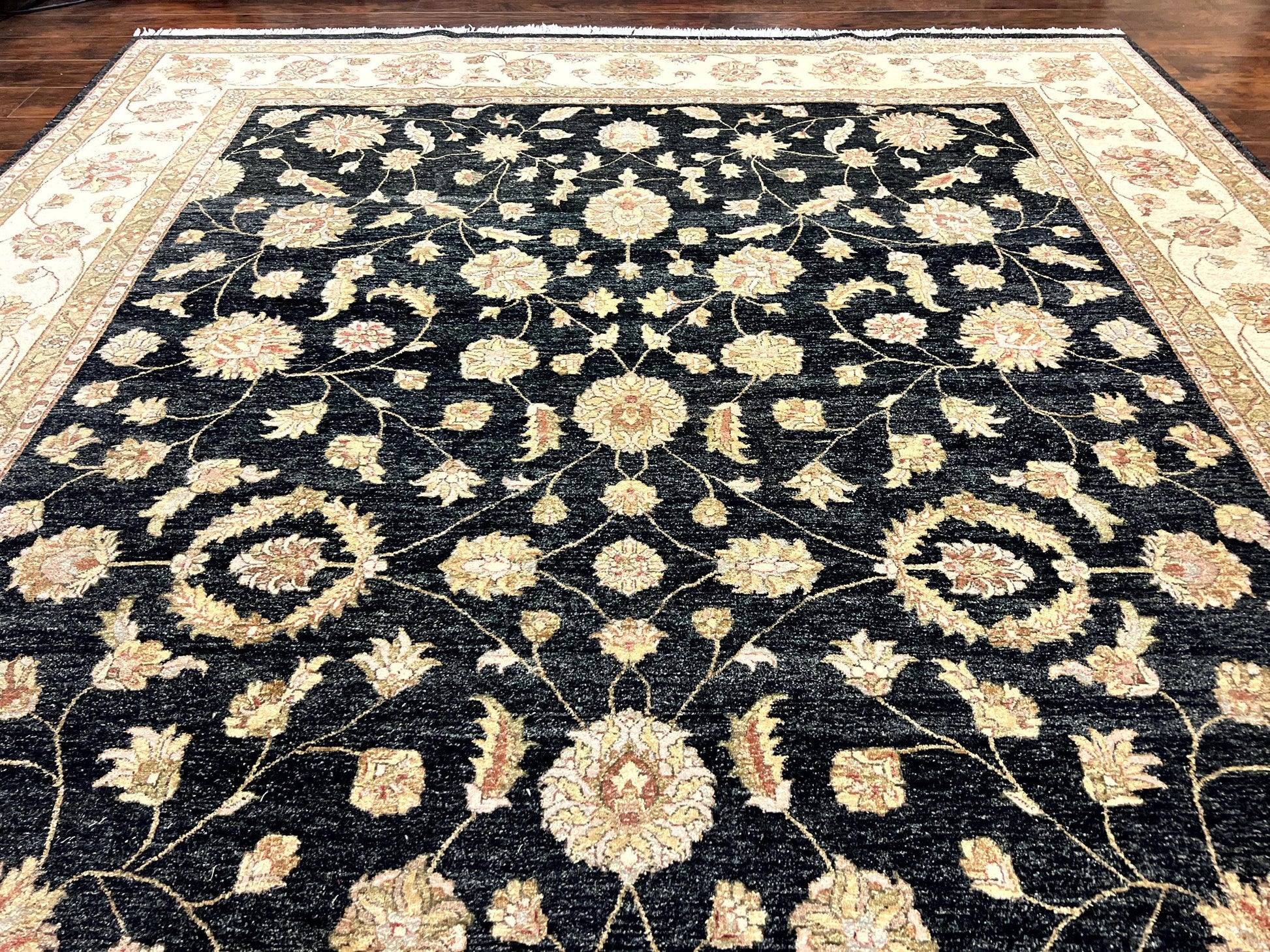Indo Persian Rug 10x14, Charcoal and Beige, Floral Allover, Handmade Vintage Wool Carpet