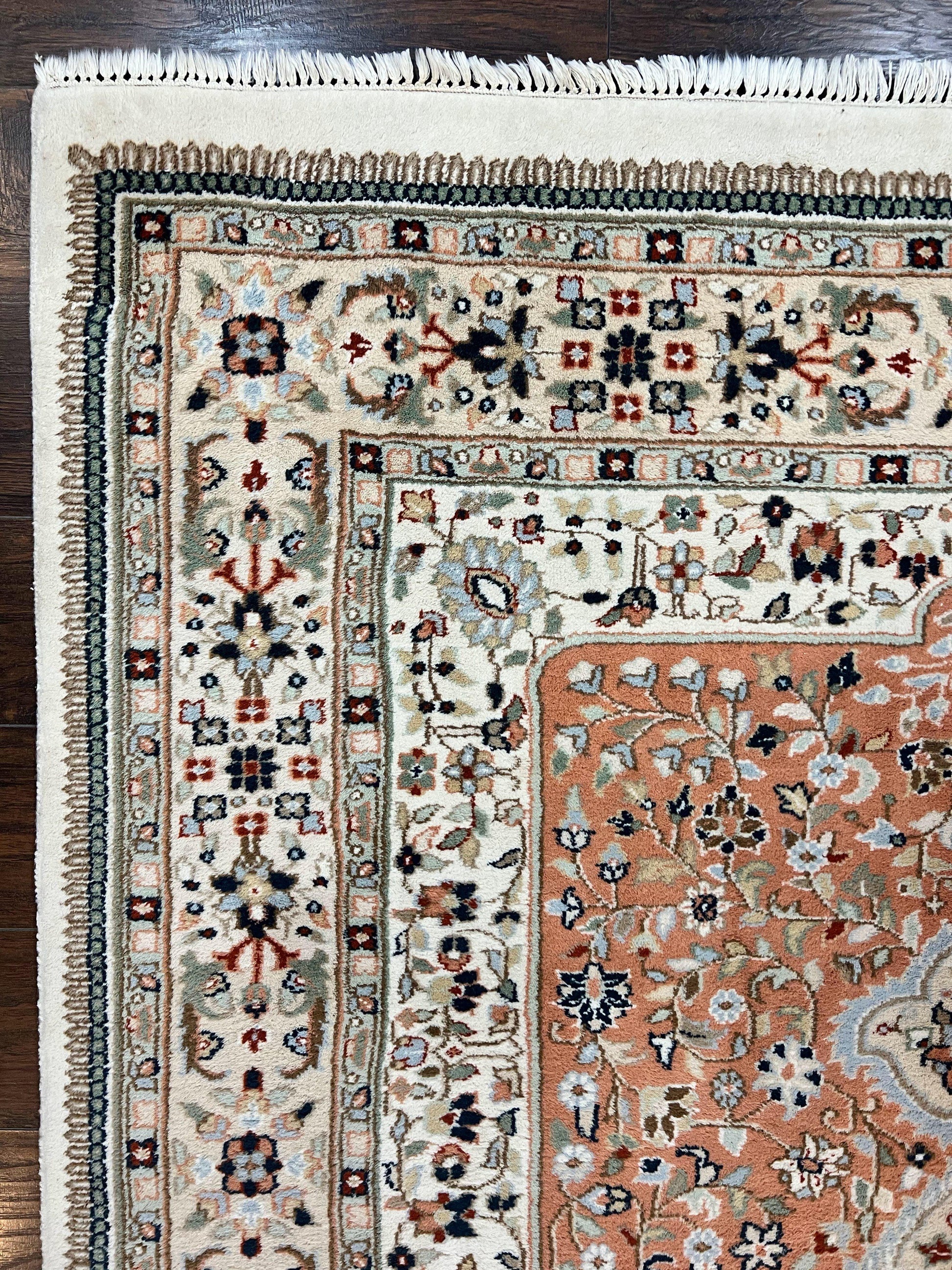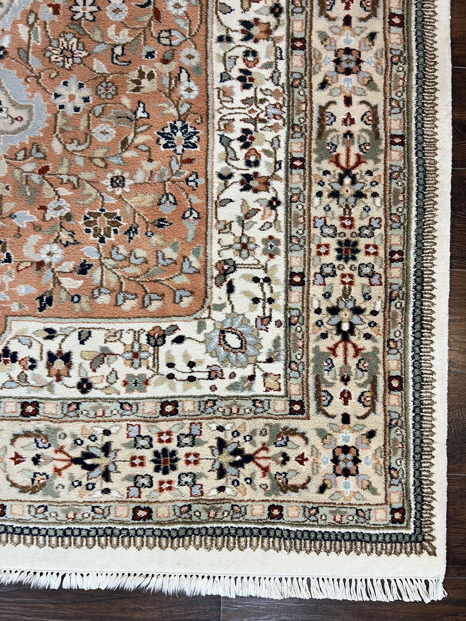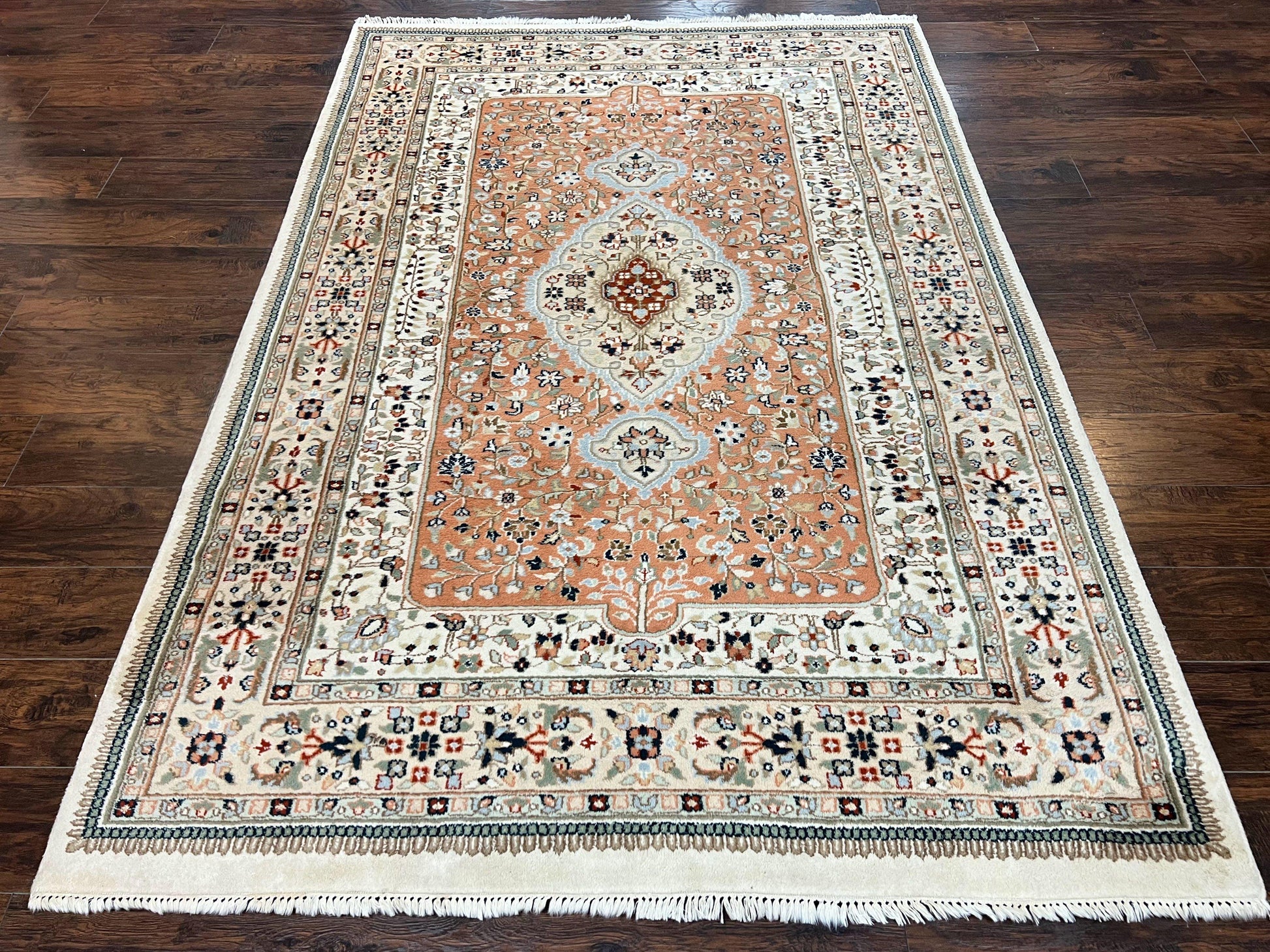 Indo Persian Rug 6x9, Wool Hand Knotted Vintage Carpet, Salmon & Ivory, Traditional Oriental Rug 6 x 9