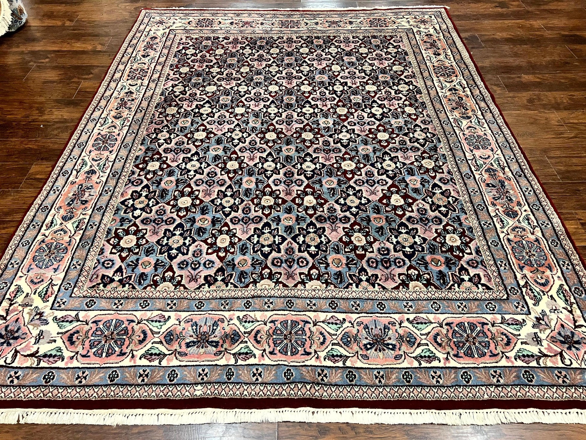 Indo Persian Rug 8x10, Repeated Allover Pattern, Navy Blue Ivory, Handmade Vintage Wool Carpet
