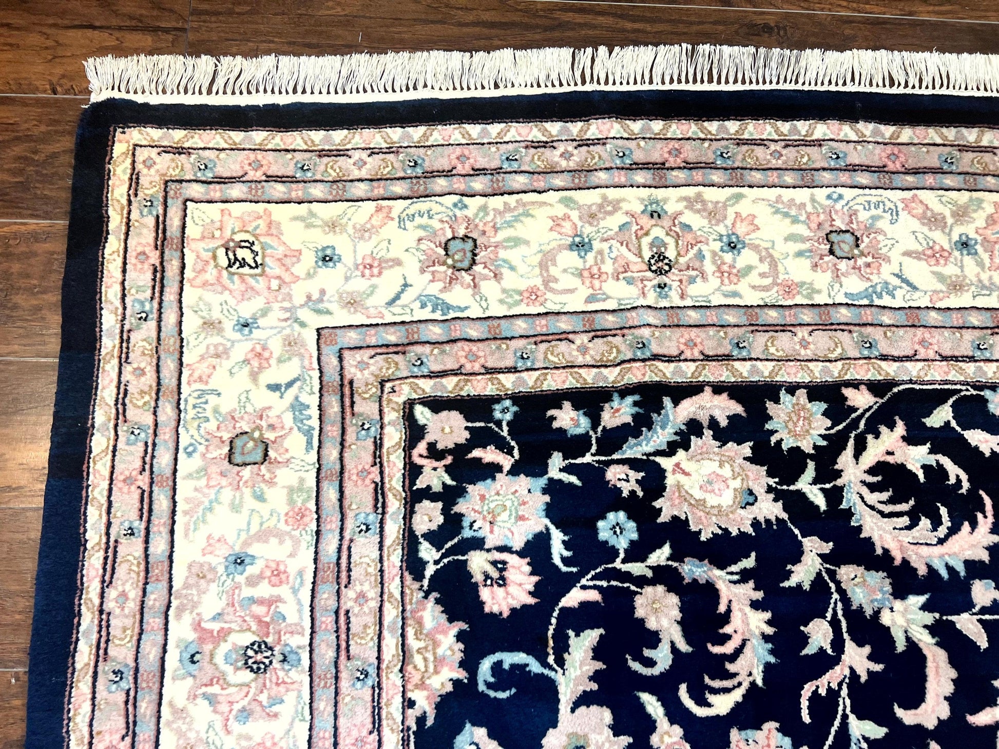 Indo Persian Rug 9x12 Wool Handmade Floral Allover Navy Ivory Vintage Carpet