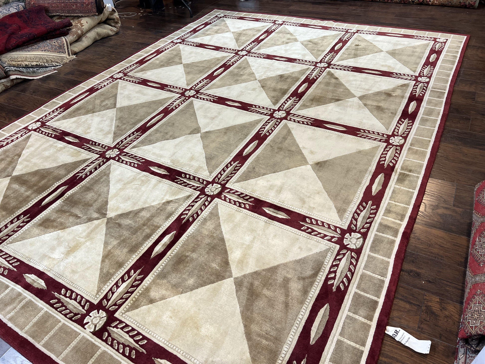 Indo Tibetan Rug 10x14, Nepali Carpet, Large Soft Wool Area Rug, Olive Tan Maroon, Contemporary Rug 10 x 14 ft Living Room Rug, Handmade Rug