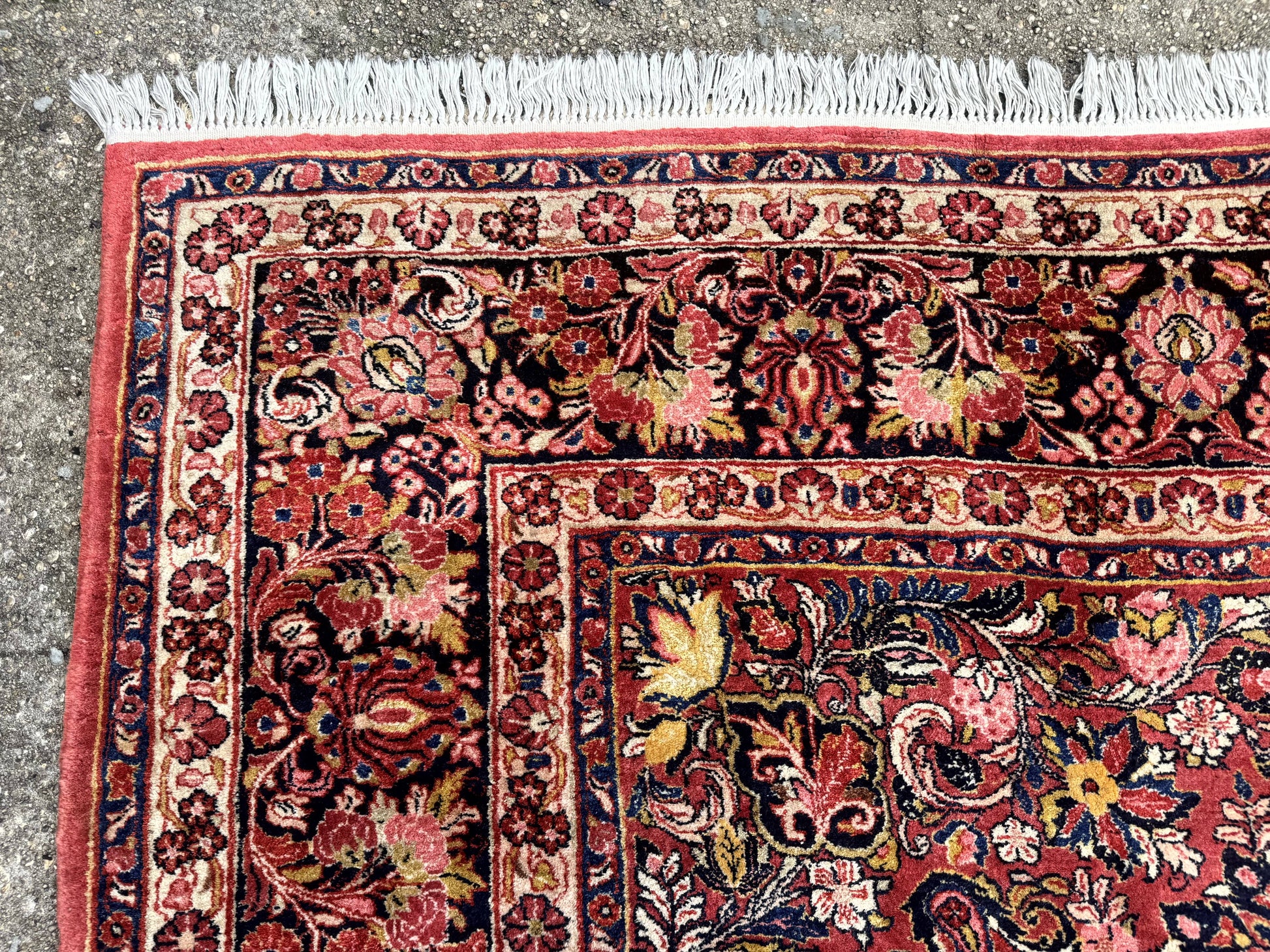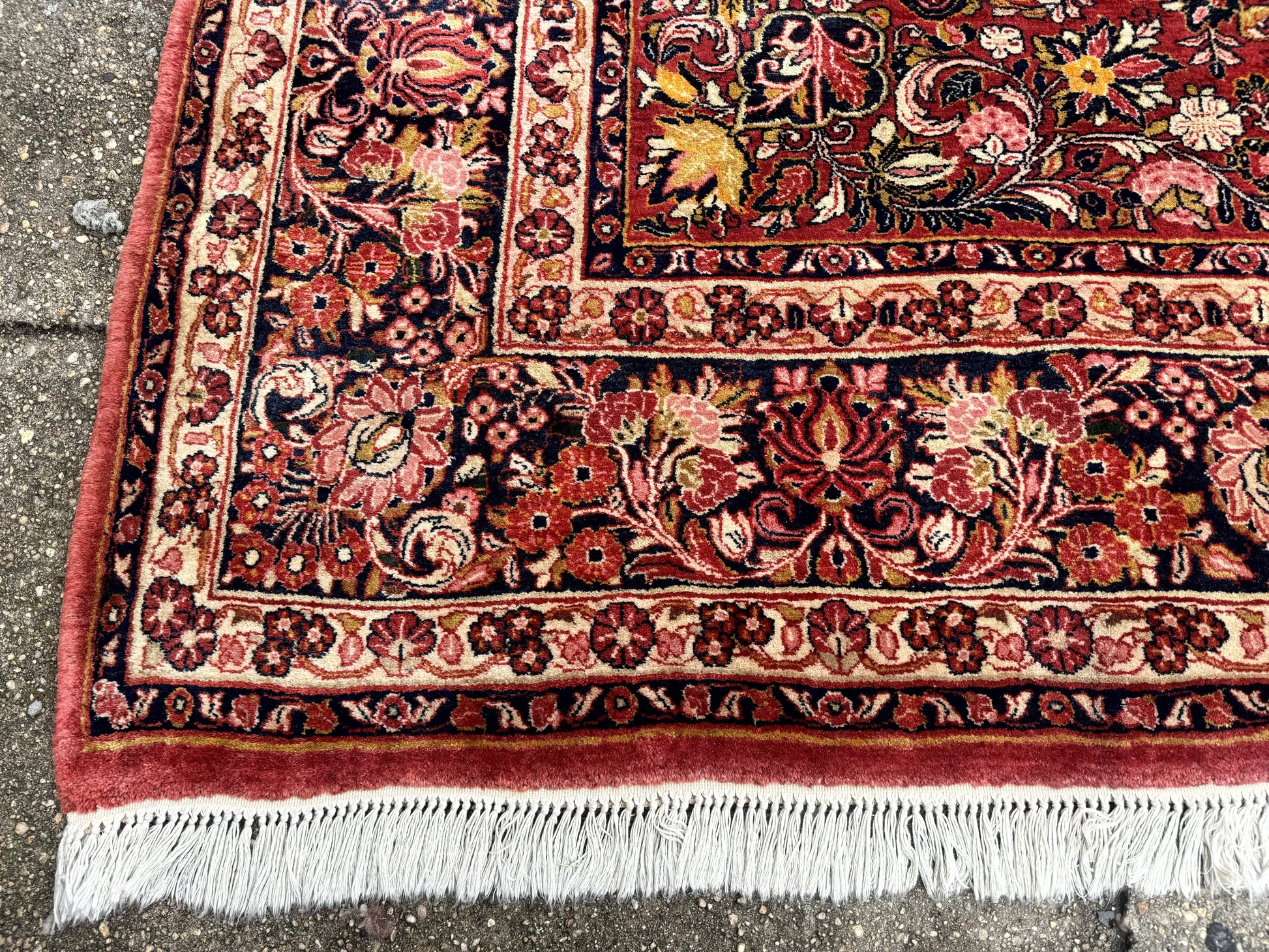 - Color & Pattern: Deep red field with navy borders, ivory and pink/blue accents, central rosette, and an allover floral motif with scrolling vines and palmettes.
