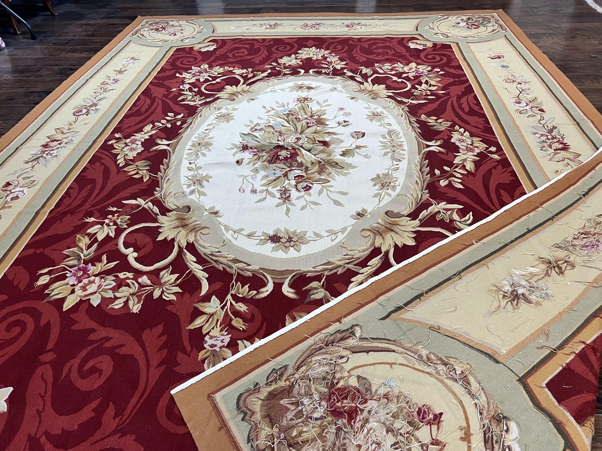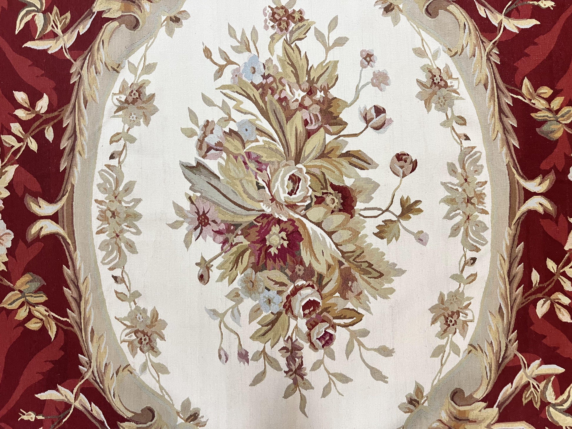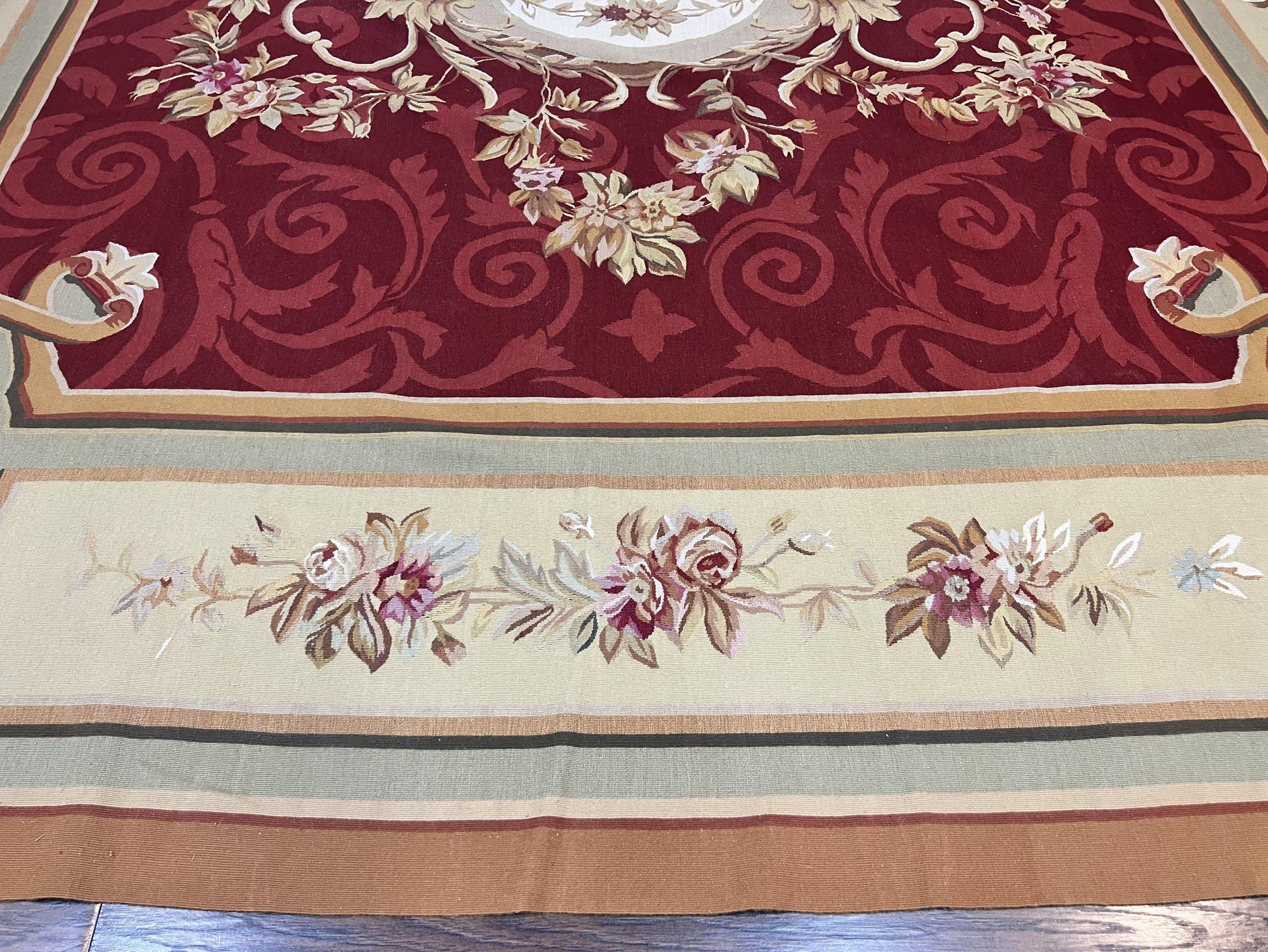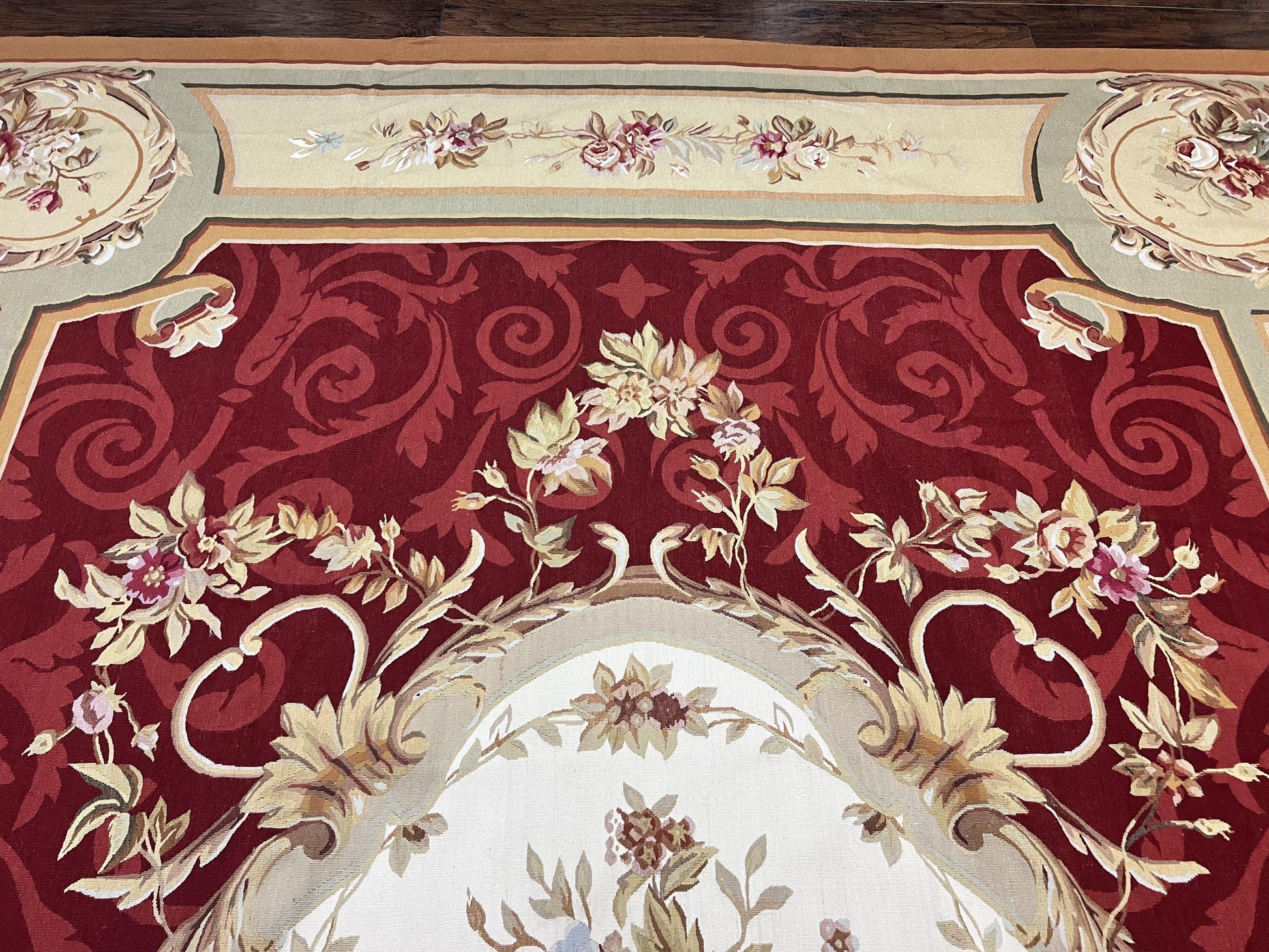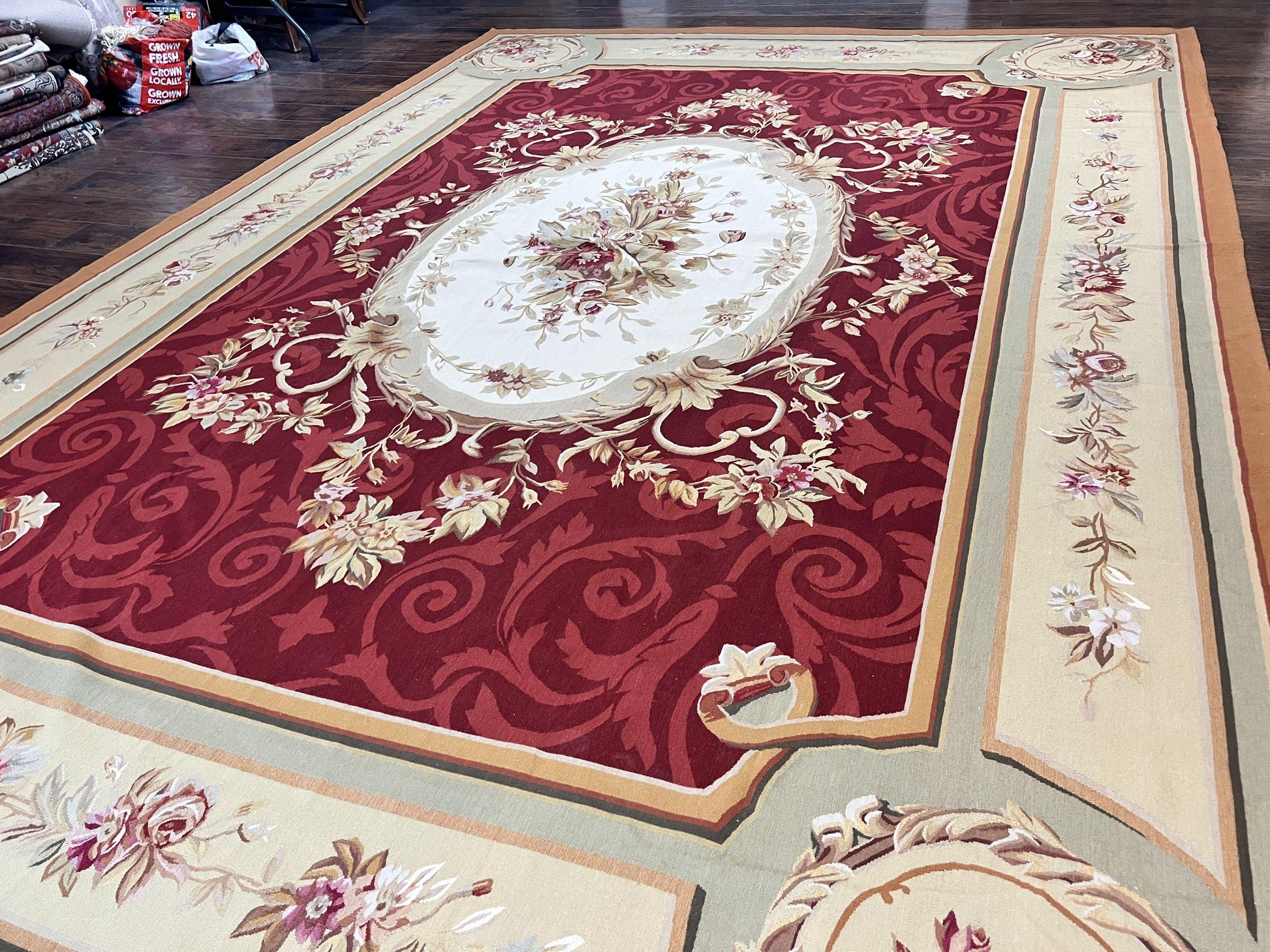 Large Aubusson Rug 10x14, Wool Handmade Vintage Carpet, Dark Red Ivory Tan, French European Elegant Aubusson Weave Rug