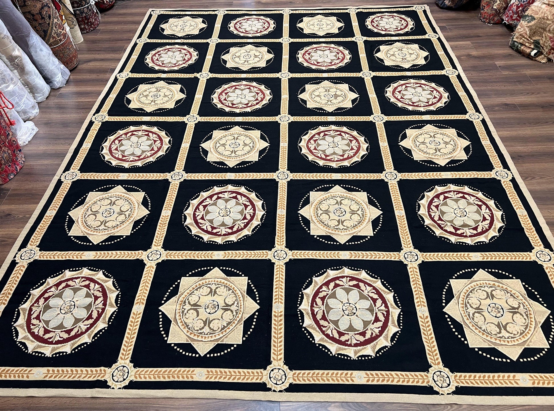 Large Needlepoint Rug 10x13, Panel Design, Black and Beige, Wool Needlepoint Carpet 10 x 13, English Garden, Handwoven Area Rug, Living Room