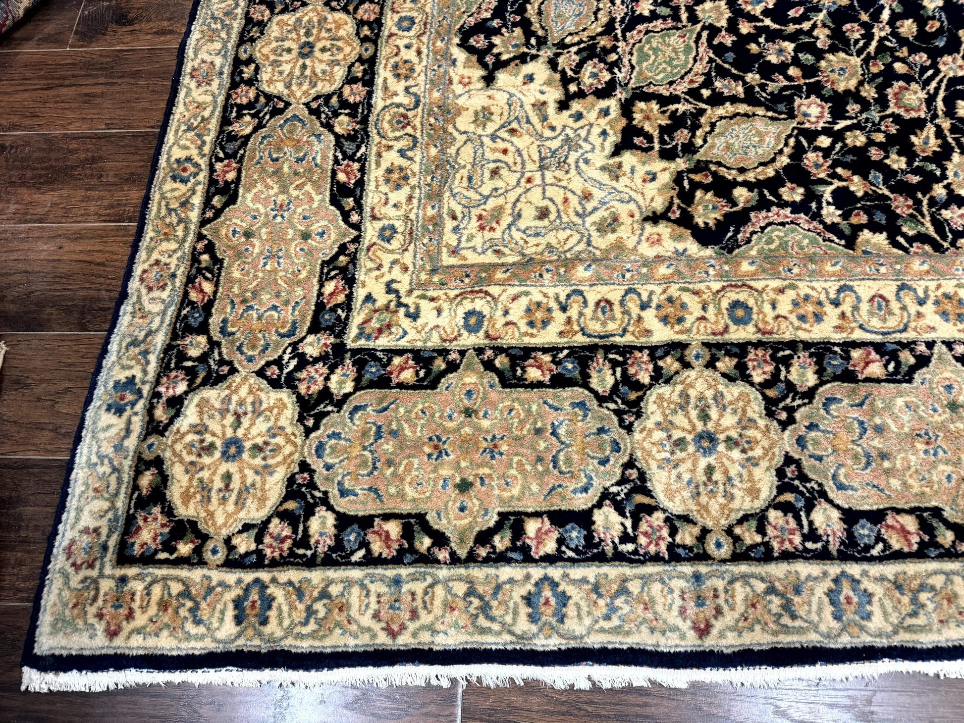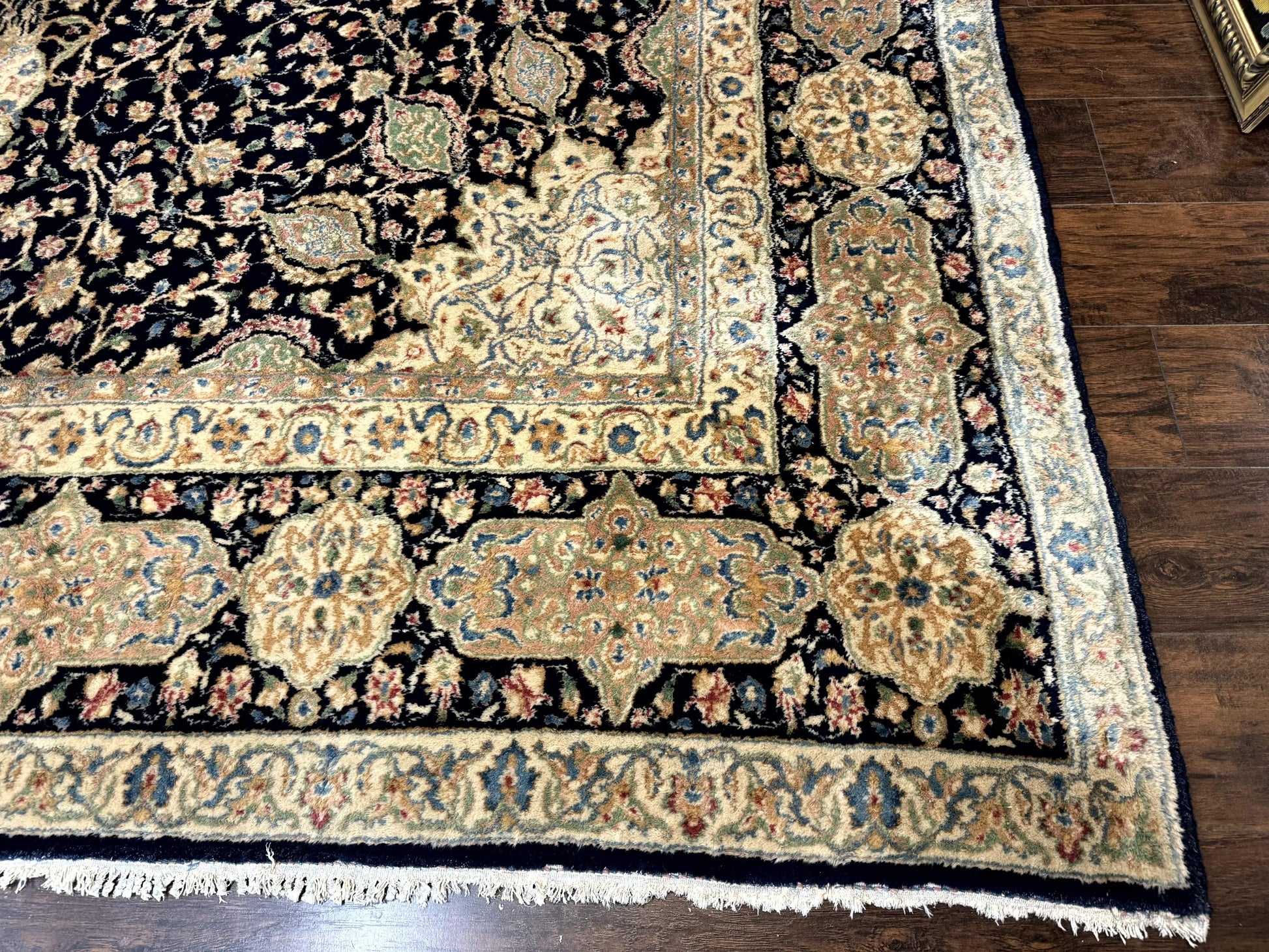 Persian Kerman Rug 10x14 Navy Blue Beige Floral Medallion Traditional Carpet Signed by Masterweaver