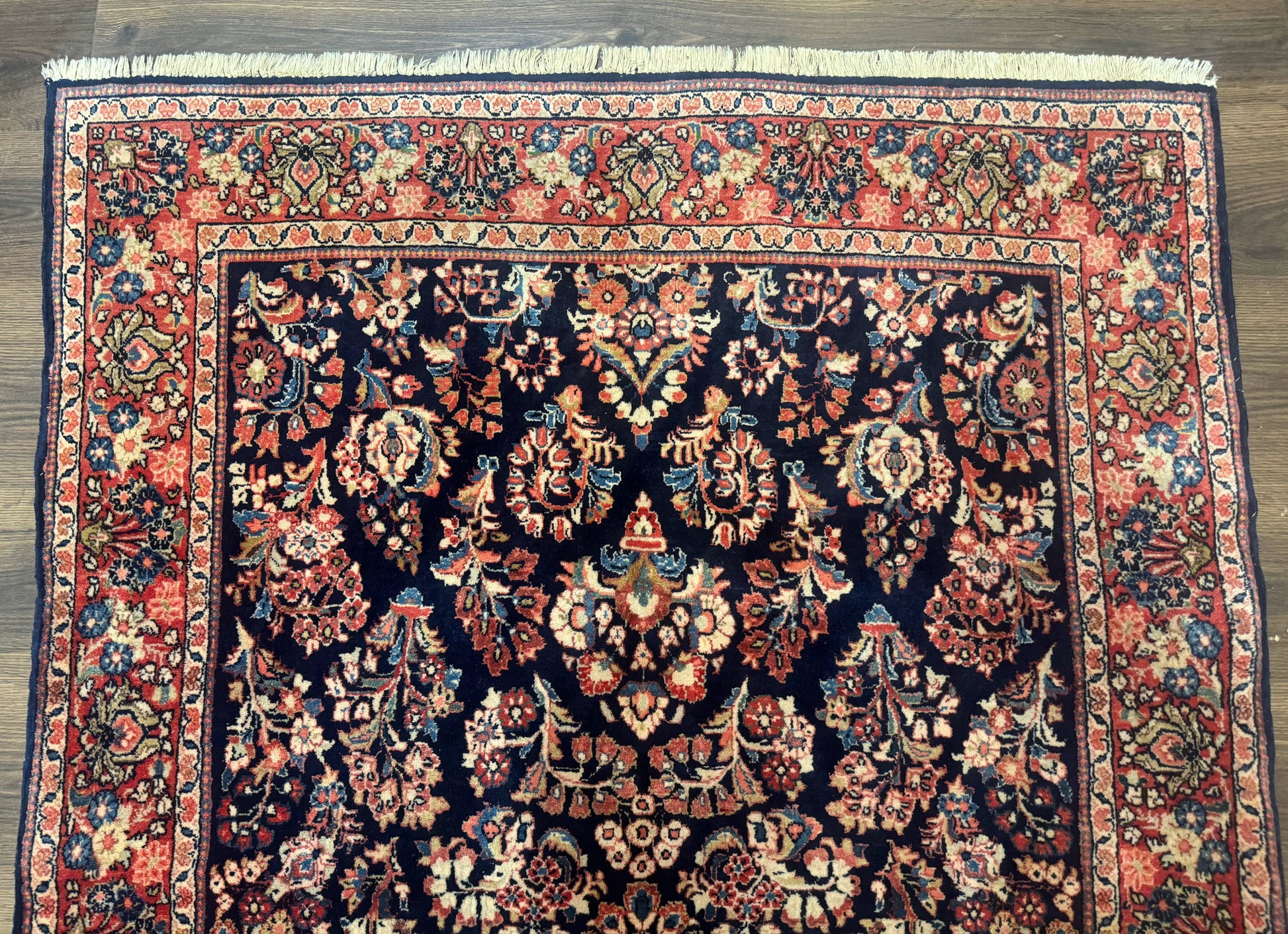 Introducing a Navy Blue Persian Rug 4x6 from the Sarouk Mohajeran lineage—a refined antique, hand-knotted in wool and designed for collectors and design enthusiasts seeking timeless elegance. Its garden-like florals on a rich navy field, framed by a detailed red-coral border, bring warmth and sophistication to any room.