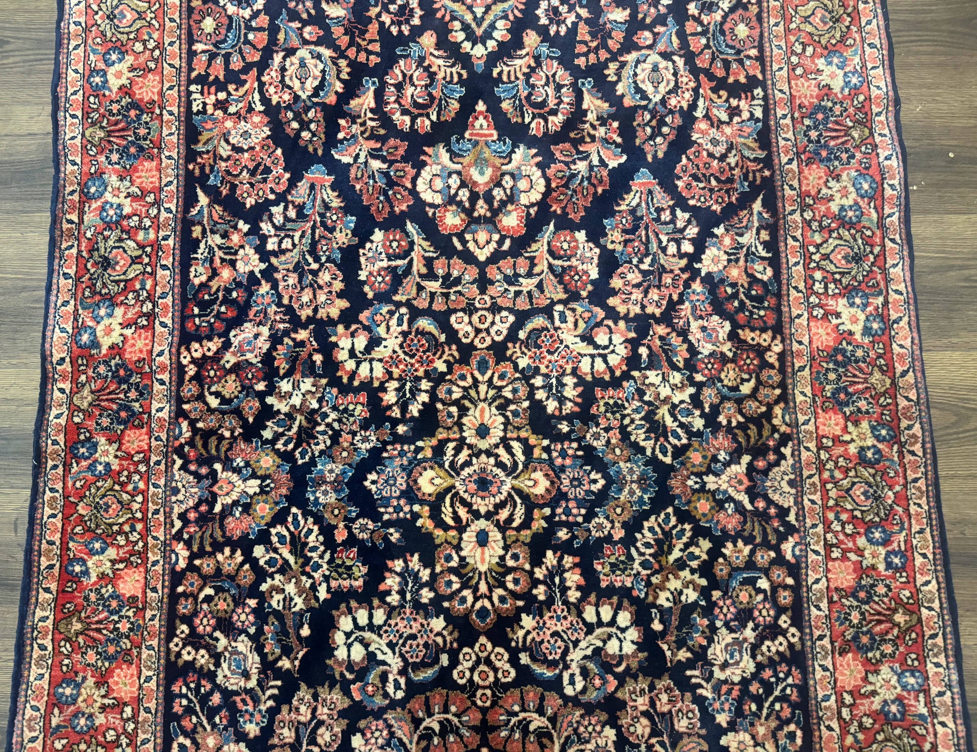 This antique Mohajeran rug delivers lasting beauty and reliability. The high knot density and premium wool construction translate to durability that stands up to daily use while preserving fine detail in the floral motifs. The deep navy field anchors the room, and the warm red-coral border provides a refined frame that complements both traditional and contemporary interiors.