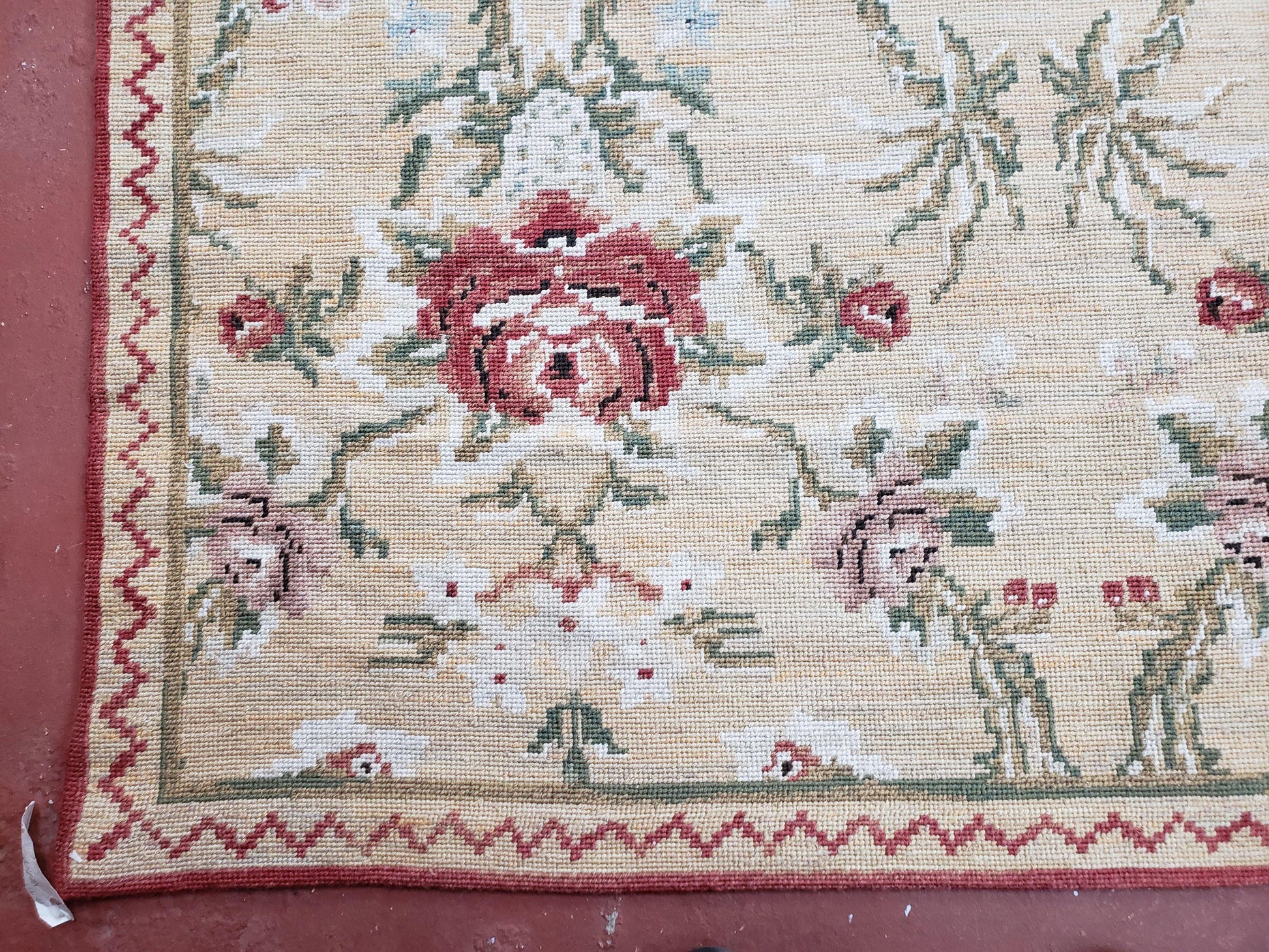 Needlepoint Rug 10x14 Wool Flatweave Carpet, English Floral Pattern, Pale Yellow, Roses, Allover Pattern, Handmade Large Needlepoint Nice