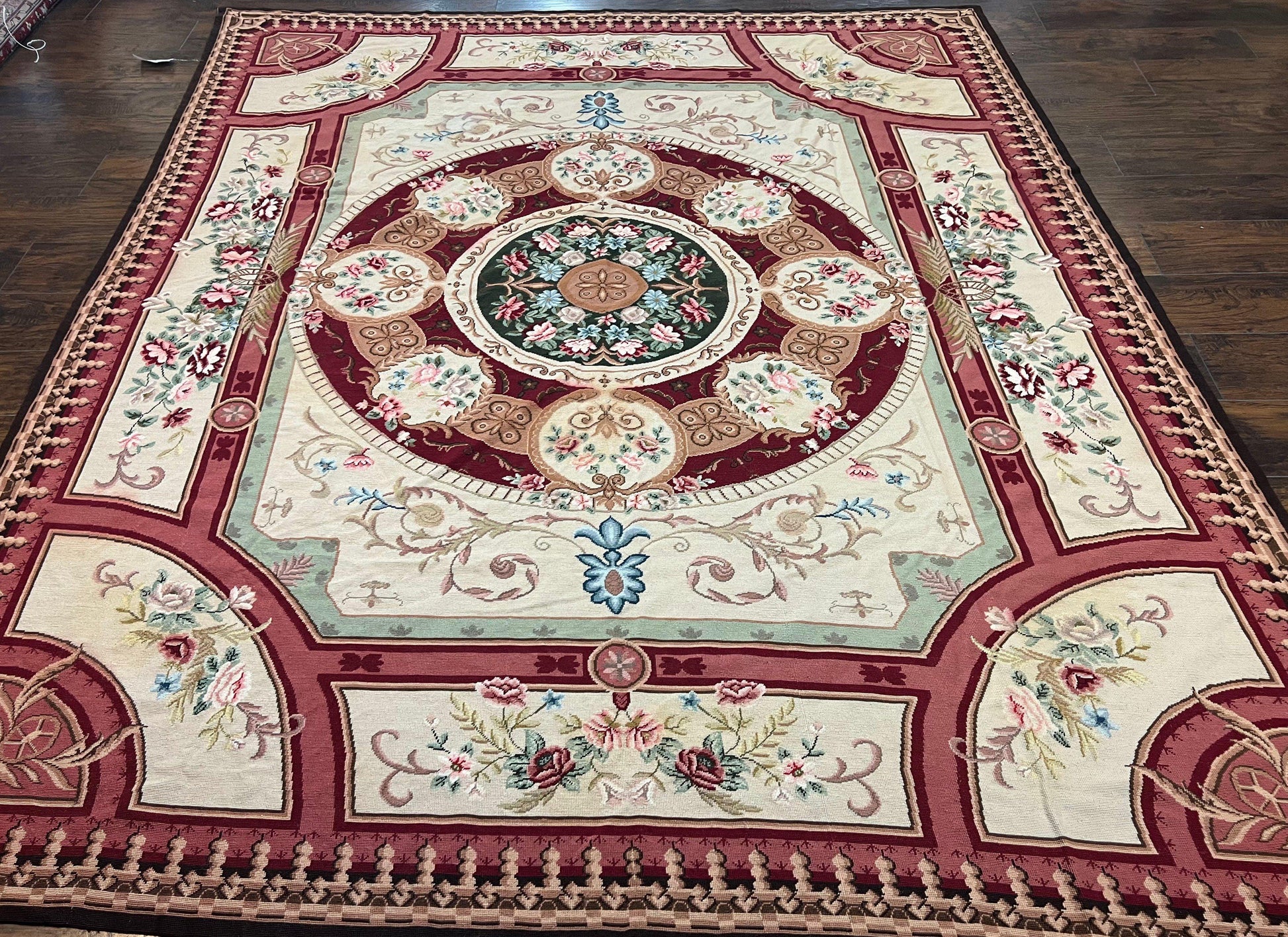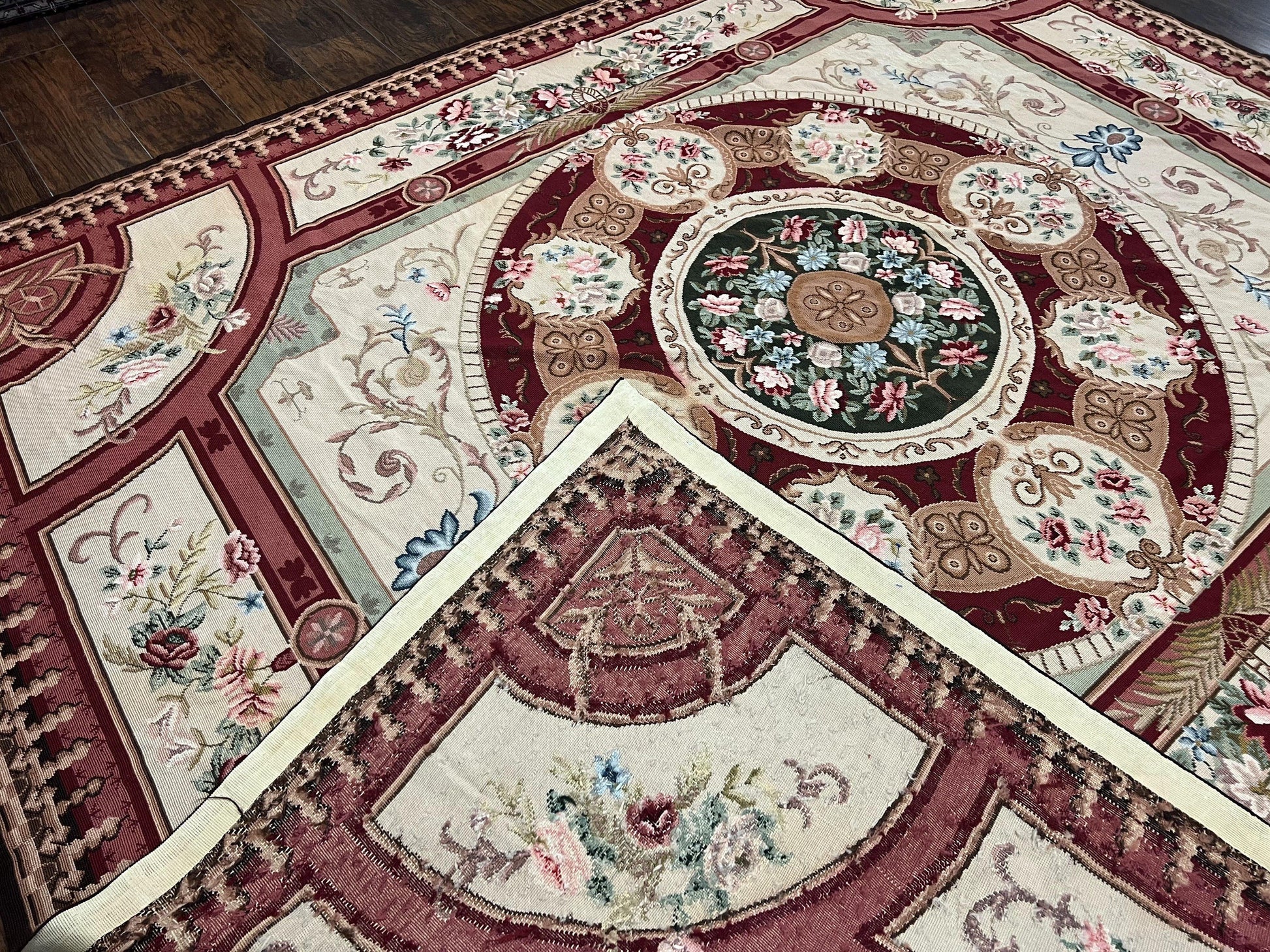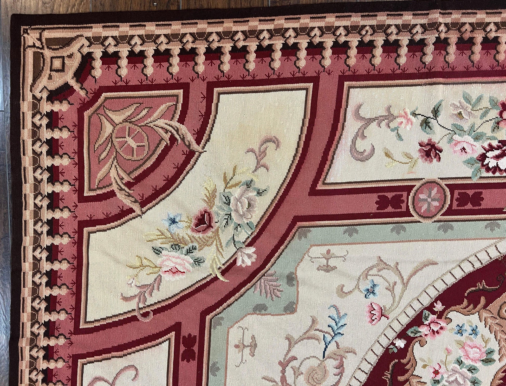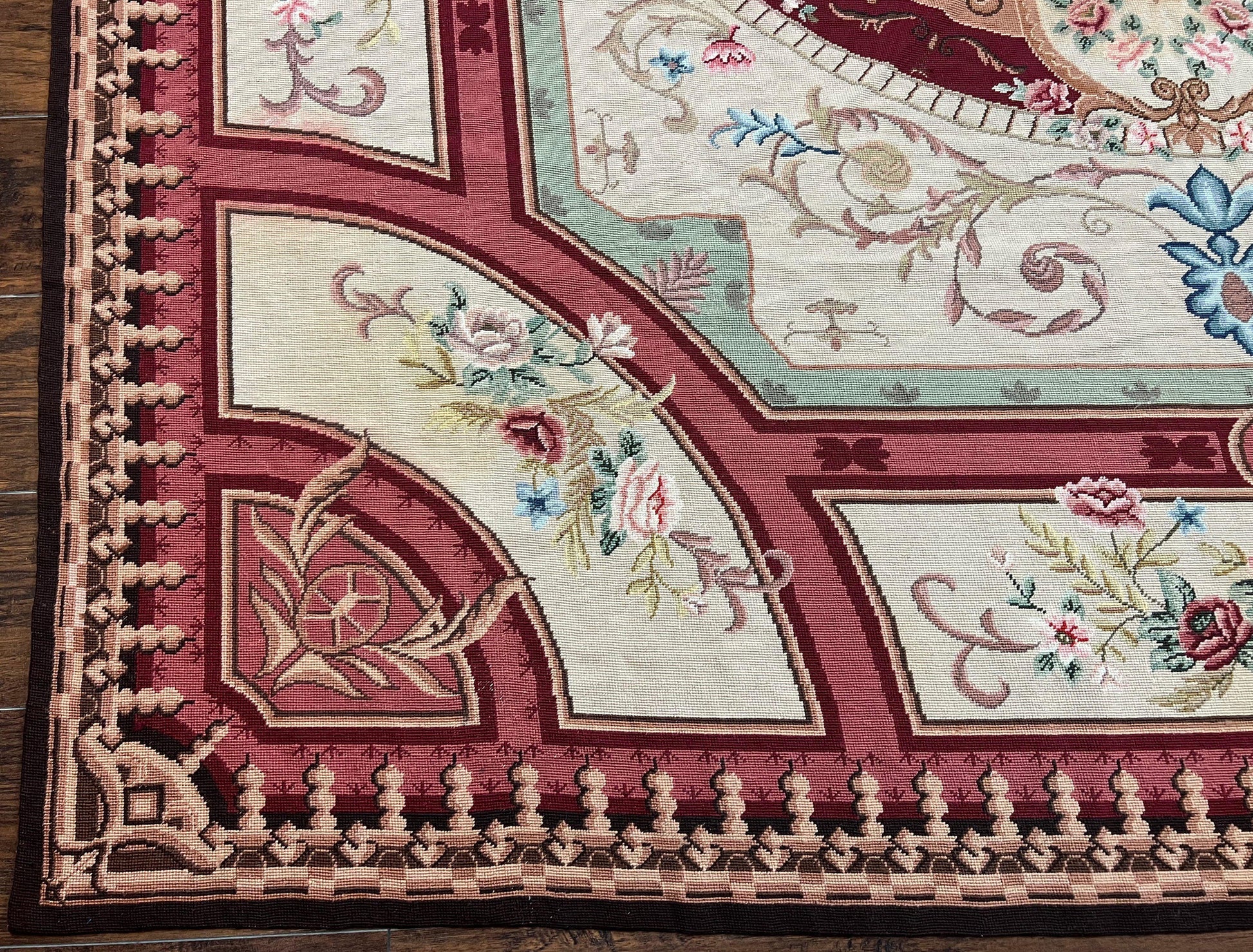 Needlepoint Rug 7.9 x 9, Beige Maroon Rose, Handmade Handwoven Flatweave Aubusson Savonnerie French European Elegant Carpet, Wool Rug