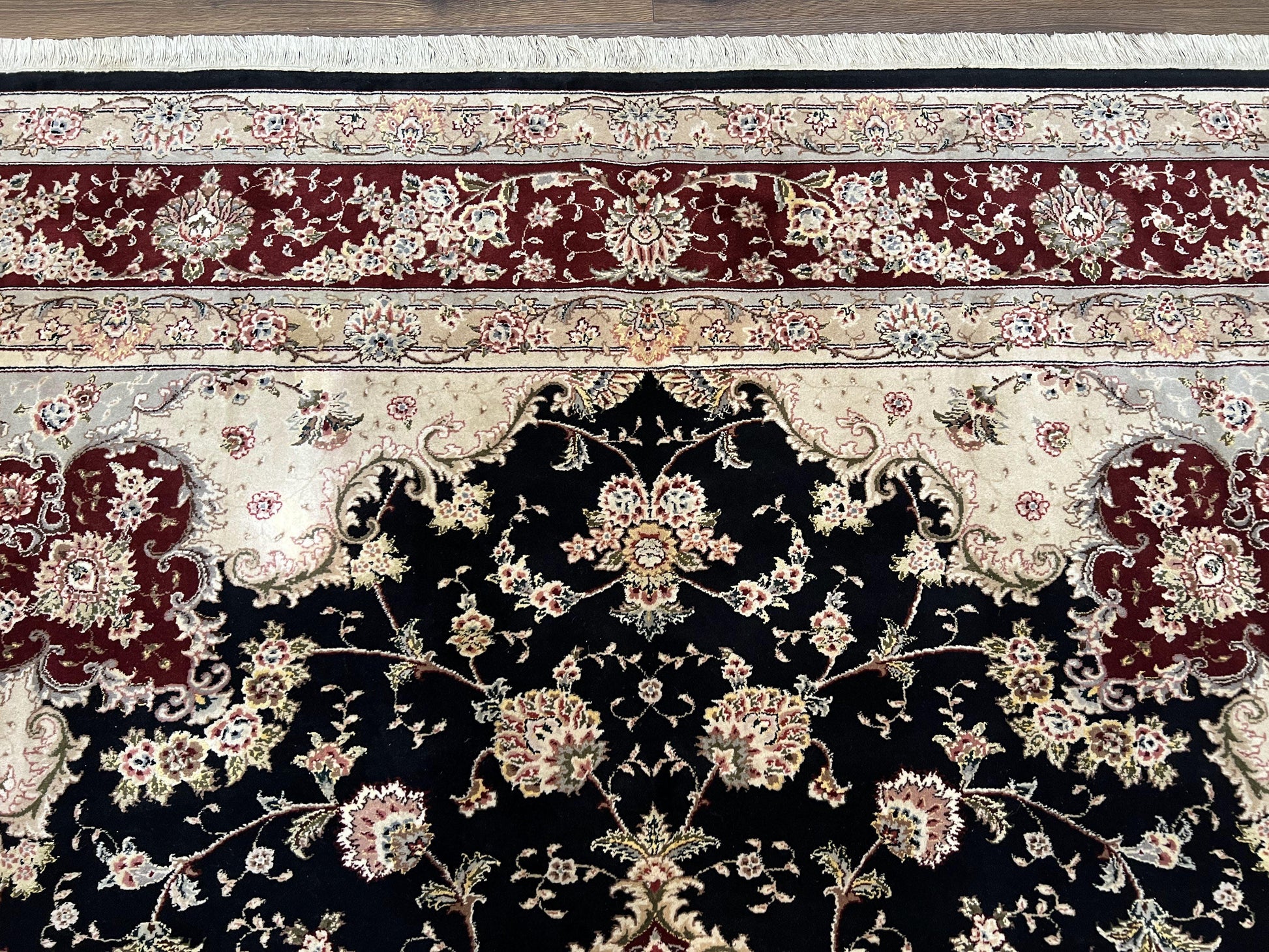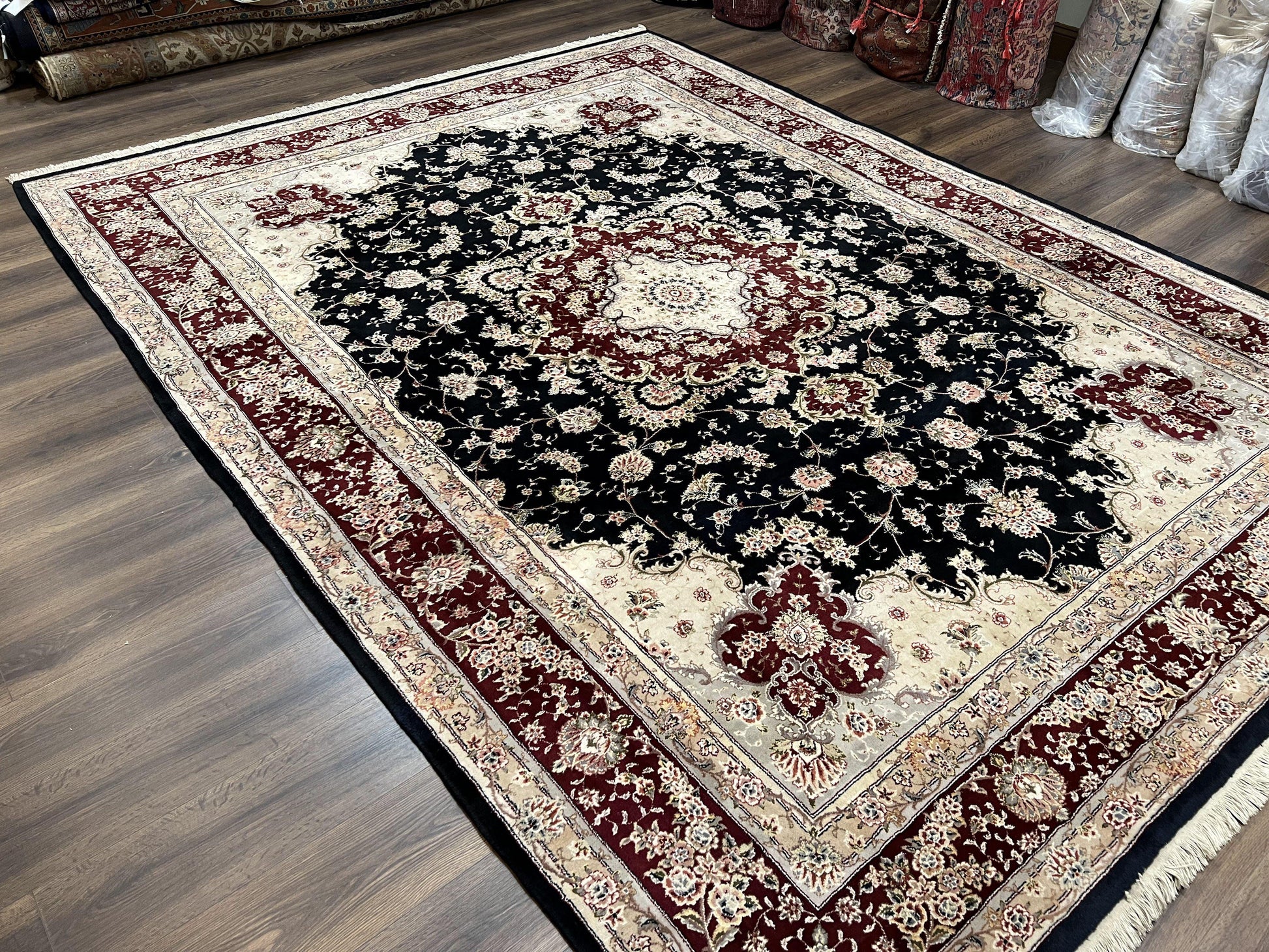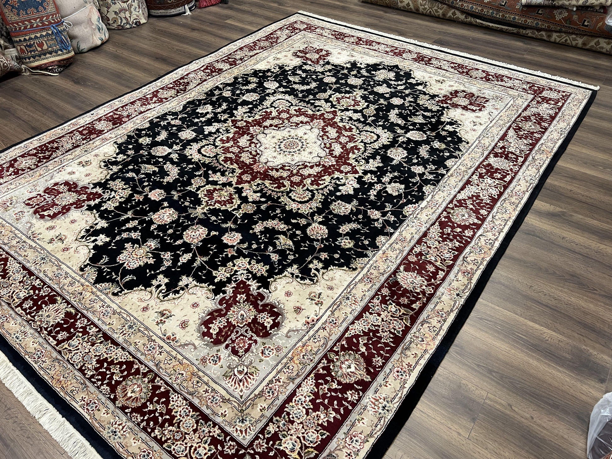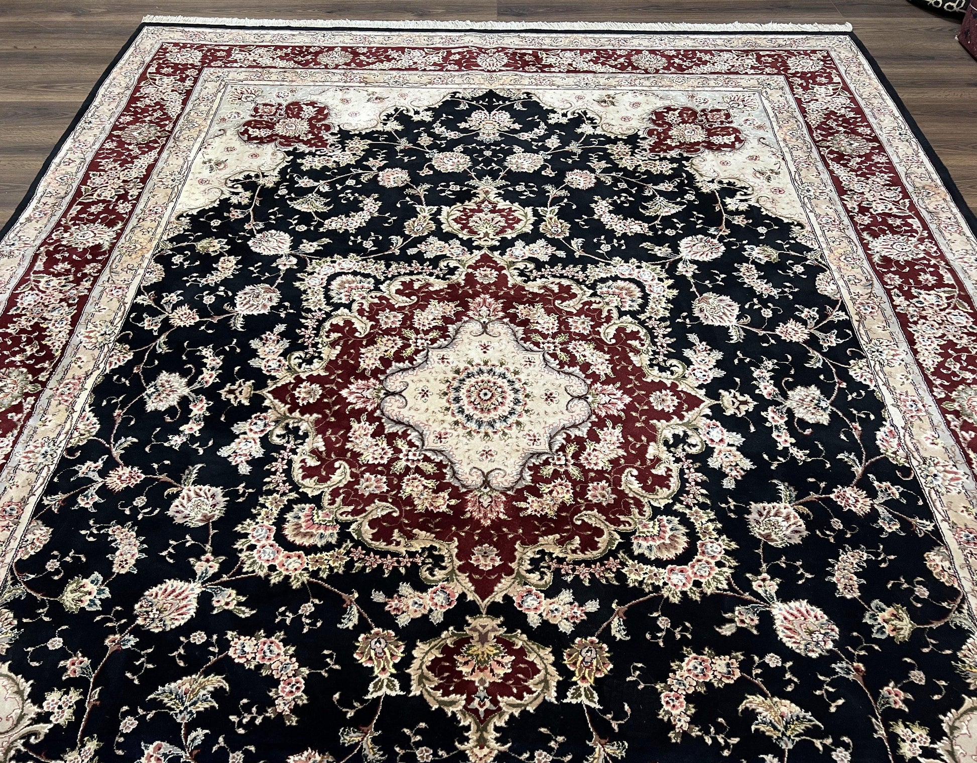 Pak Persian Rug 8.8 x 10.6, Floral Medallion, Wool and Silk Hand Knotted Fine Oriental Carpet, Elegant Rug, Black Gray Burgundy, Room Sized