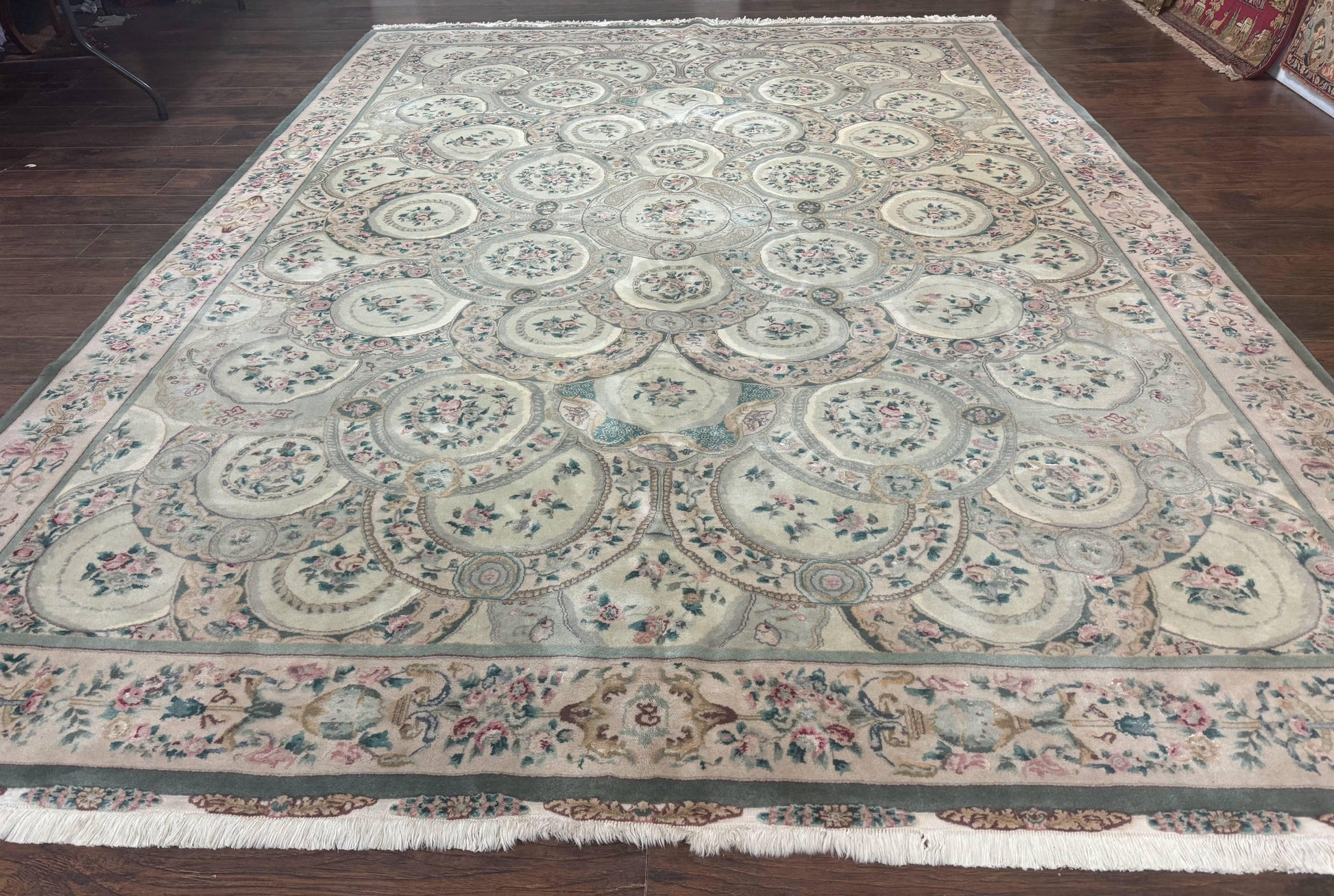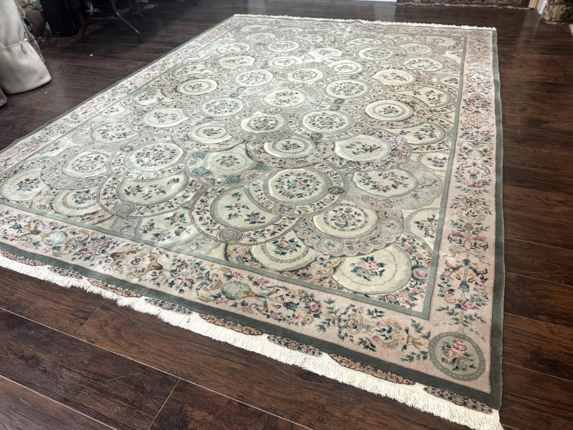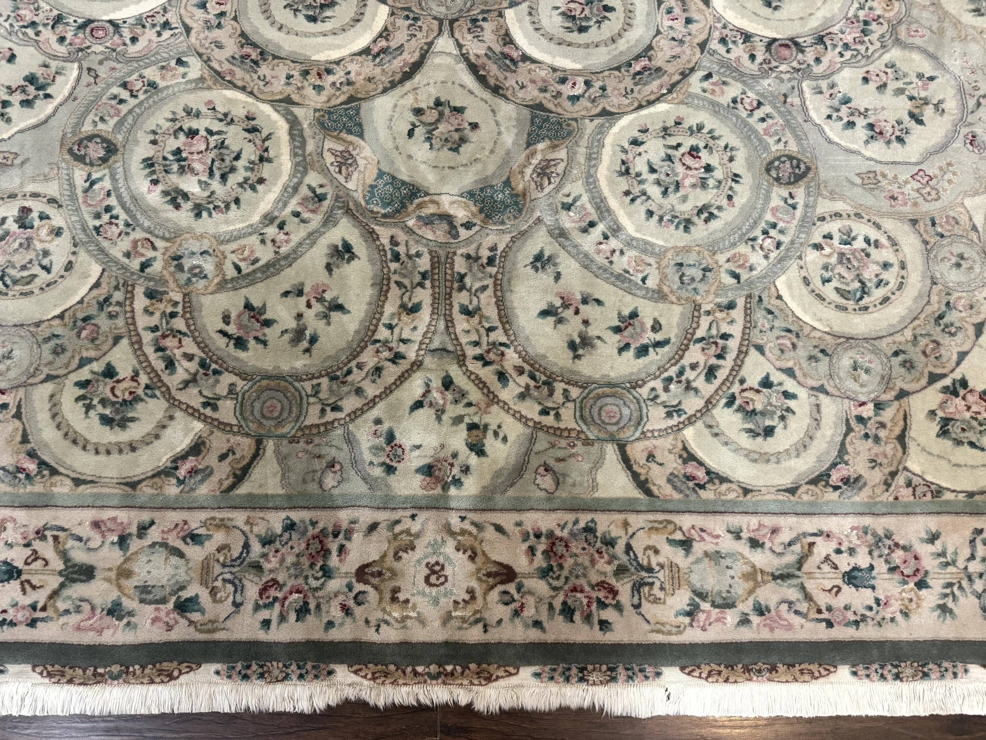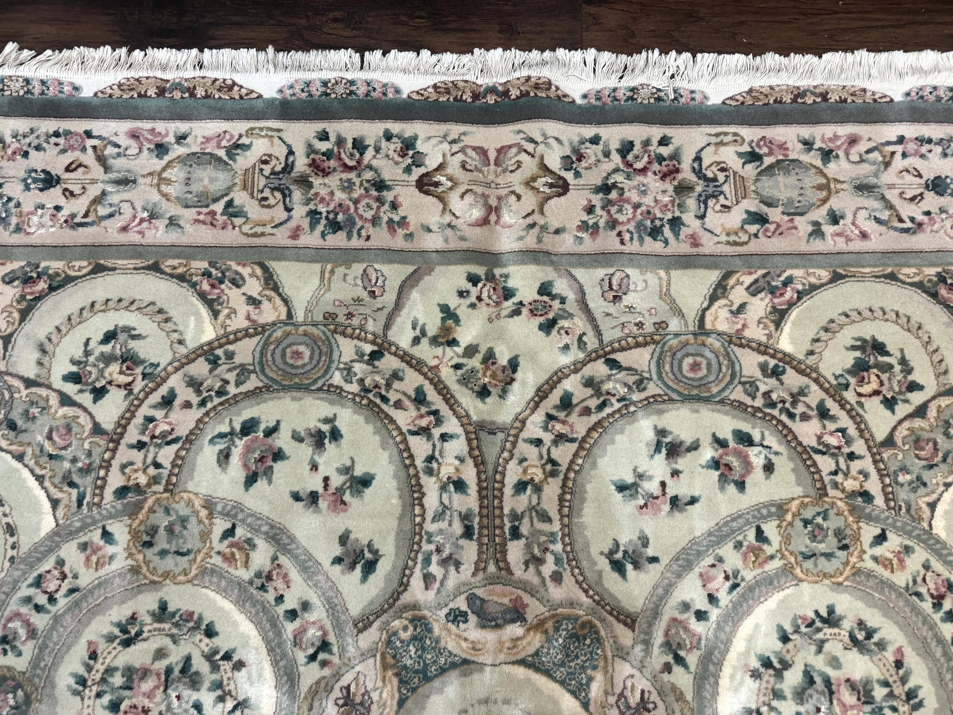 This Pak Persian Rug is a 9x12, vintage-inspired, hand-knotted masterpiece crafted in Pakistan. Featuring wool with silk highlights and a floral pattern in a soft green palette, it brings European-inspired elegance to any living space.