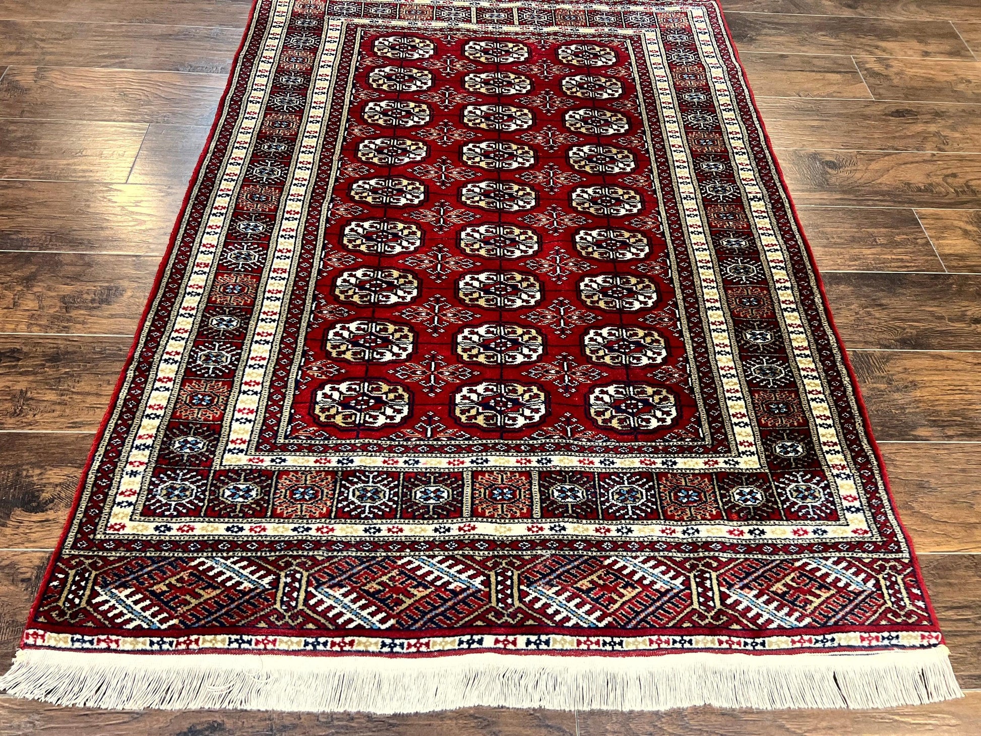 Pakistani Bokhara Rug 4x6, Red Turkoman Carpet, Finely Hand Knotted, Wool Vintage Rug