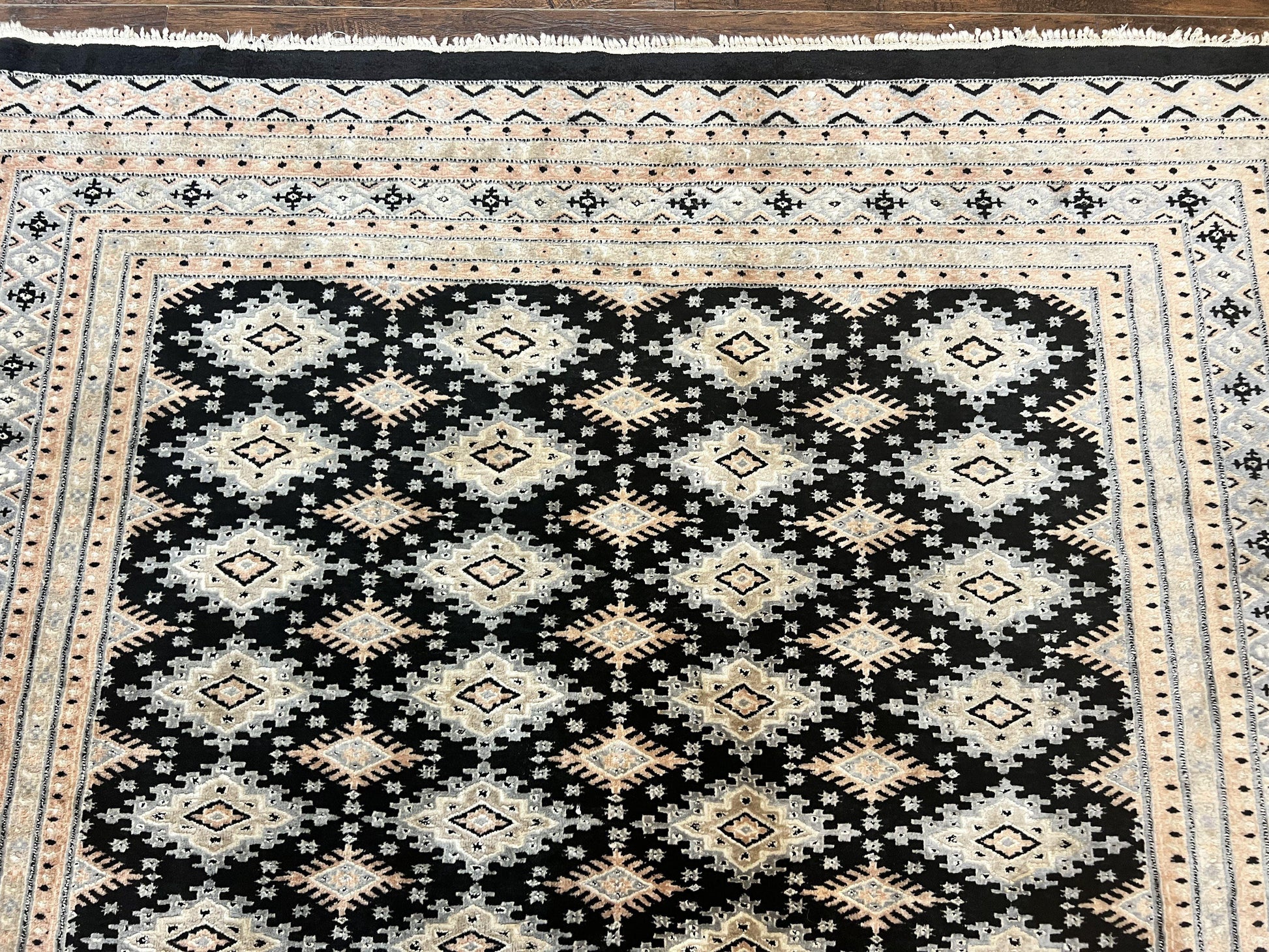 This Pakistani Bokhara rug is a vintage, hand-knotted wool carpet with silk highlights, crafted for spaces that deserve classic charm. Ideal for living rooms, bedrooms, or hallways, it brings timeless craftsmanship and warm character to any space.