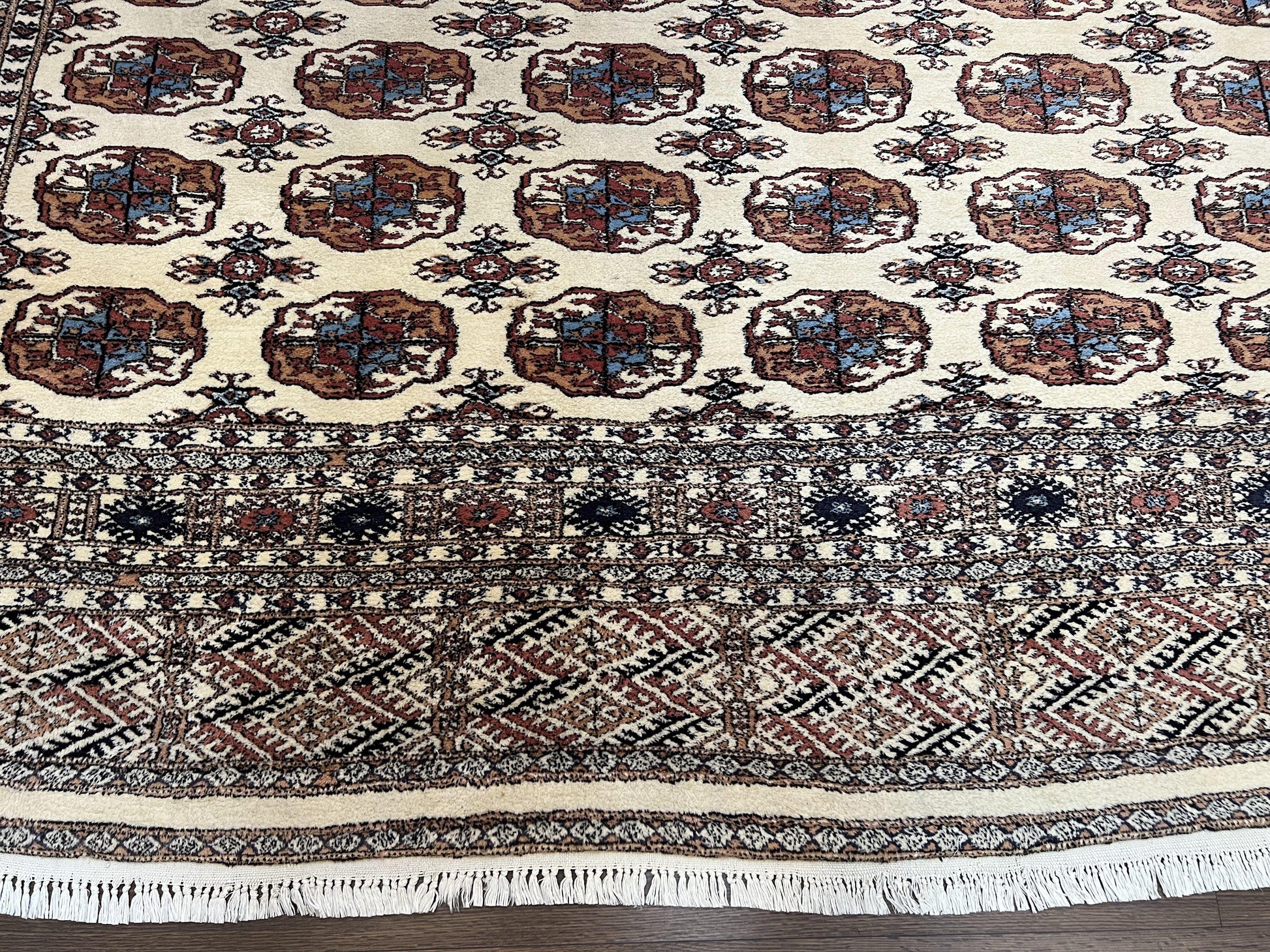 Pakistani Bokhara Rug 8x10, Traditional Turkoman Tribal Carpet, Allover Repeated Elephant Foot Motif, Ivory/Cream Black Red, Vintage Handmade