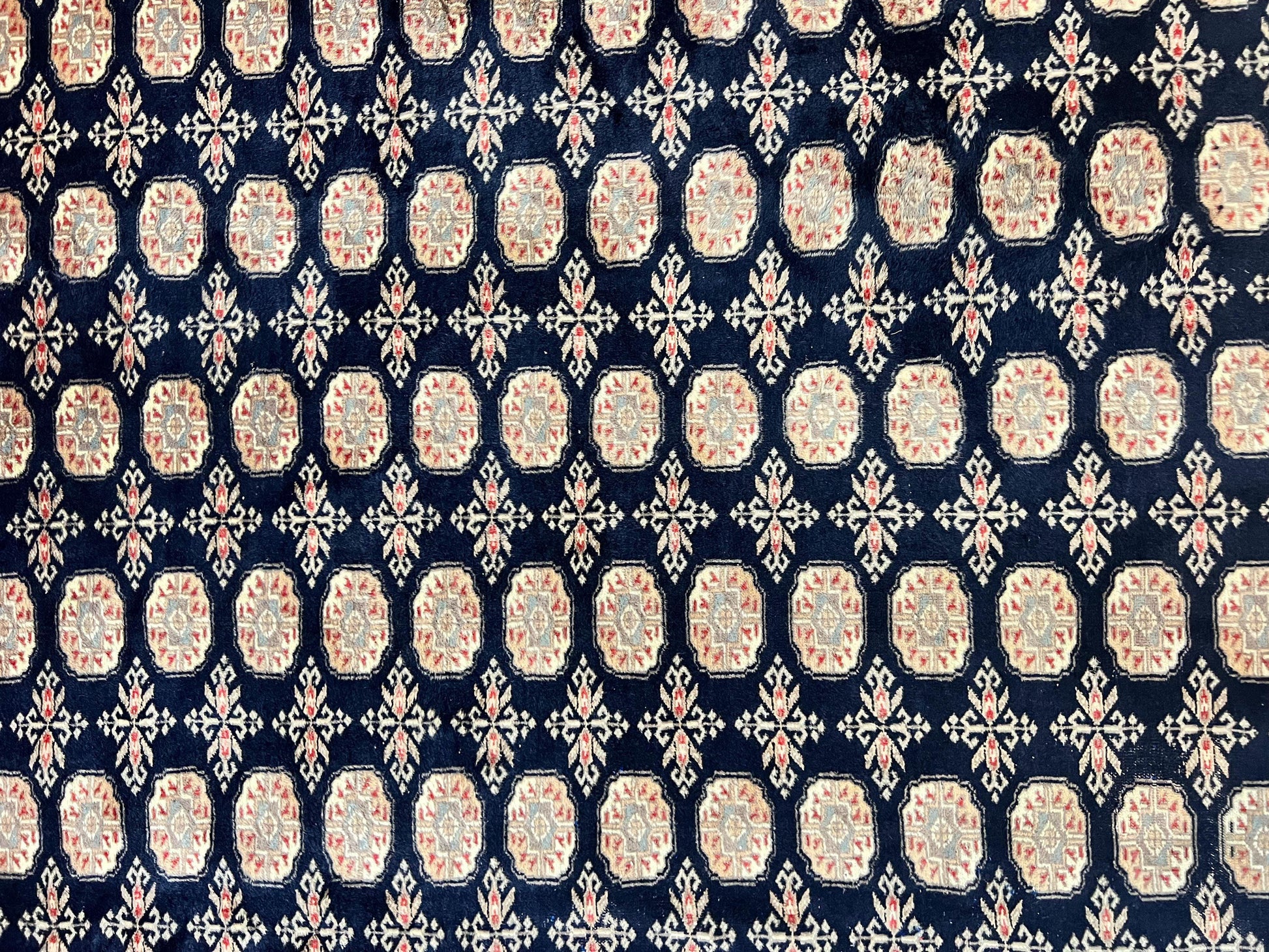 This vintage Pakistani Bokhara rug is a hand-knotted wool treasure that adds timeless character to any room. Designed for living spaces, bedrooms, or entryways, its Turkoman-inspired pattern in dark blue and beige delivers subtle sophistication and durable comfort.