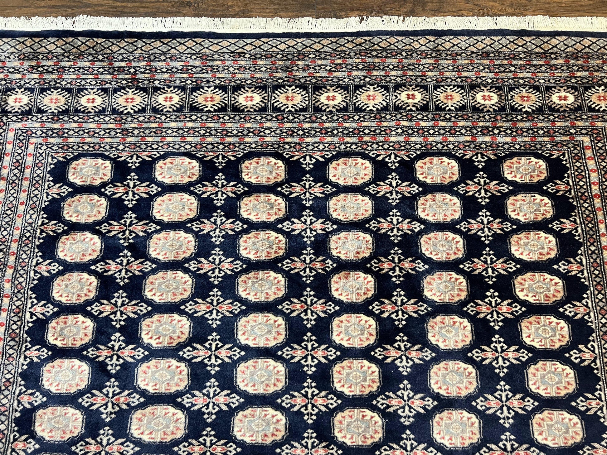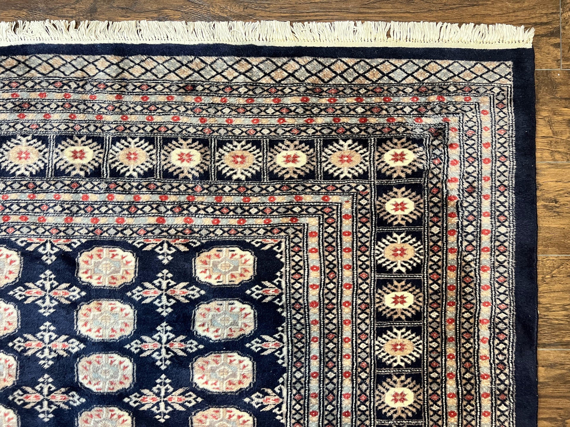 Pakistani Bokhara Rug 8x10 Hand Knotted Wool Vintage Carpet in Dark Blue Beige