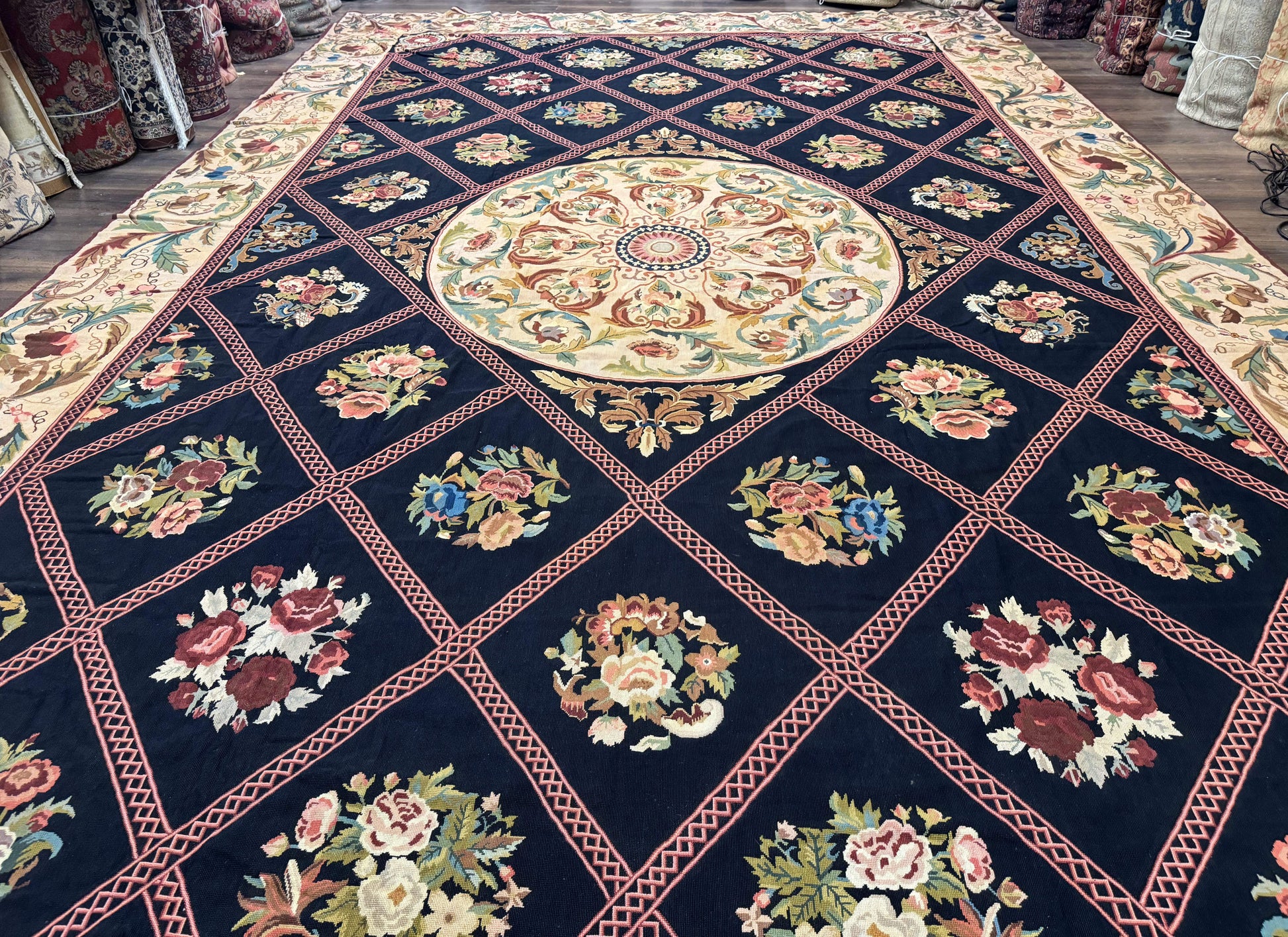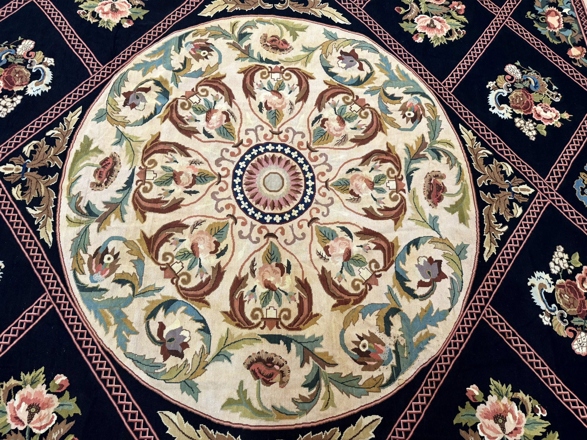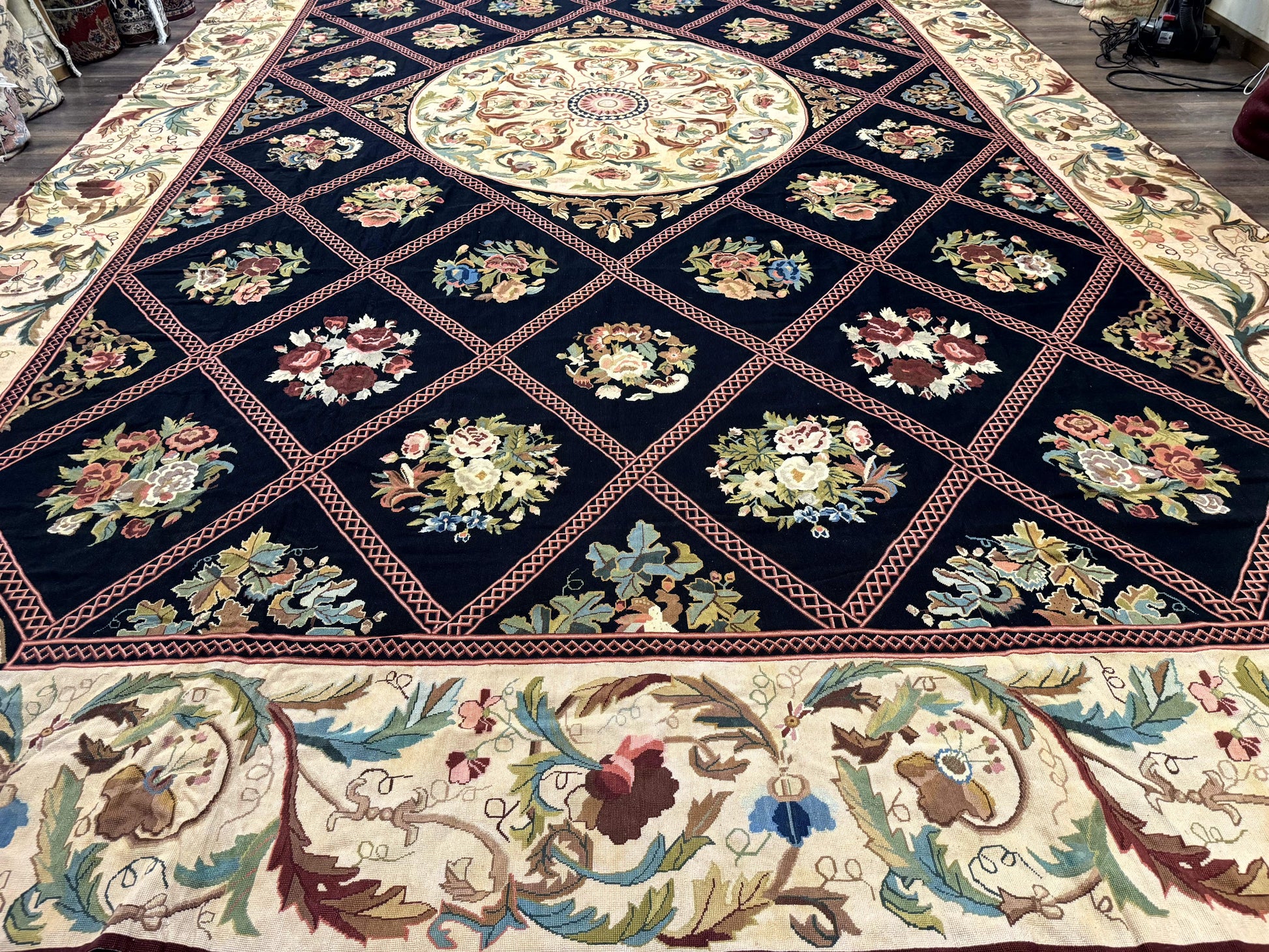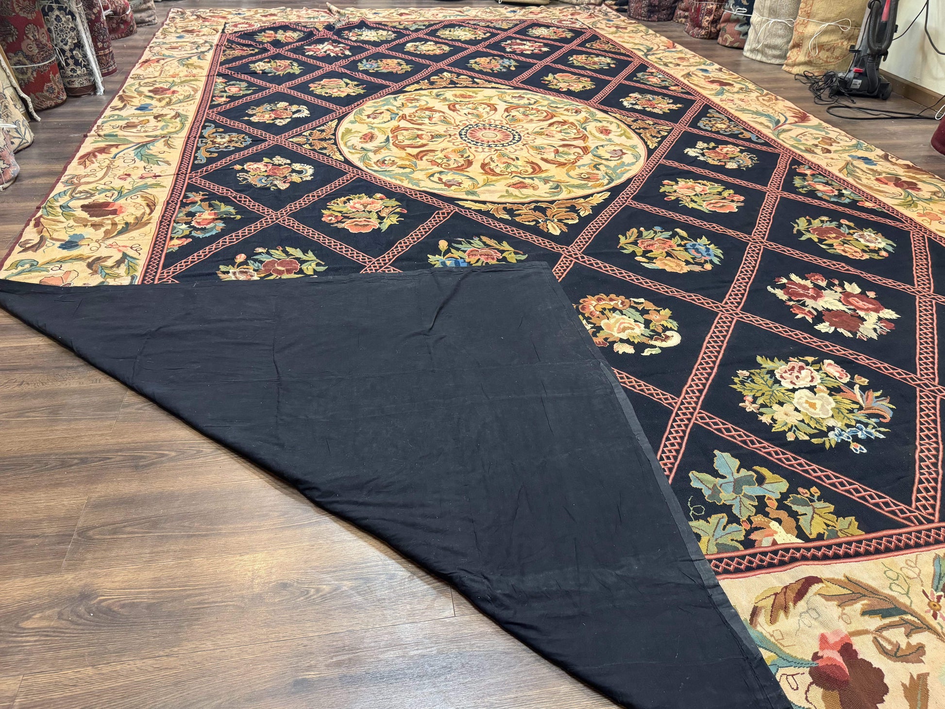 Palace Size Needlepoint Rug 12x20, European French English Aubusson Floral Design, Black and Beige