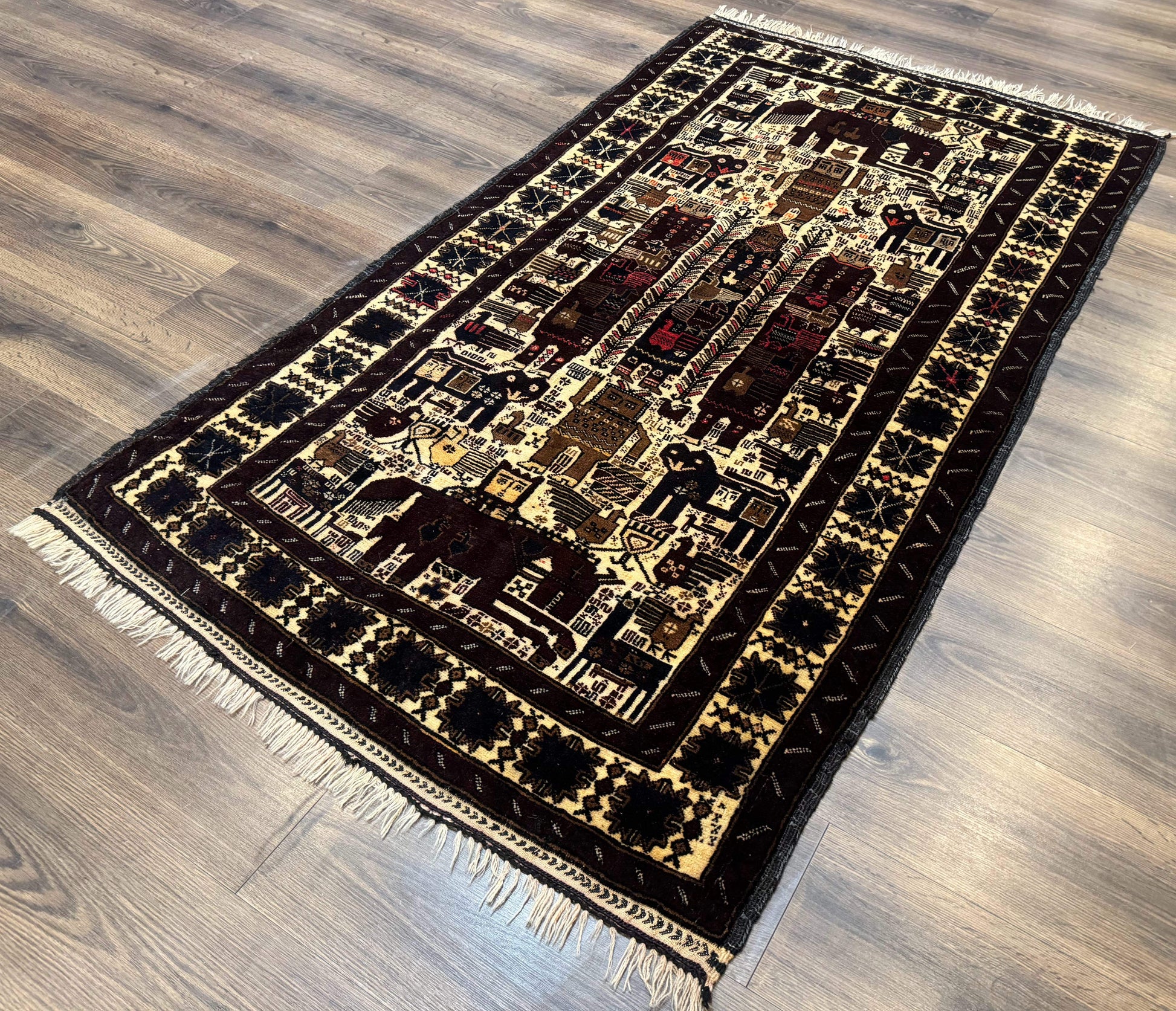 This vintage 4x6 Persian Baluch rug is a compelling example of tribal pictorial weaving, featuring a densely packed field of human, animal, and village motifs. Rendered in a rich palette of ivory, navy, and deep brown, the rug captures scenes of daily life and stylized architecture with a folkloric charm. Flanked by symmetric borders filled with geometric floral devices, it showcases remarkable storytelling and cultural depth. At approximately 3'7" x 6'2", it is an ideal size for an accent space, hallway, or entry, inviting viewers into a vibrant tableau of nomadic heritage.