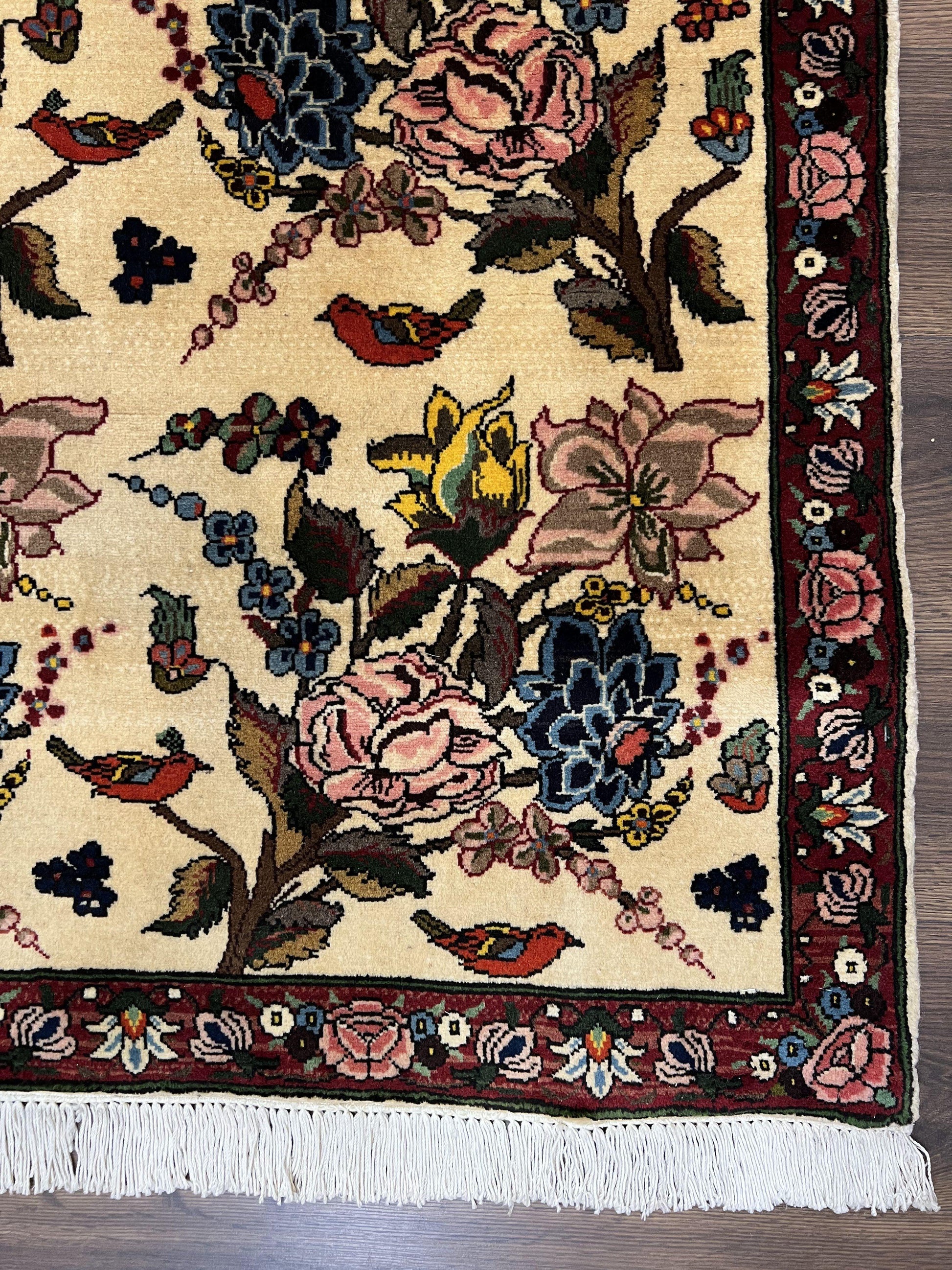 A vintage Persian Bidjar rug hand-knotted in wool, sized 3'6" x 5', featuring repeated floral motifs with roses and birds. This cream and burgundy rug brings timeless elegance and authentic craftsmanship to living rooms, bedrooms, or entryways.
