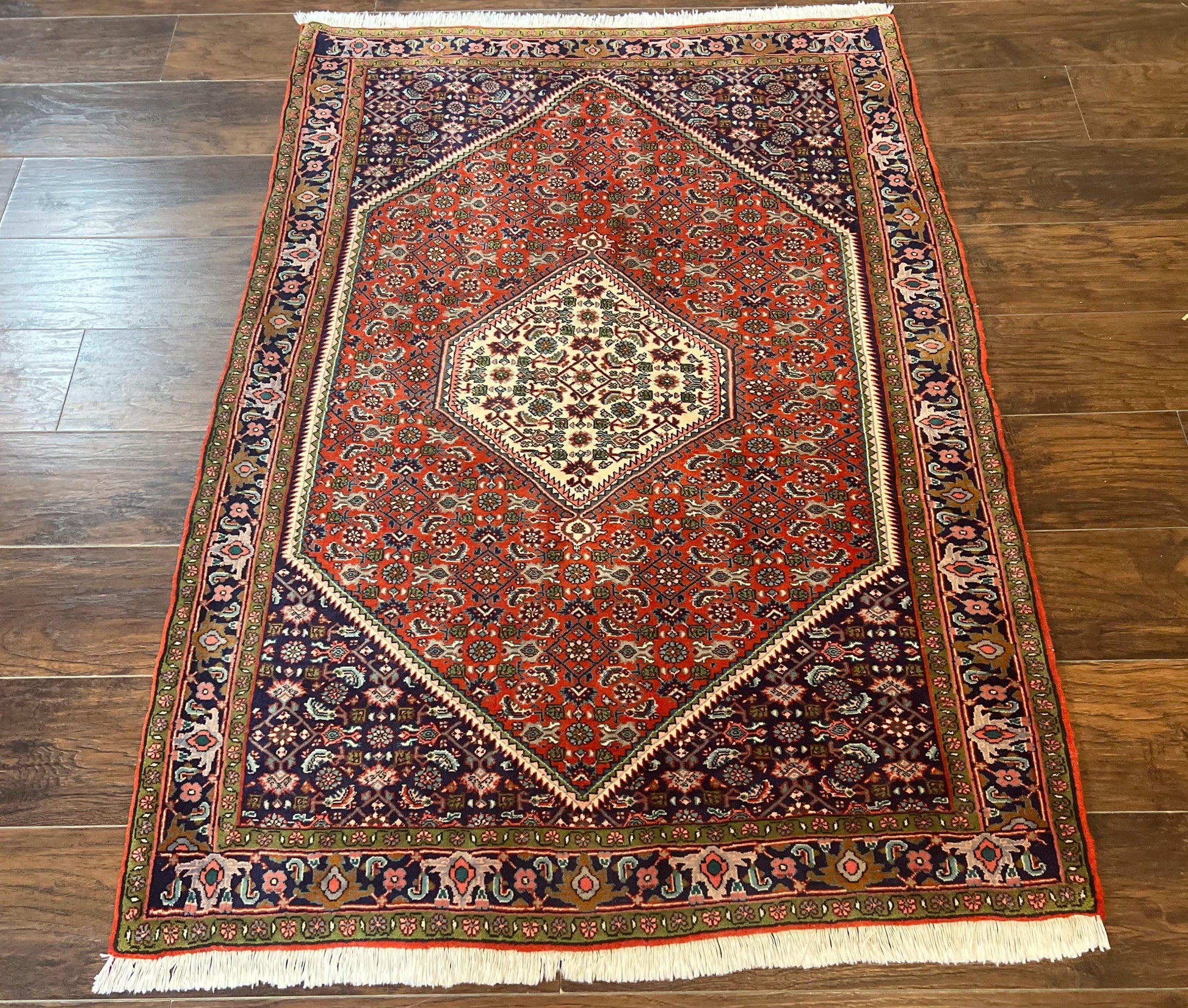 Persian Bidjar Rug 4x5, Finely Hand Knotted Vintage Carpet, Red and Navy Blue, Handmade Wool Rug, 180 KPSI