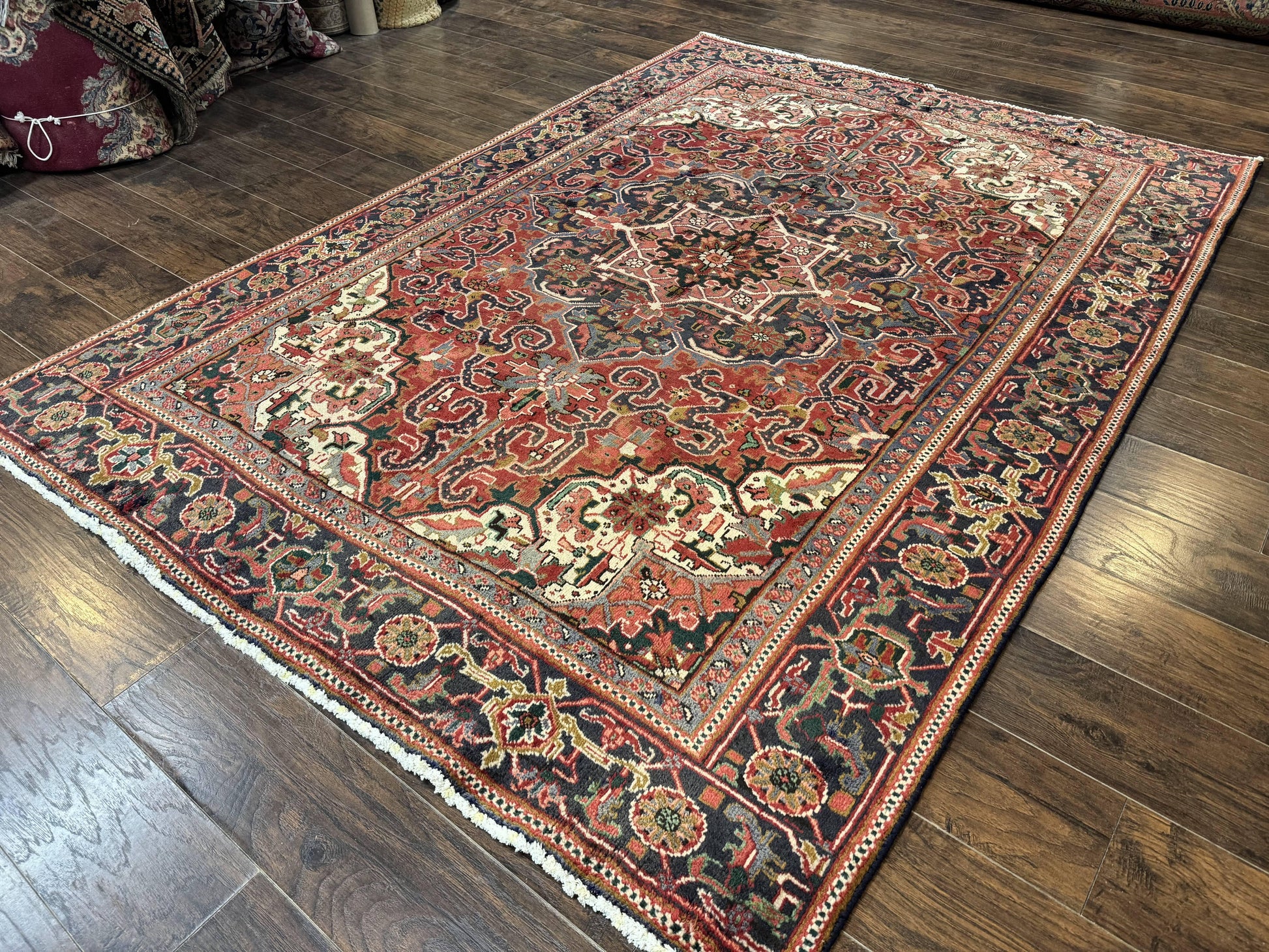 This vintage Persian Heriz rug, measuring 6'6" x 9'3", showcases a powerful geometric medallion design with strong angular motifs and crisp outlines. The composition is centered around a bold multi-lobed medallion, flanked by dramatic ivory corner spandrels that provide vivid contrast against the richly variegated brick red and navy field. The serrated floral forms and stylized vines add a structured dynamism throughout, while the thick borders frame the piece with a robust presence. Durable and visually impactful, this Heriz makes an ideal statement rug for a living room, library, or office.
