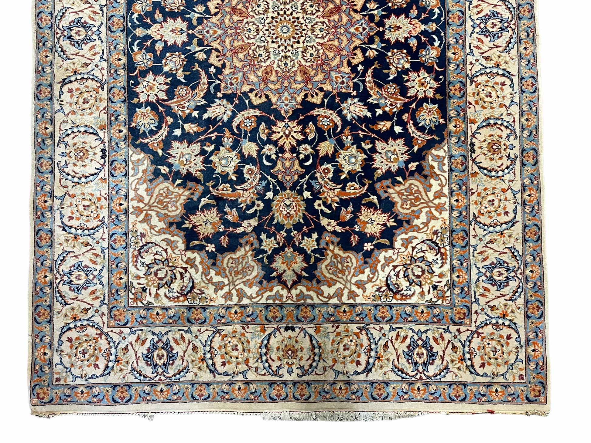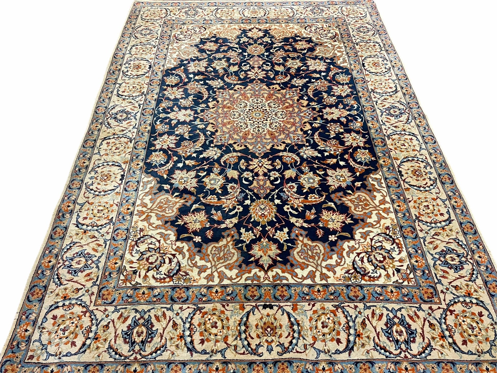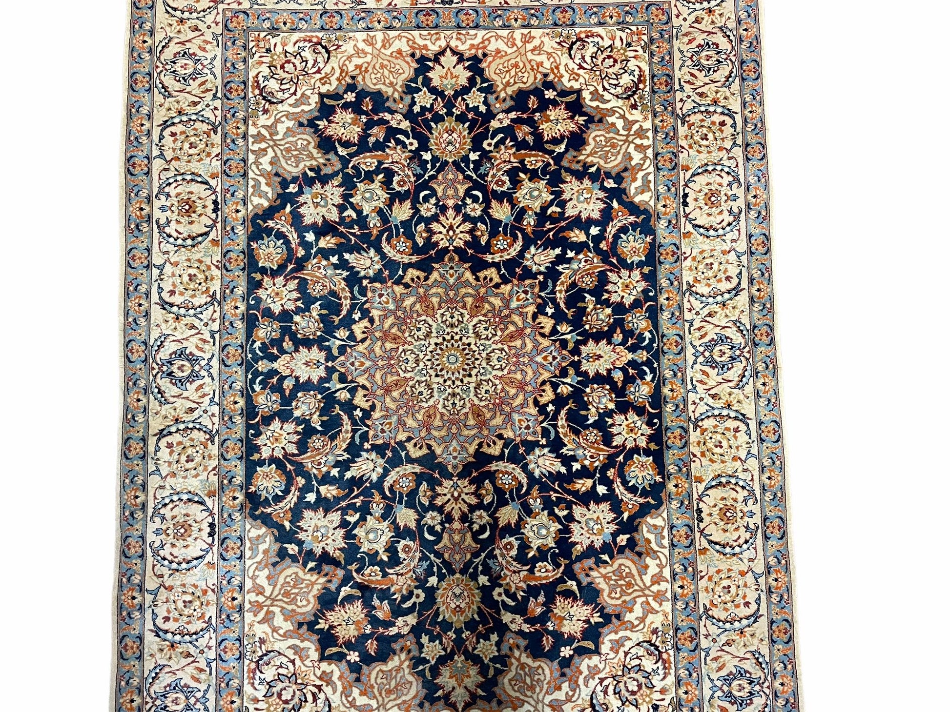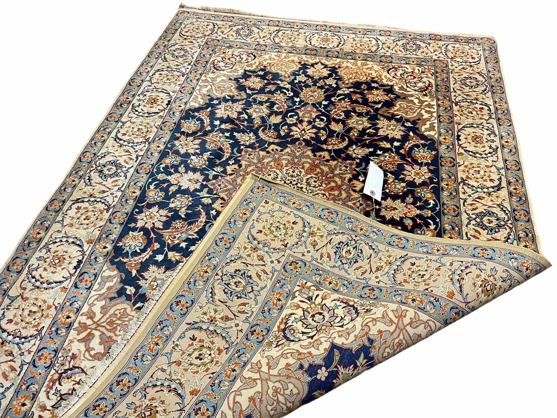 Persian Isfahan Rug 4x5 Navy Blue Ivory Wool Silk Highlights Hand Knotted