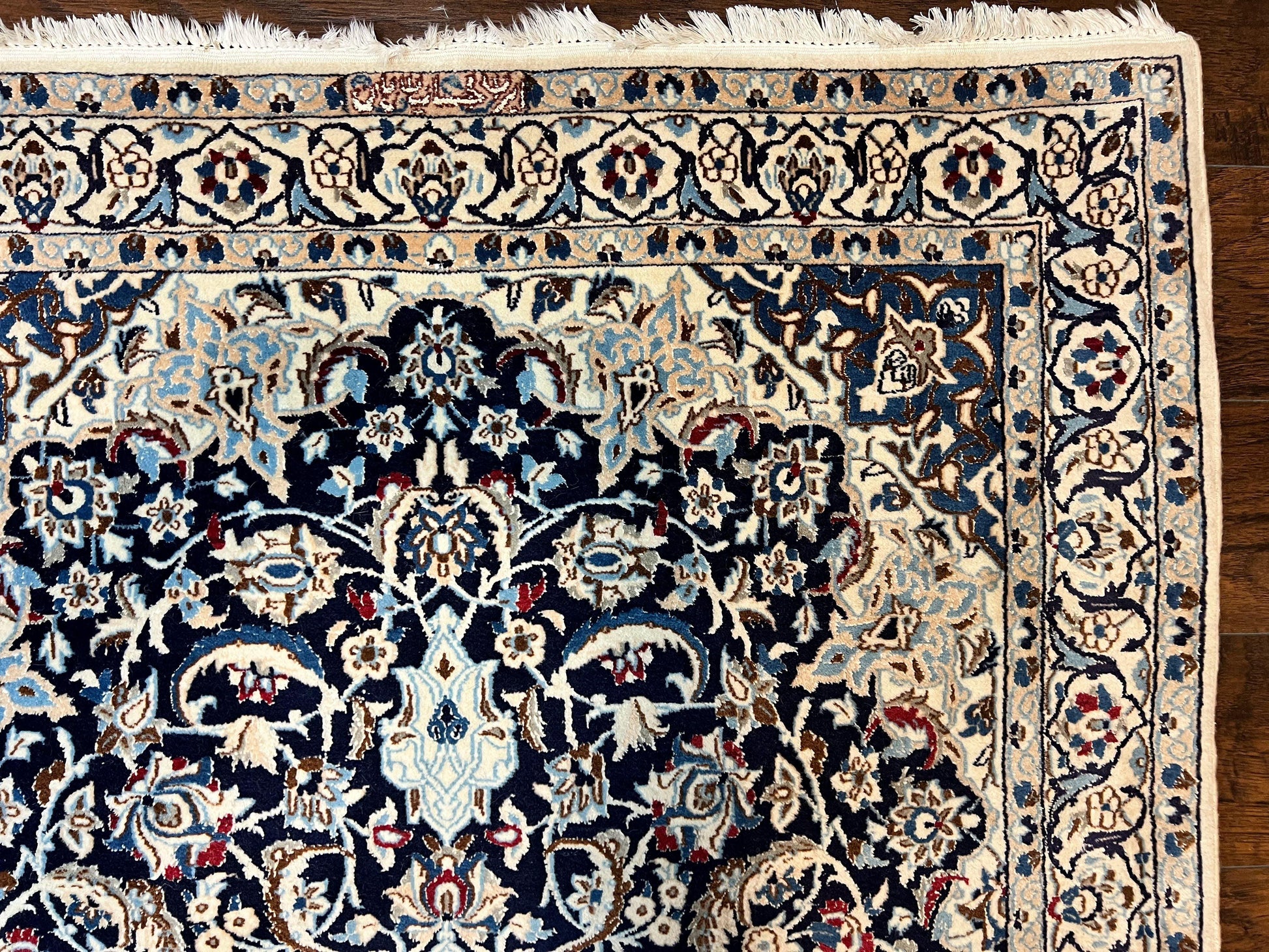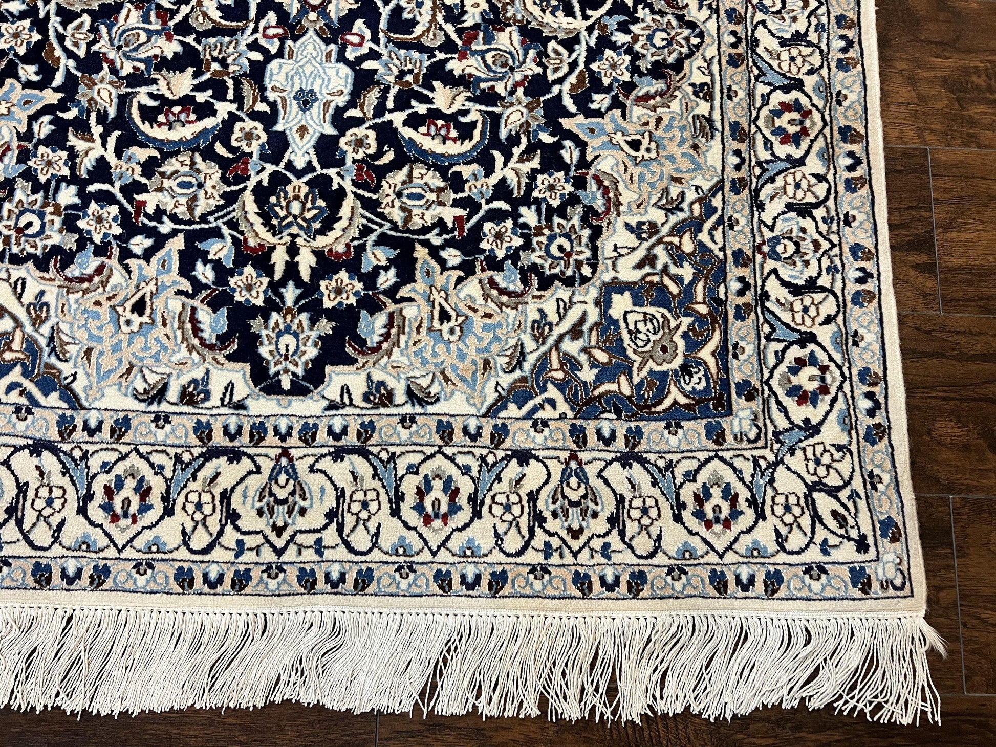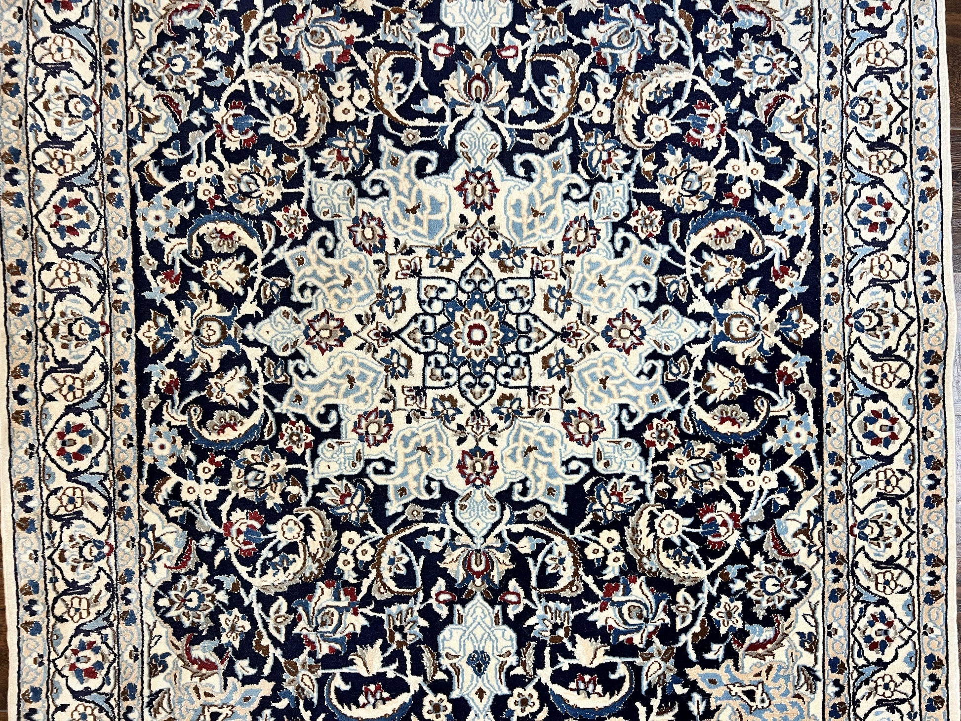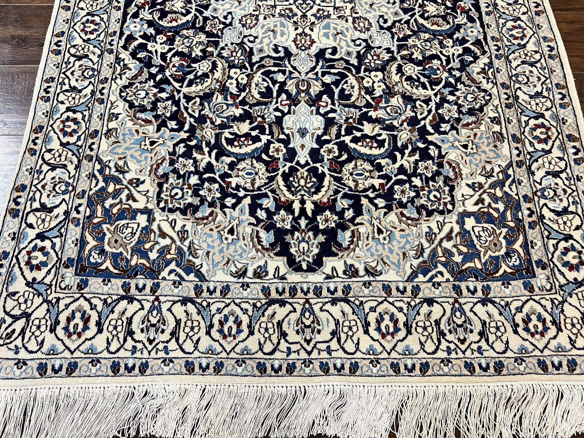 Persian Nain Rug 4x6, Floral, Hand Knotted Vintage Wool & Silk Highlights, Signature from Masterweaver, Navy Blue and Ivory