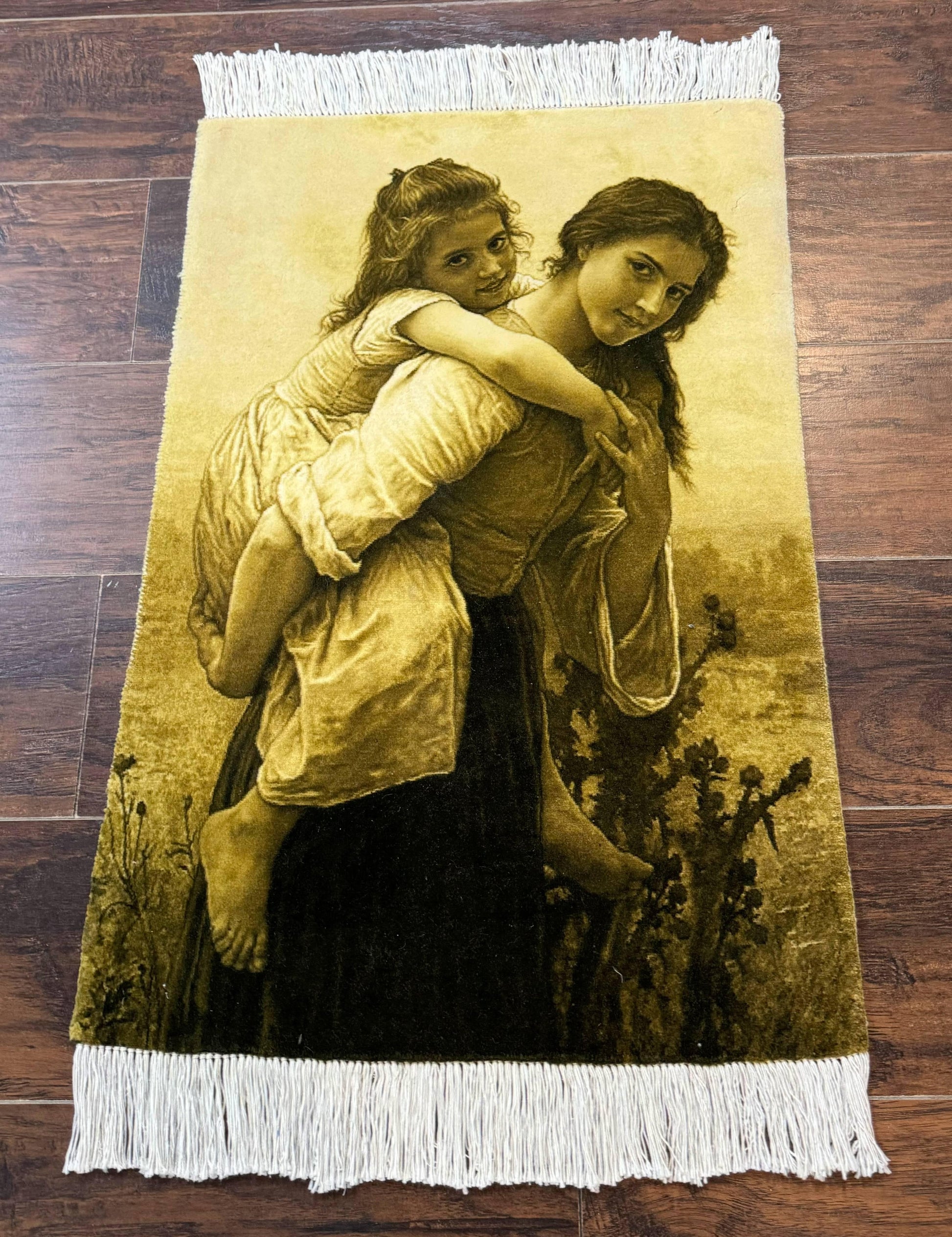 This piece is best appreciated as a woven artwork, ideal for use as a wall hanging. With an extraordinary 380 KPSI, it functions more like a painting in textile form compared to a traditional floor covering. The masterful craftsmanship captures the nuance and emotion of a European-style portrait—every detail, from the girl's expression to the folds of the garments, is rendered with remarkable clarity. The sepia-toned palette enhances its classical feel, making it a striking decorative centerpiece for any space.