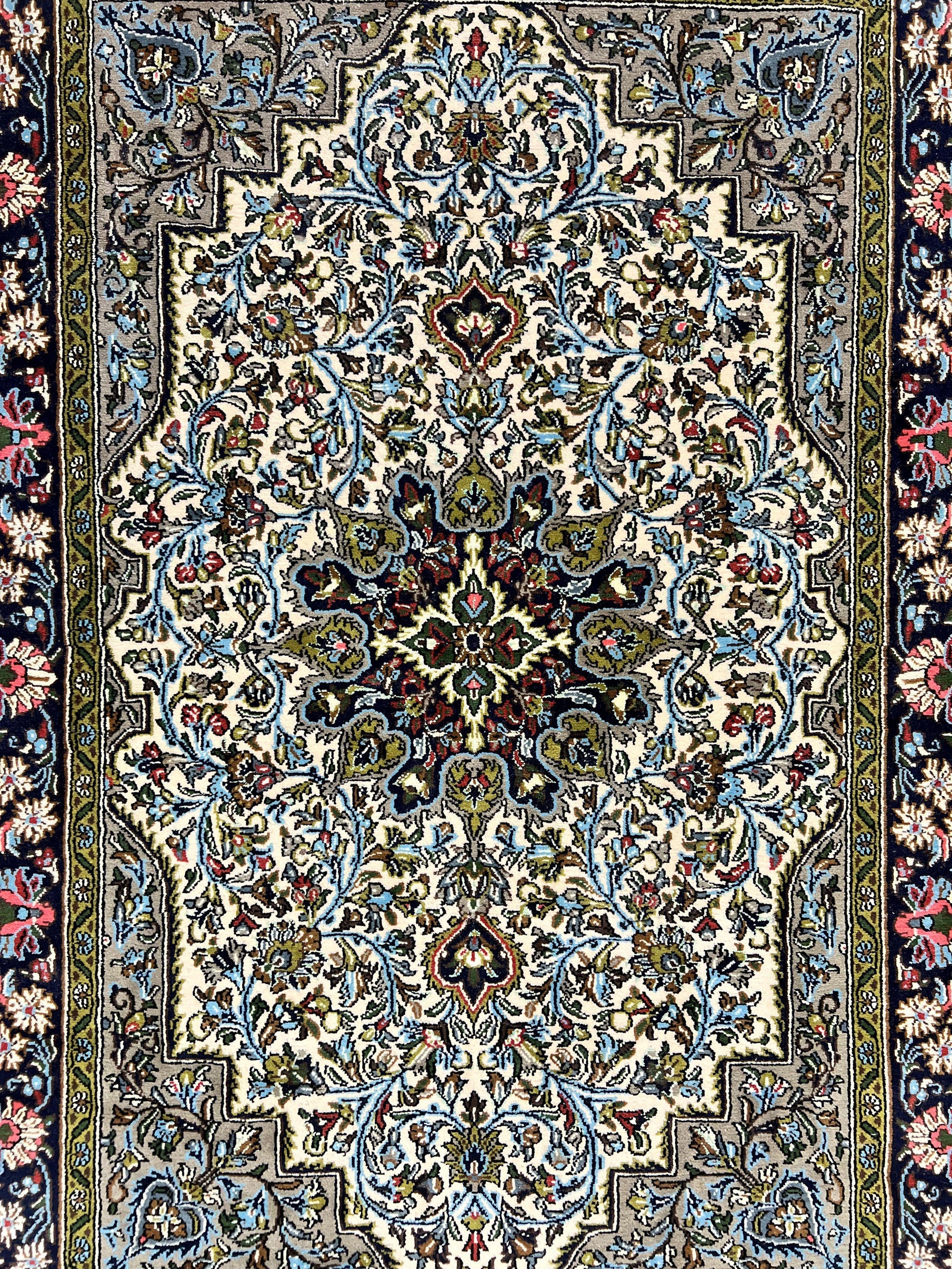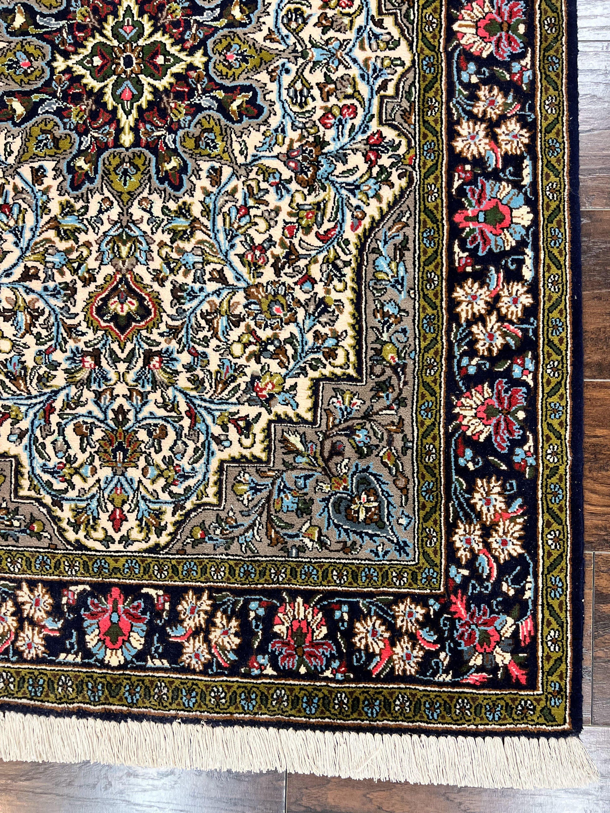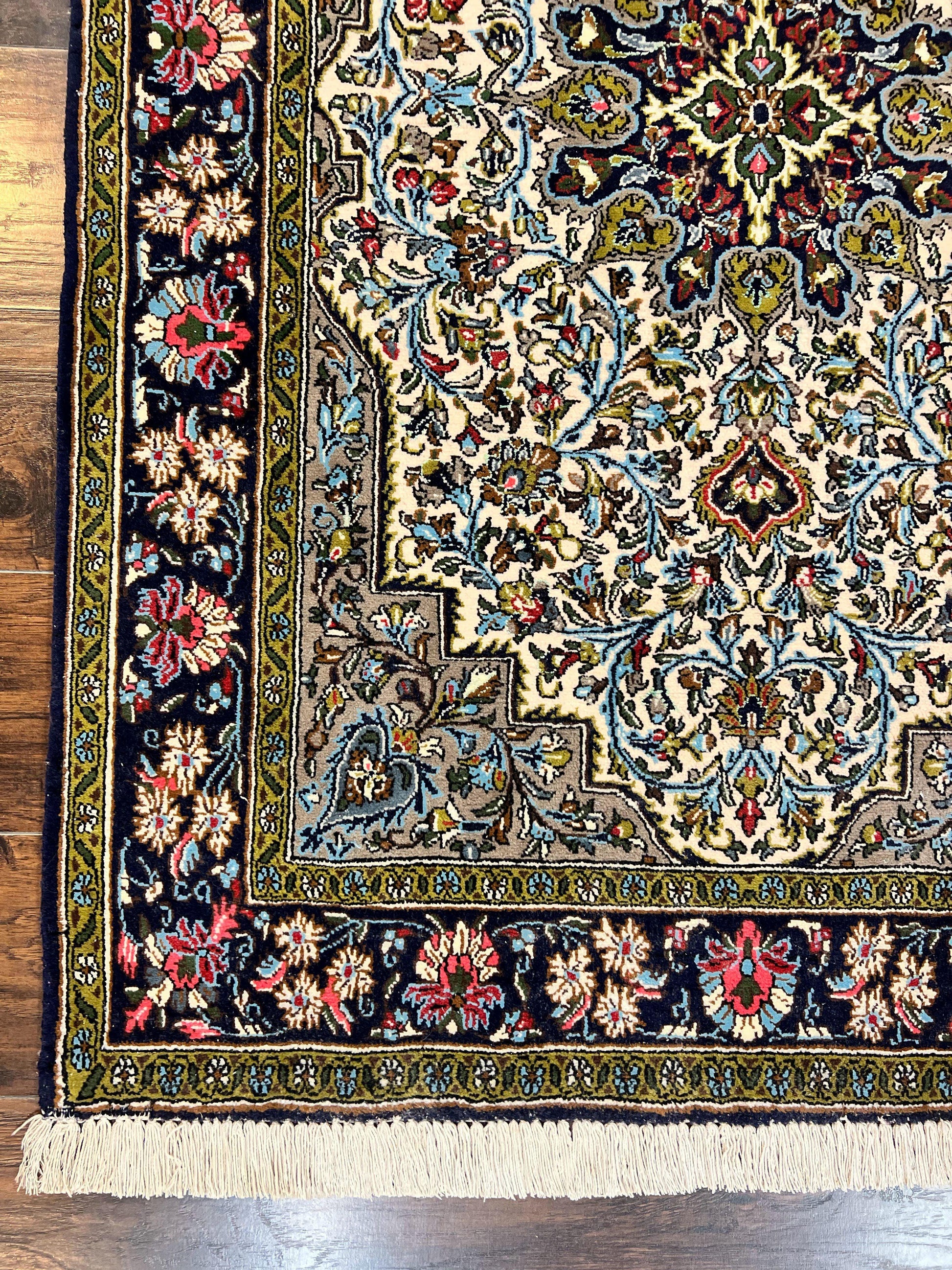 Persian Qum Rug 3x5, Wool with Silk Highlights, Handmade Semi Antique Carpet, Ivory & Navy Blue, Floral Medallion, Finely Hand Knotted