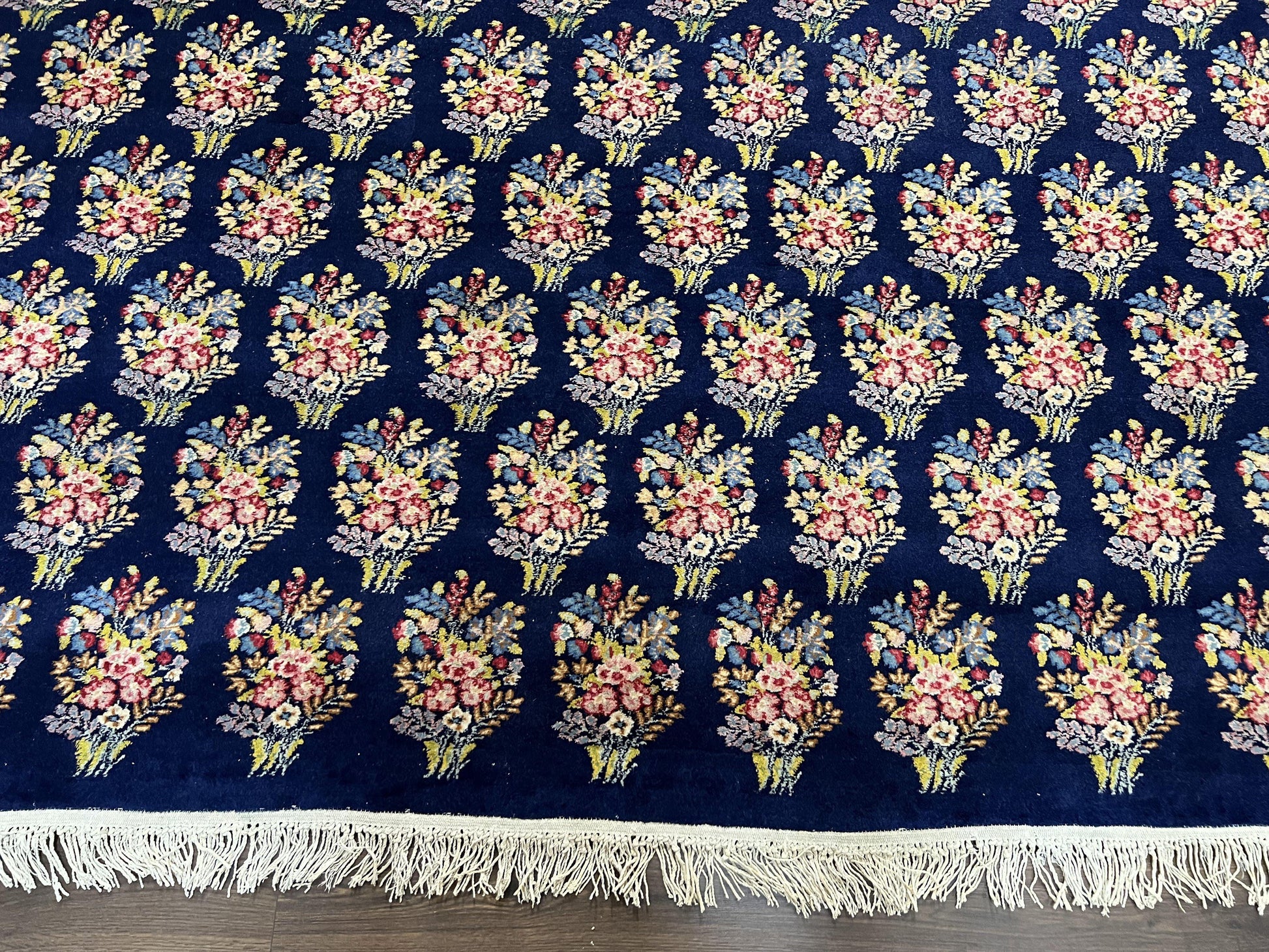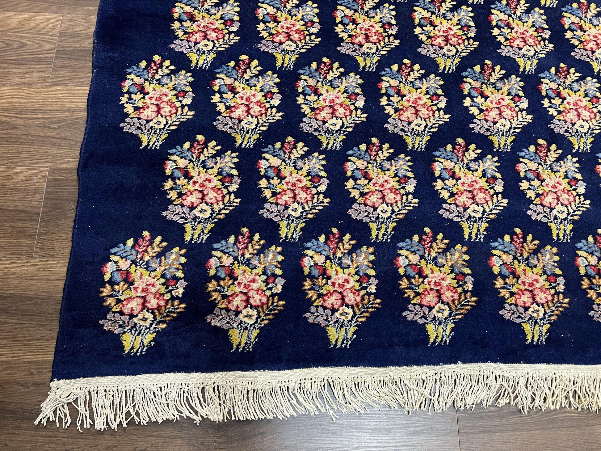 Persian Rug 9x12, Authentic Hand Knotted Carpet, Repeated Floral Motif Garden of Eden, Navy Blue Wool Rug 9 x 12, Semi Antique Kirman Rug