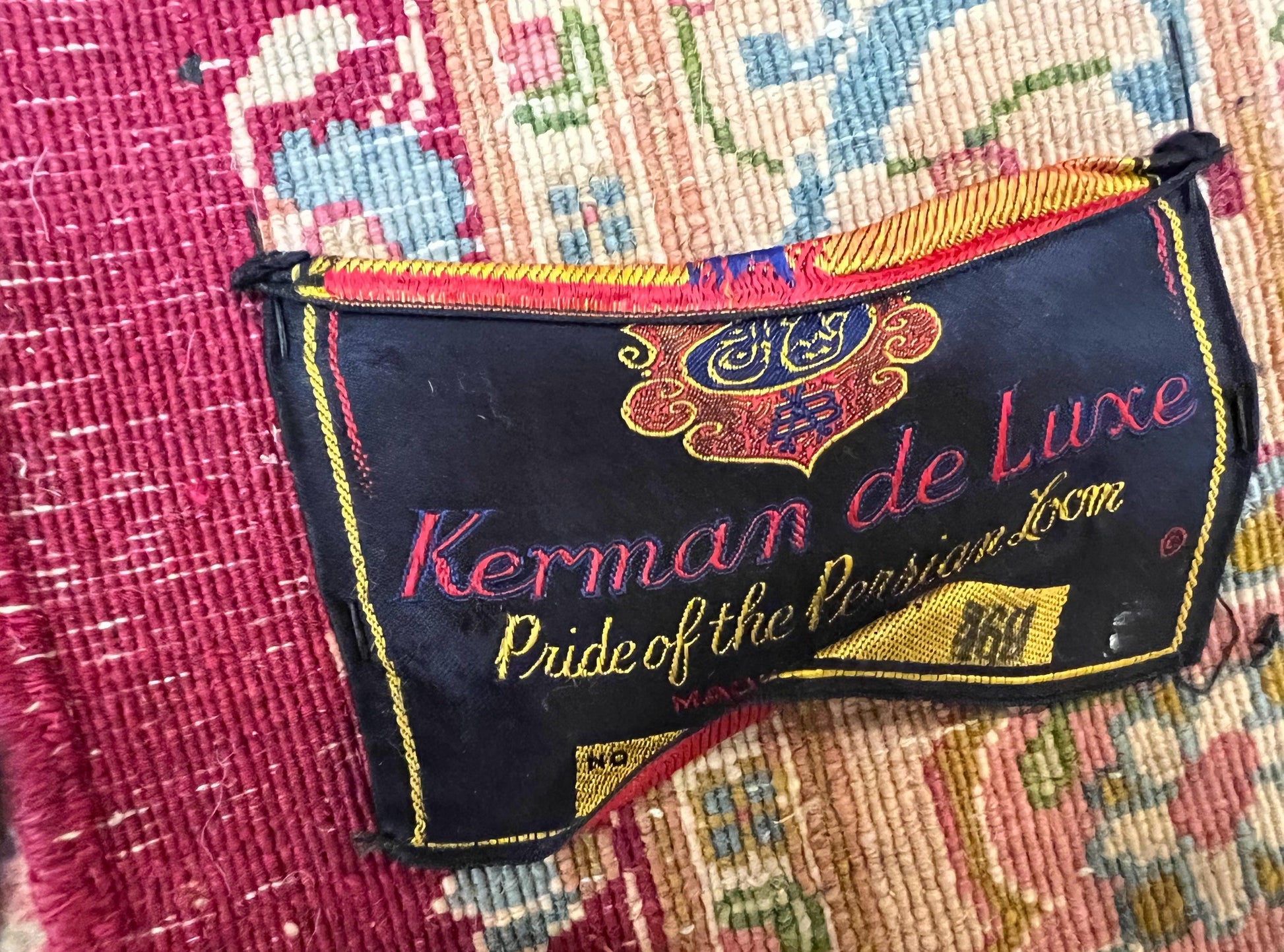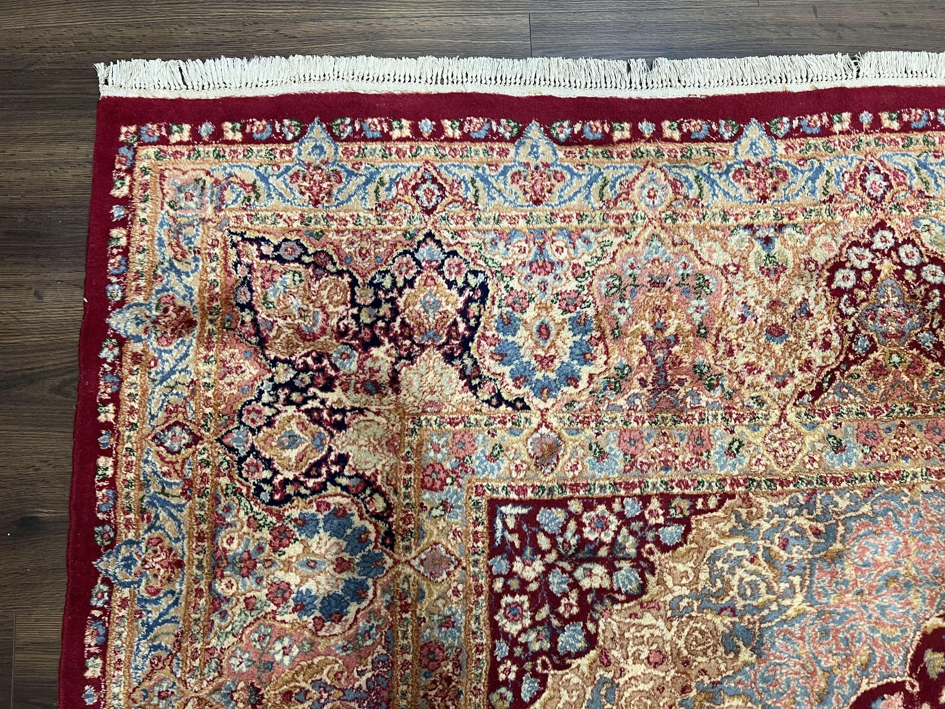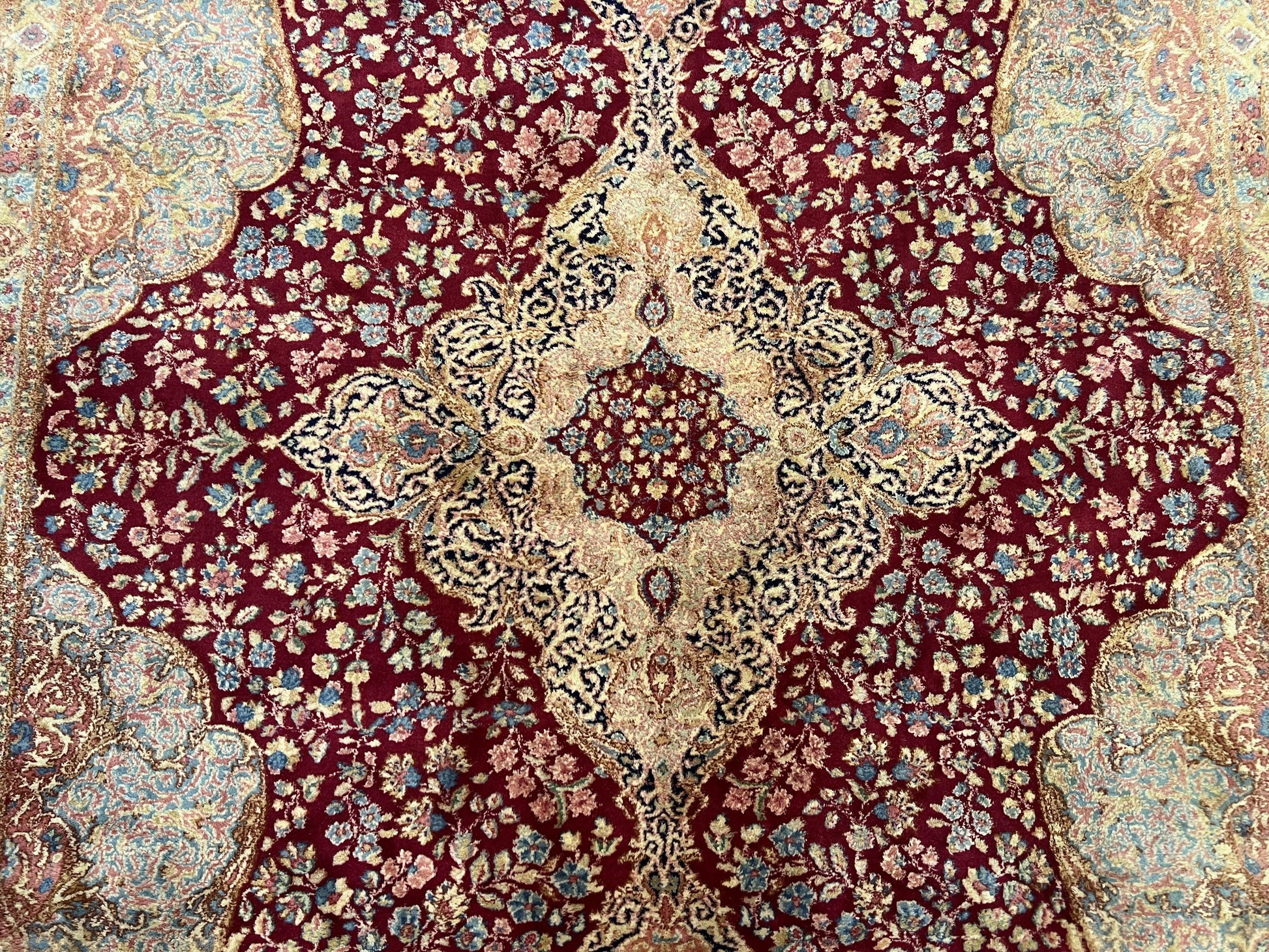 Persian Rug 9x12, Kirman DeLuxe, Millefleur Floral Medallion Carpet, Maroon Light Blue Beige, Semi Antique Authentic Hand Knotted Wool Rug