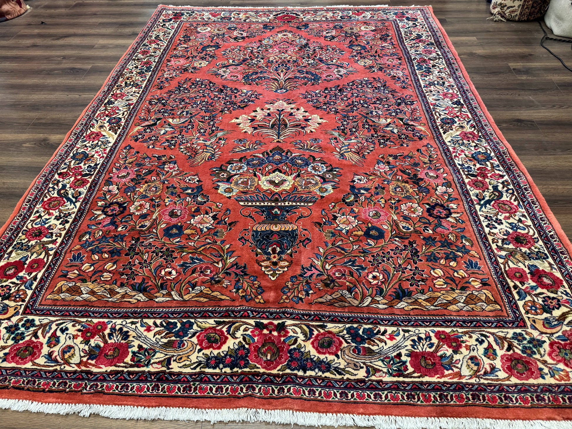 Persian Sarouk Rug 7x10 Red Ivory Floral Bouquets With Birds