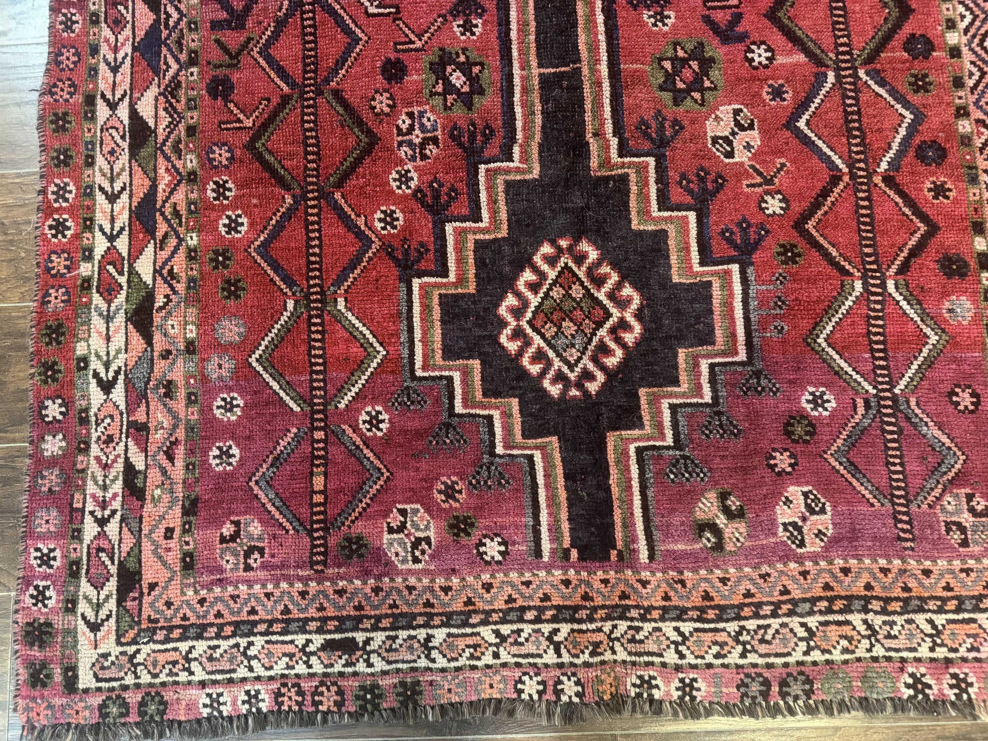 Persian Tribal Shiraz Rug 5x8, Geometric, Raspberry Red and Charcoal, Antique Persian Carpet
