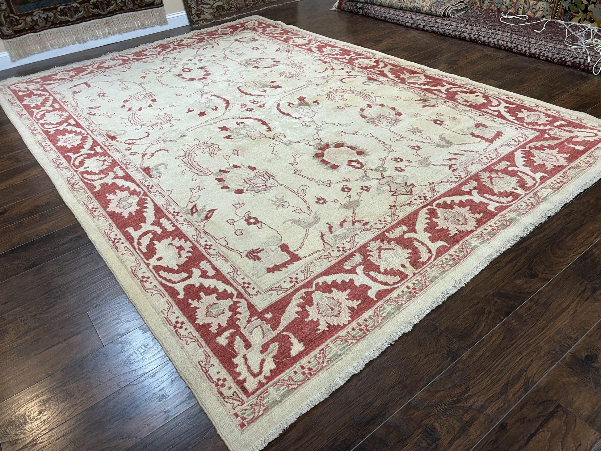 Peshawar Rug 8x12 Pakistani Carpet, Oriental Rug 8 x 12 Chobi Rug, Beige and Red, Allover Large Floral Design, Hand Knotted Vintage Wool