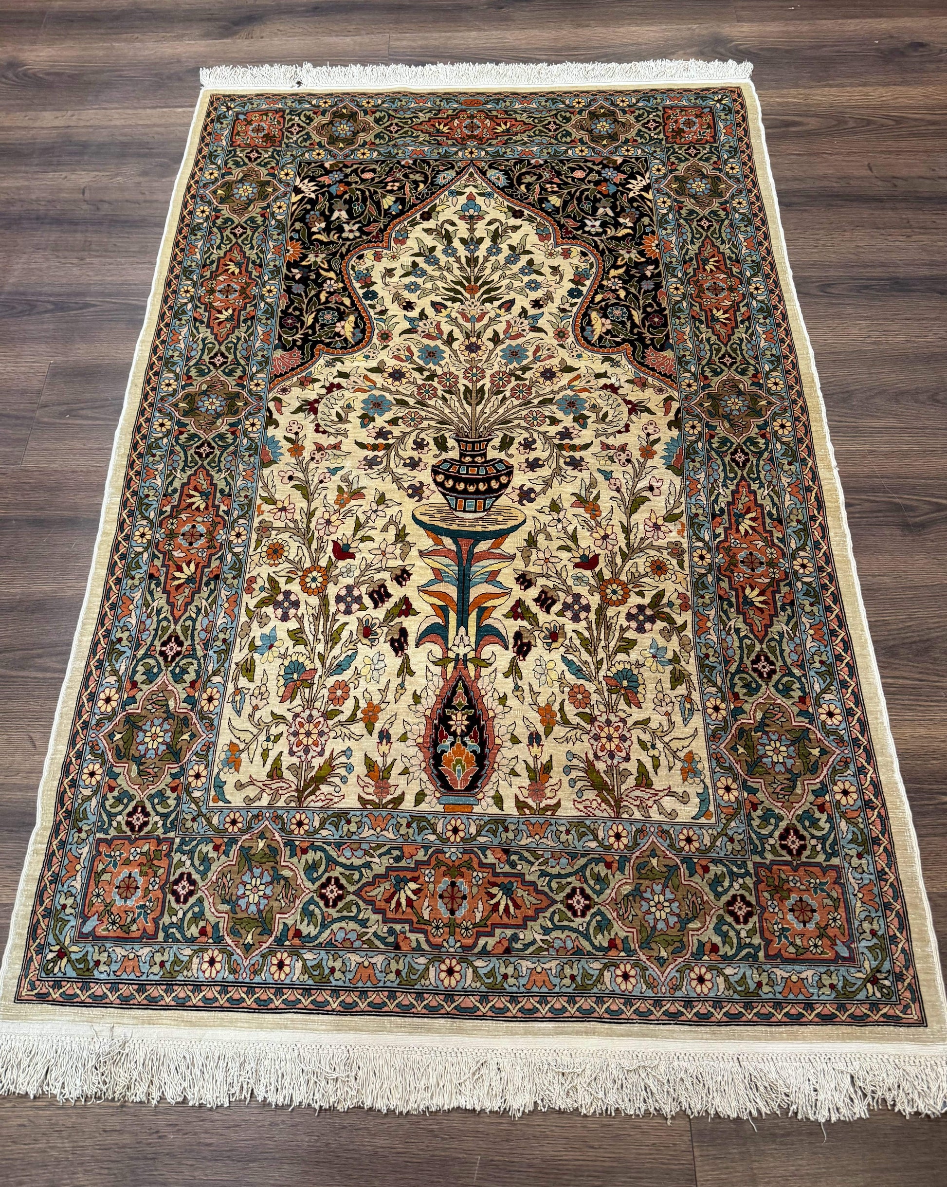 Rare Turkish Hereke Silk Rug 3x5, Tree of Life Persian Vase Design, Very Fine 440 KPSI, Signed