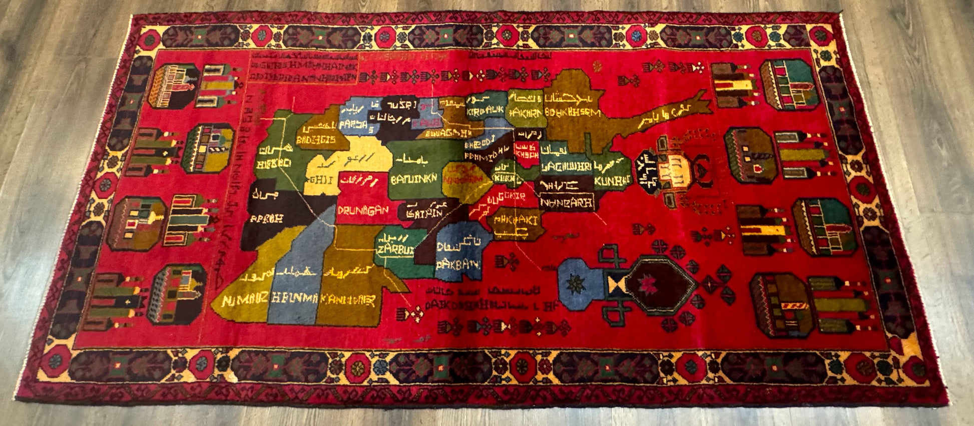 Red Afghan Balouch Rug 3x7, Tribal, Map of Afghanistan Depiction, Handmade, New