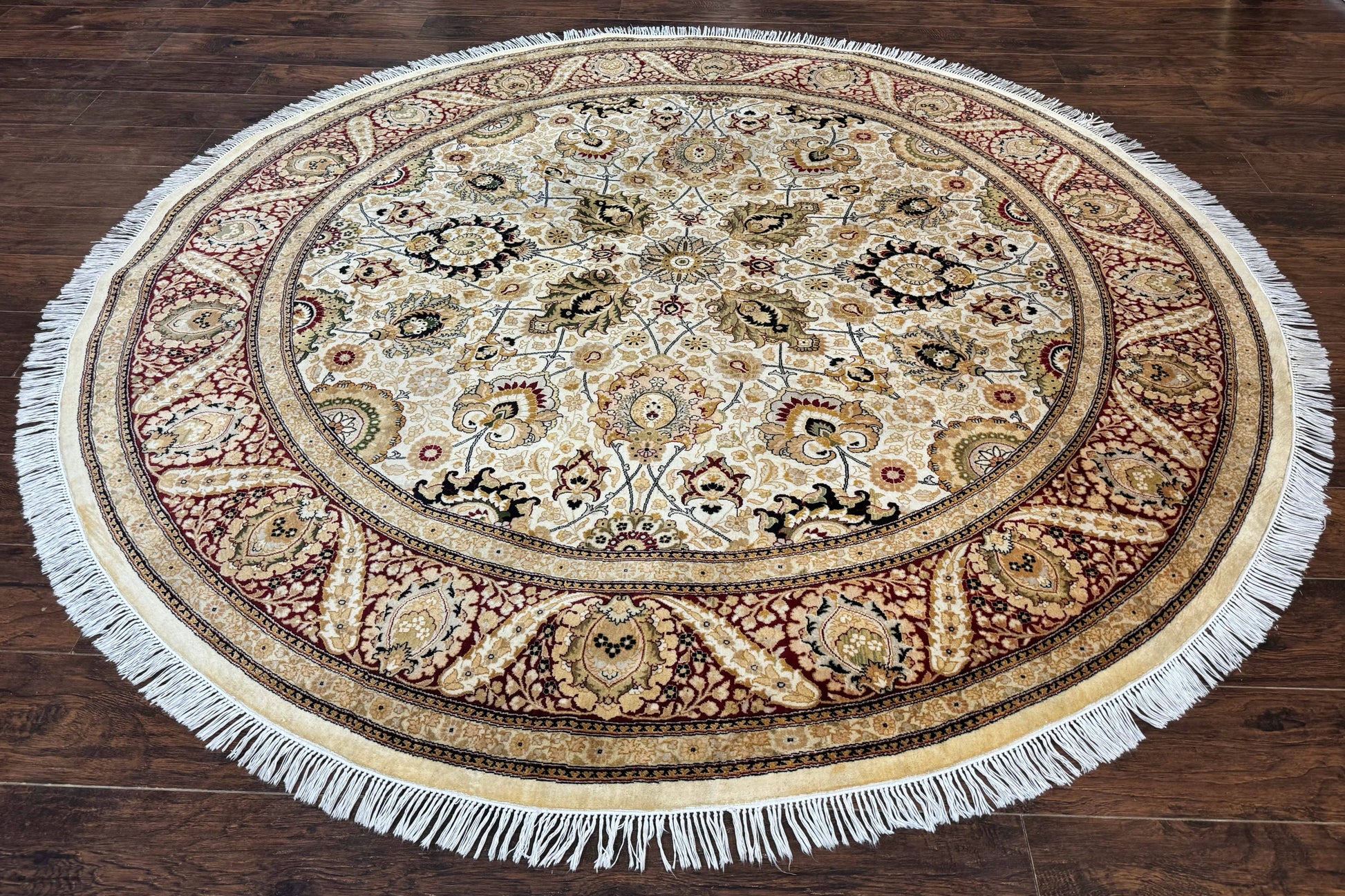 Round Pak Persian Rug 8x8, Vintage Handmade Wool Traditional Carpet, Beige Dark Red, Fine 270 KPSI