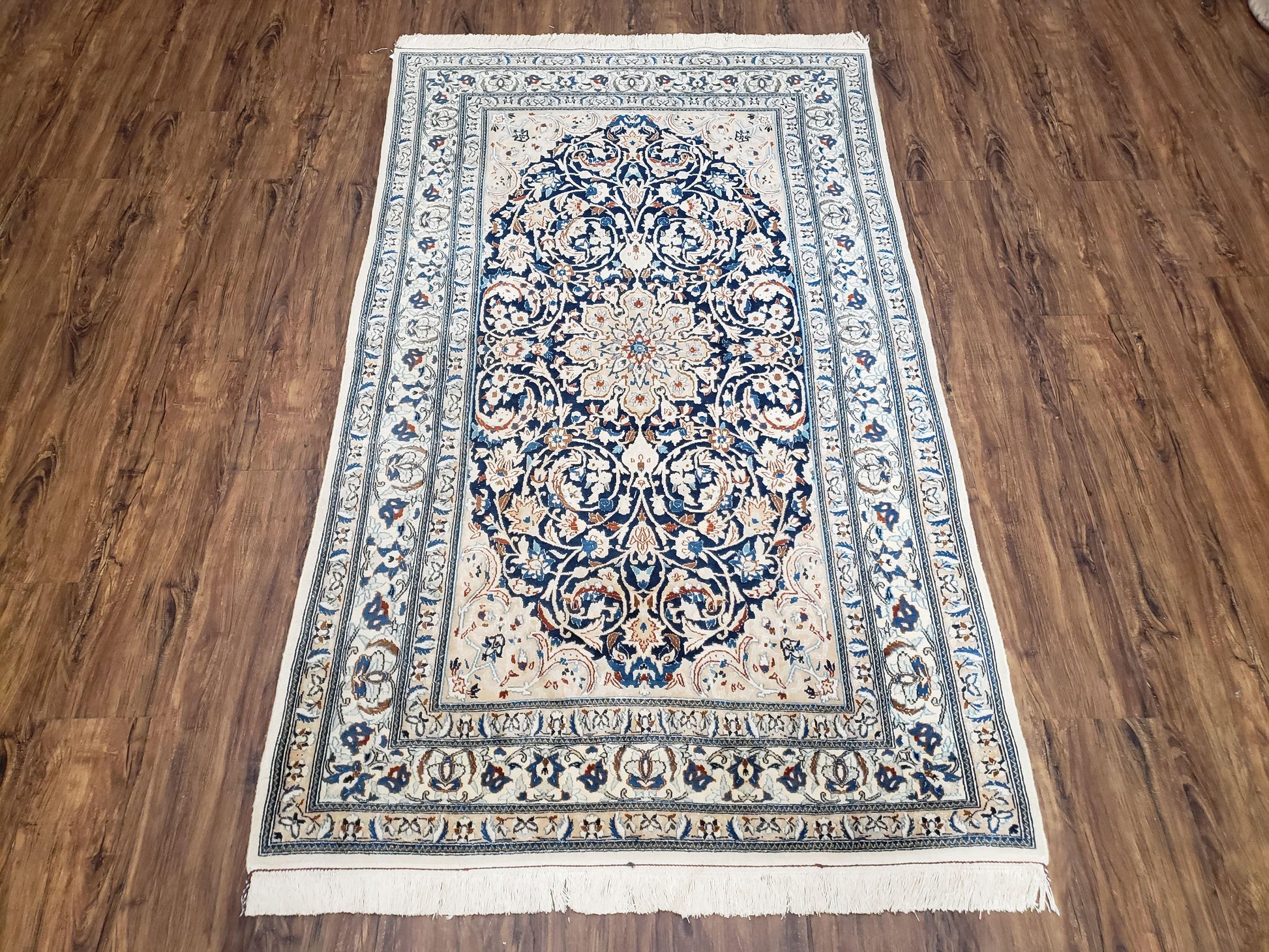 Semi Antique Persian Nain Rug Hand Knotted With Wool Silk Accents Ivory And Blue