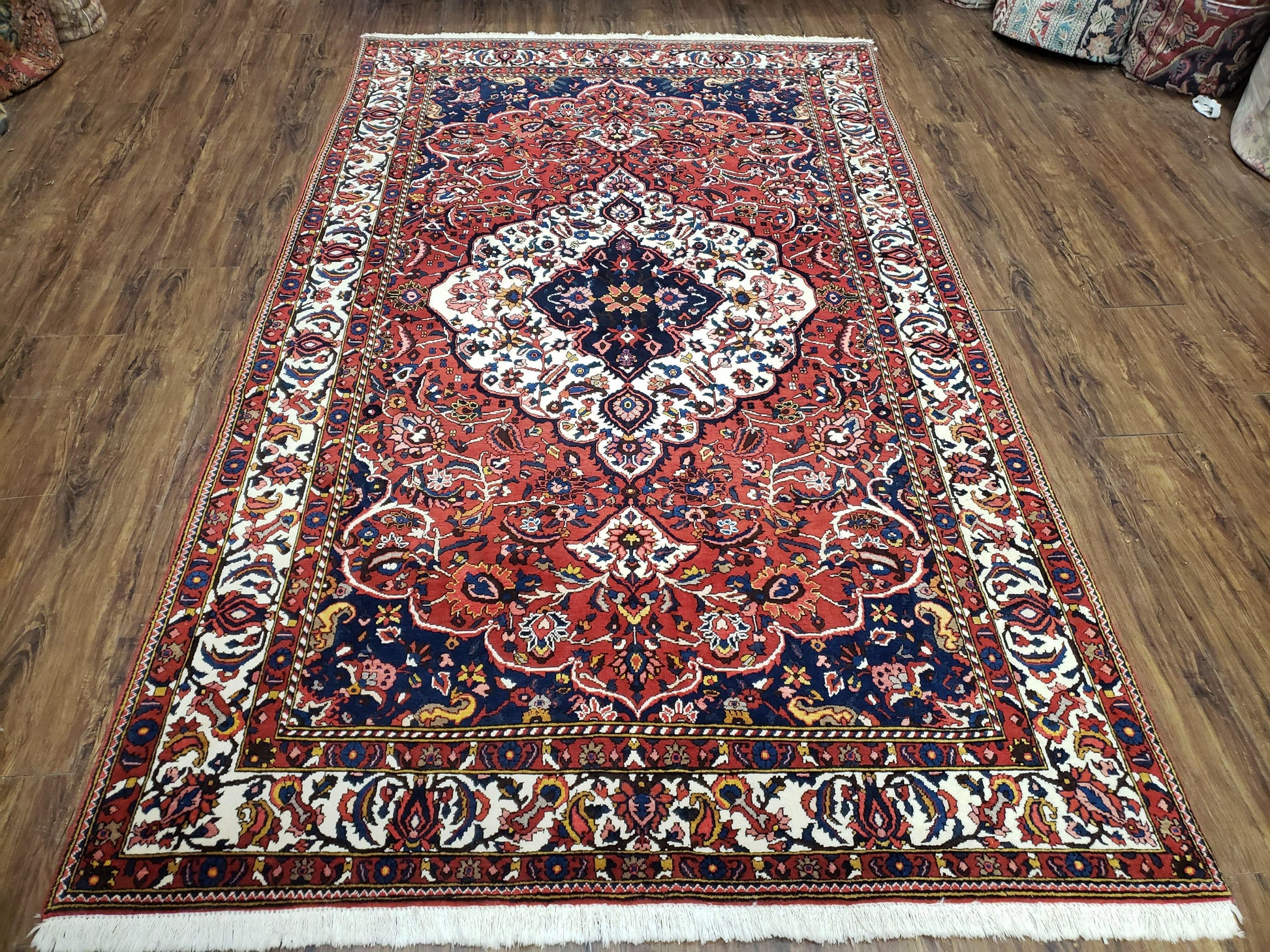 Semi Antique Persian Bakhtiari Rug, Hand-Knotted, Wool, Red, Midnight Blue, Ivory, Floral Medallion, 5'1" x 8' 6"
