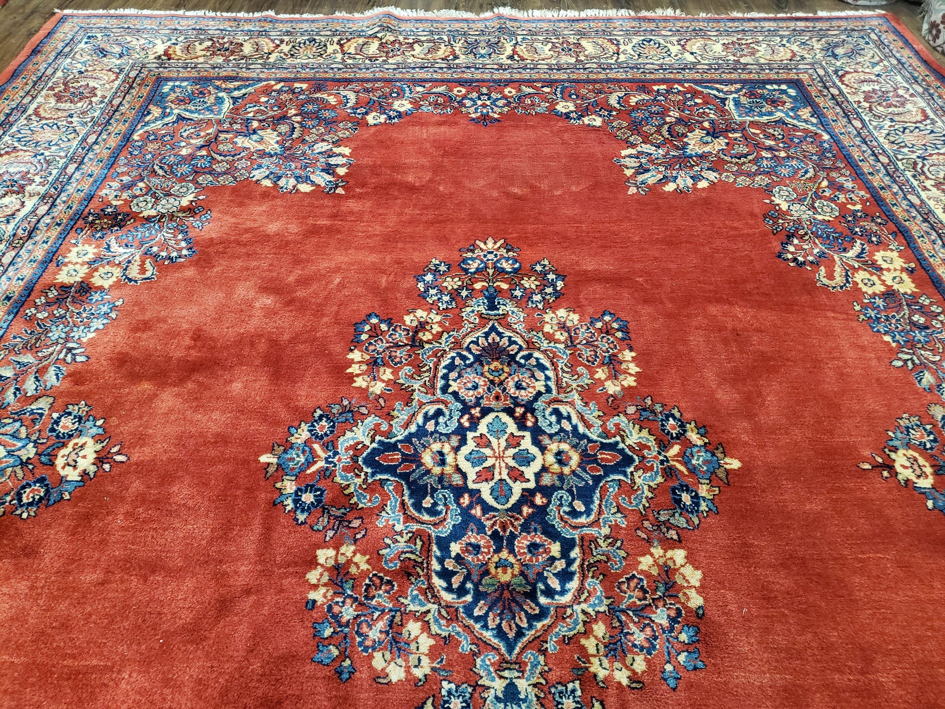 Semi Antique Persian Sarouk Rug 9x12 Hand Knotted Wool With Central Medallion Tomato Red