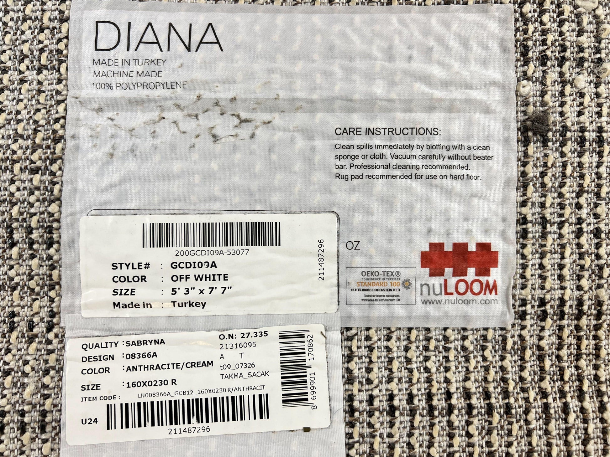 The rug's neutral off-white with black accents provides a versatile backdrop that enhances living rooms, bedrooms, and entryways without dominating the space.