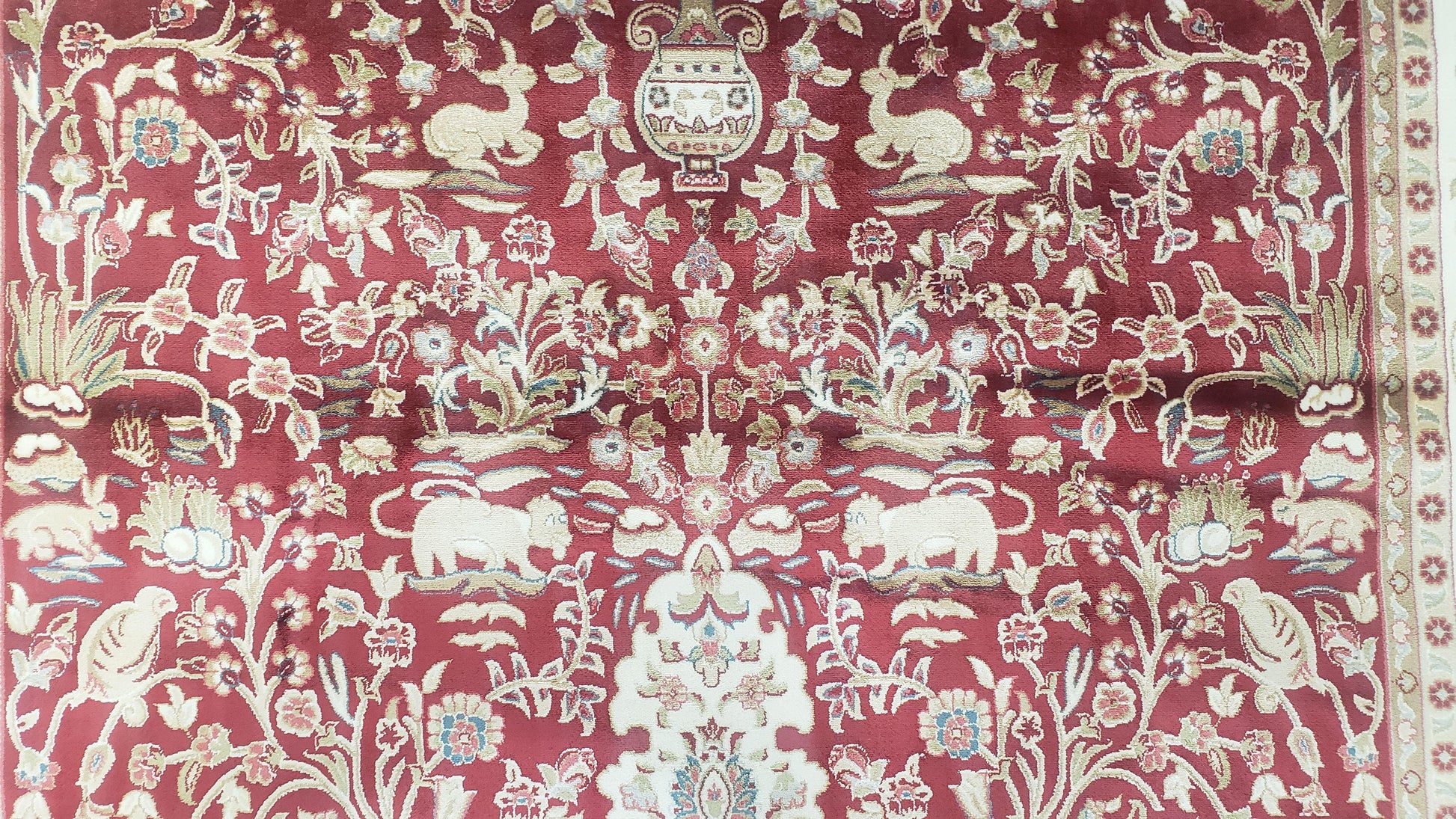 Silk Carpet 4x6 Dark Red & Cream, Tree of Life Rug, Animal Motifs, Birds Deer Rabbits, All Bamboo Silk, 4 x 6 Silk Area Rug