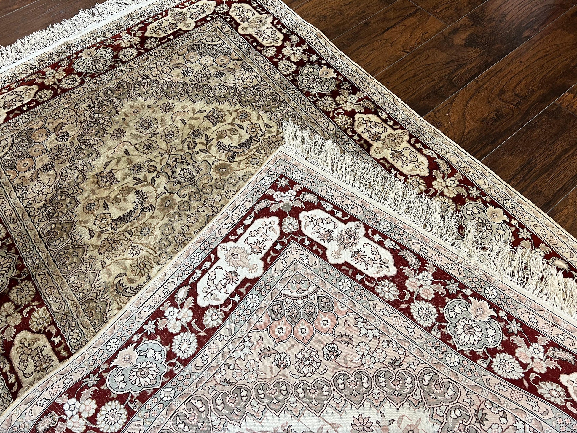 Silk Indian Kashmiri Rug 4x6 ft, Floral Medallion Hand Knotted Handmade Oriental Carpet, Vintage, Cream Burgundy, Very Fine Silk Rug 4 x 6