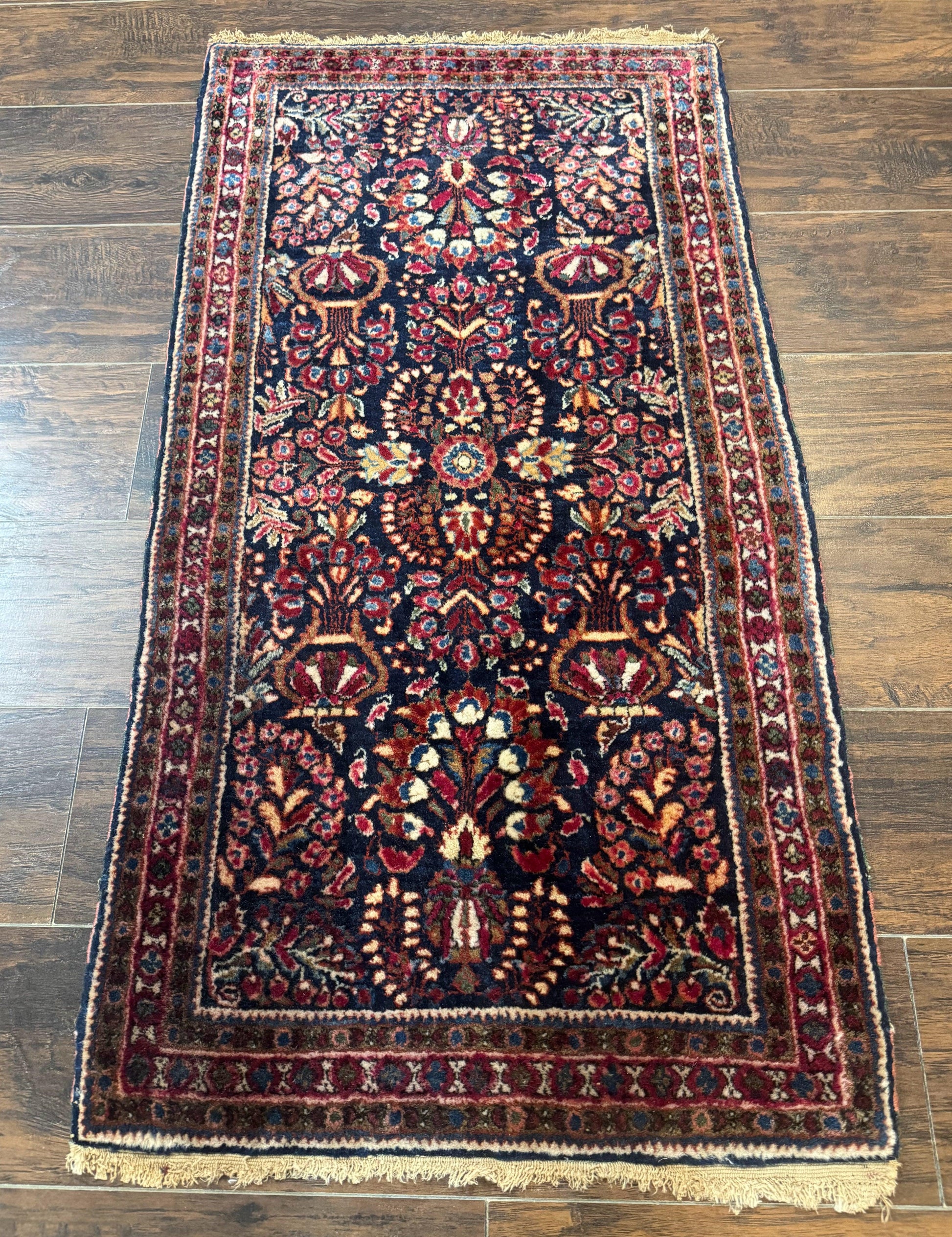 Small Navy Blue Persian Rug 2x4, Sarouk Rug, Rare Colors, Antique 1920s Wool Rug