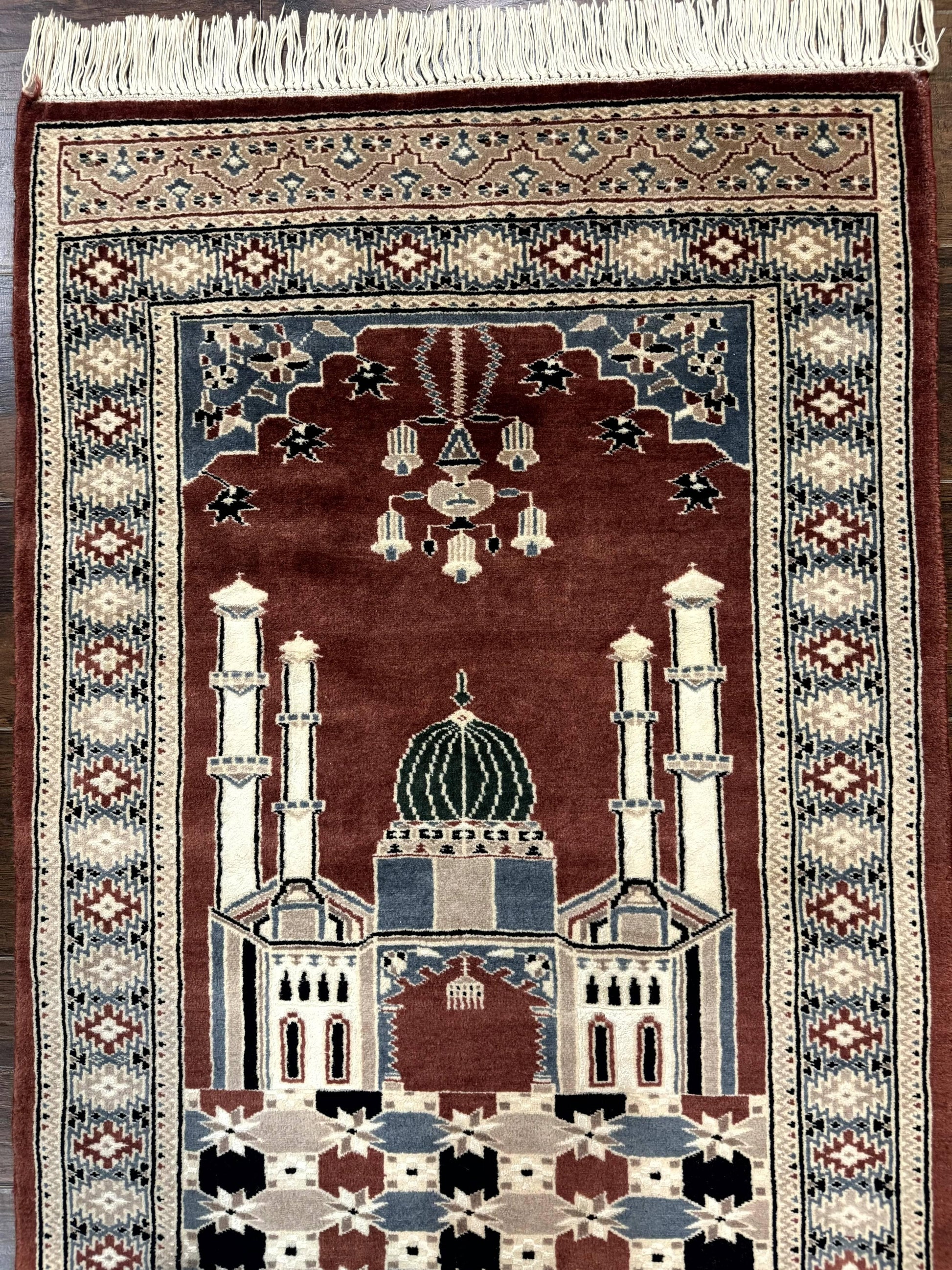 This small Pakistani Bokhara prayer rug is a handcrafted, hand-knotted wool piece ideal for personal prayer spaces, meditation corners, or compact living areas. Its plum and multicolor palette brings warm, traditional character to any room, with vintage charm and durable construction.