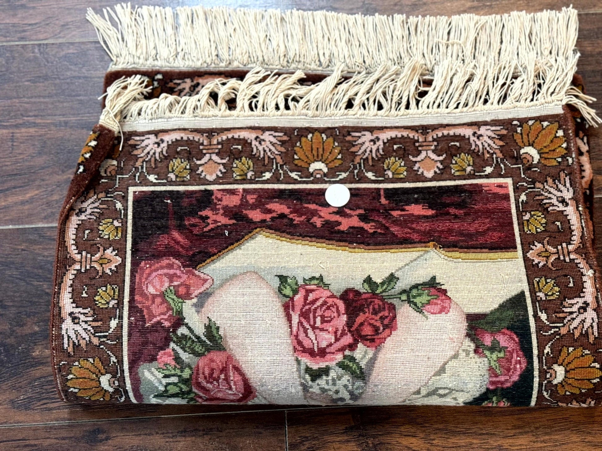 Persian Pictorial Rug Small Tabriz With Roses Portrait Of A Young Lady Handmade Wall Hanging