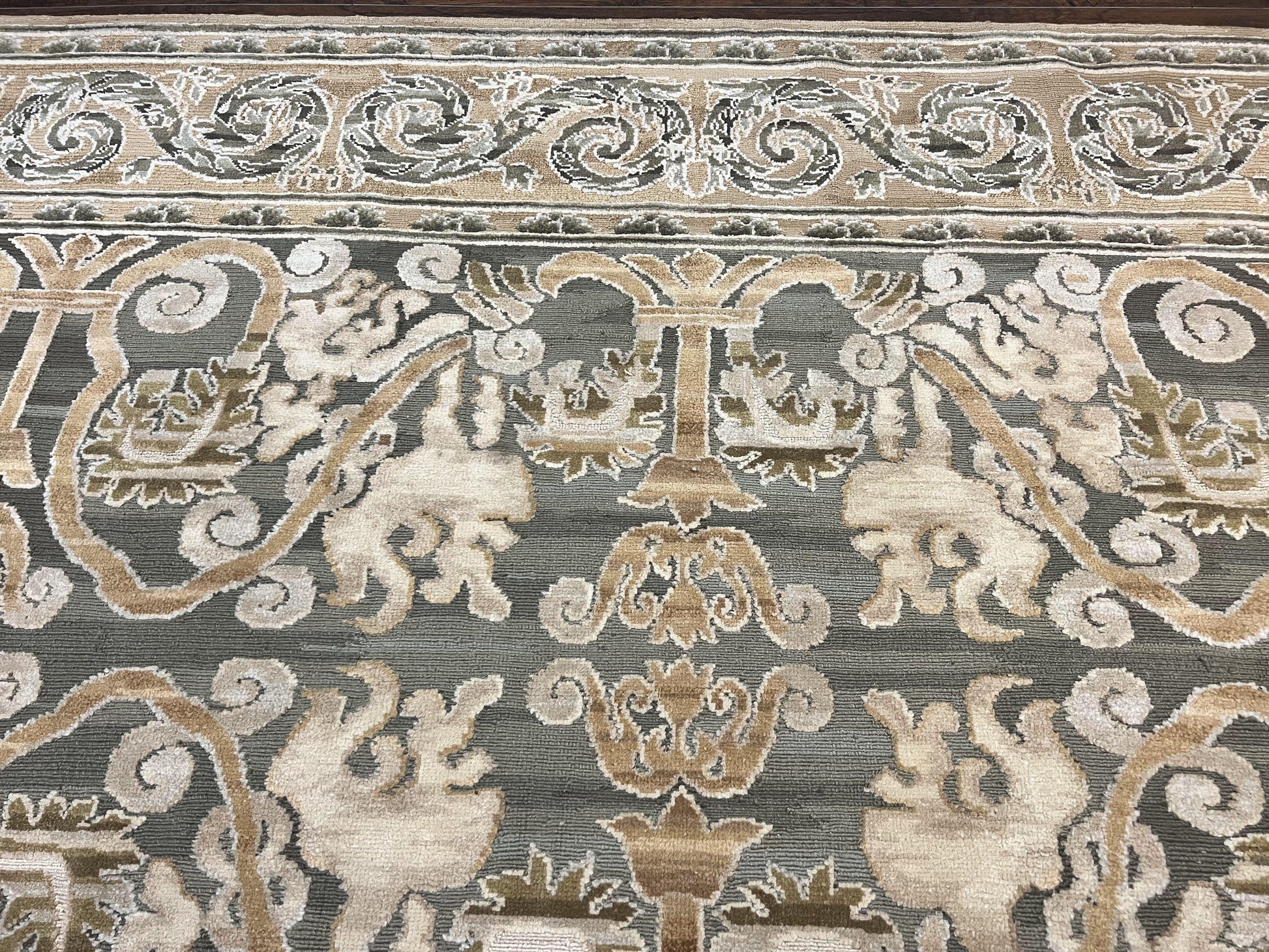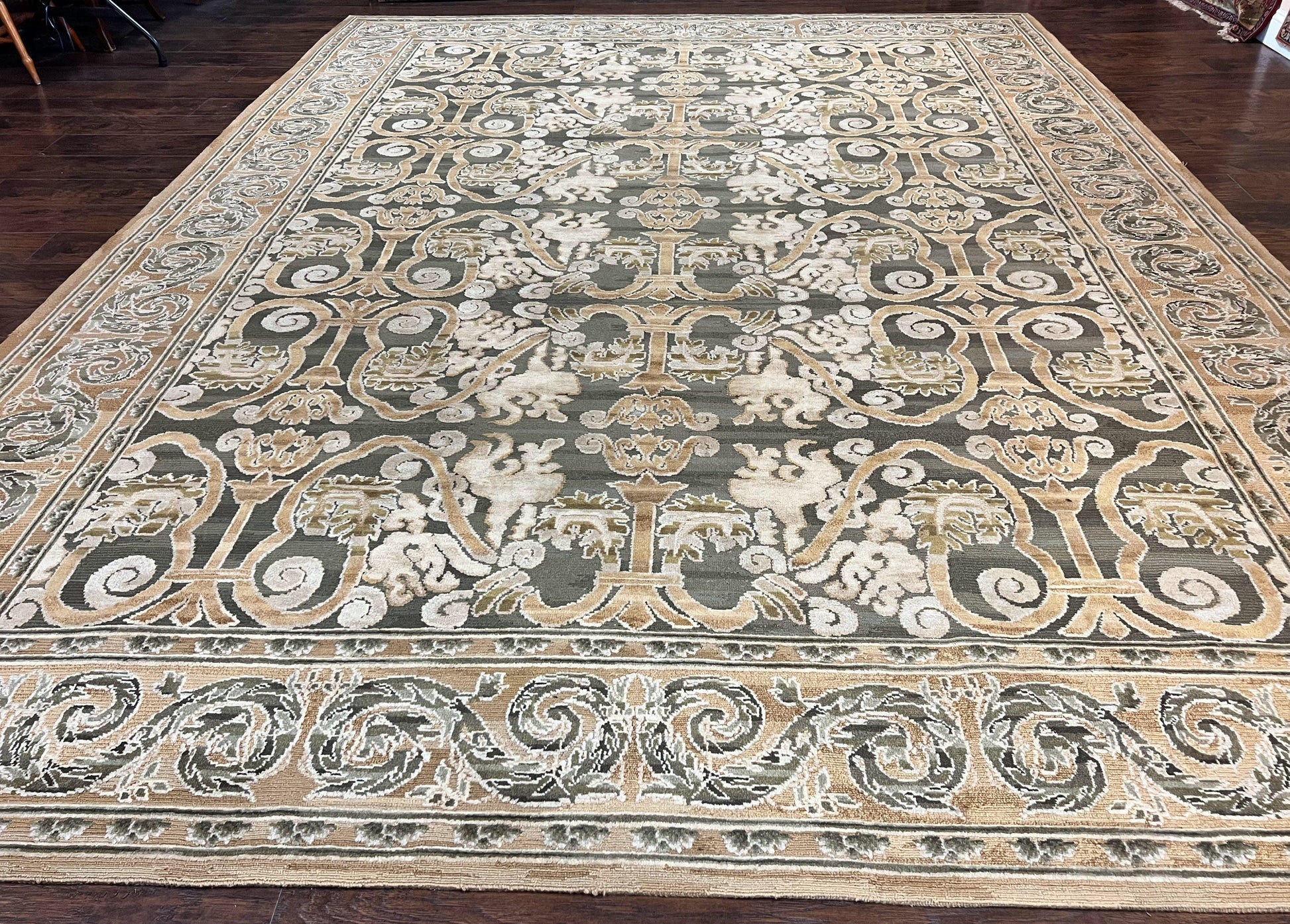 Spanish Wool Rug 11x14 Hand Knotted Vintage Floral Olive Green Beige European Design