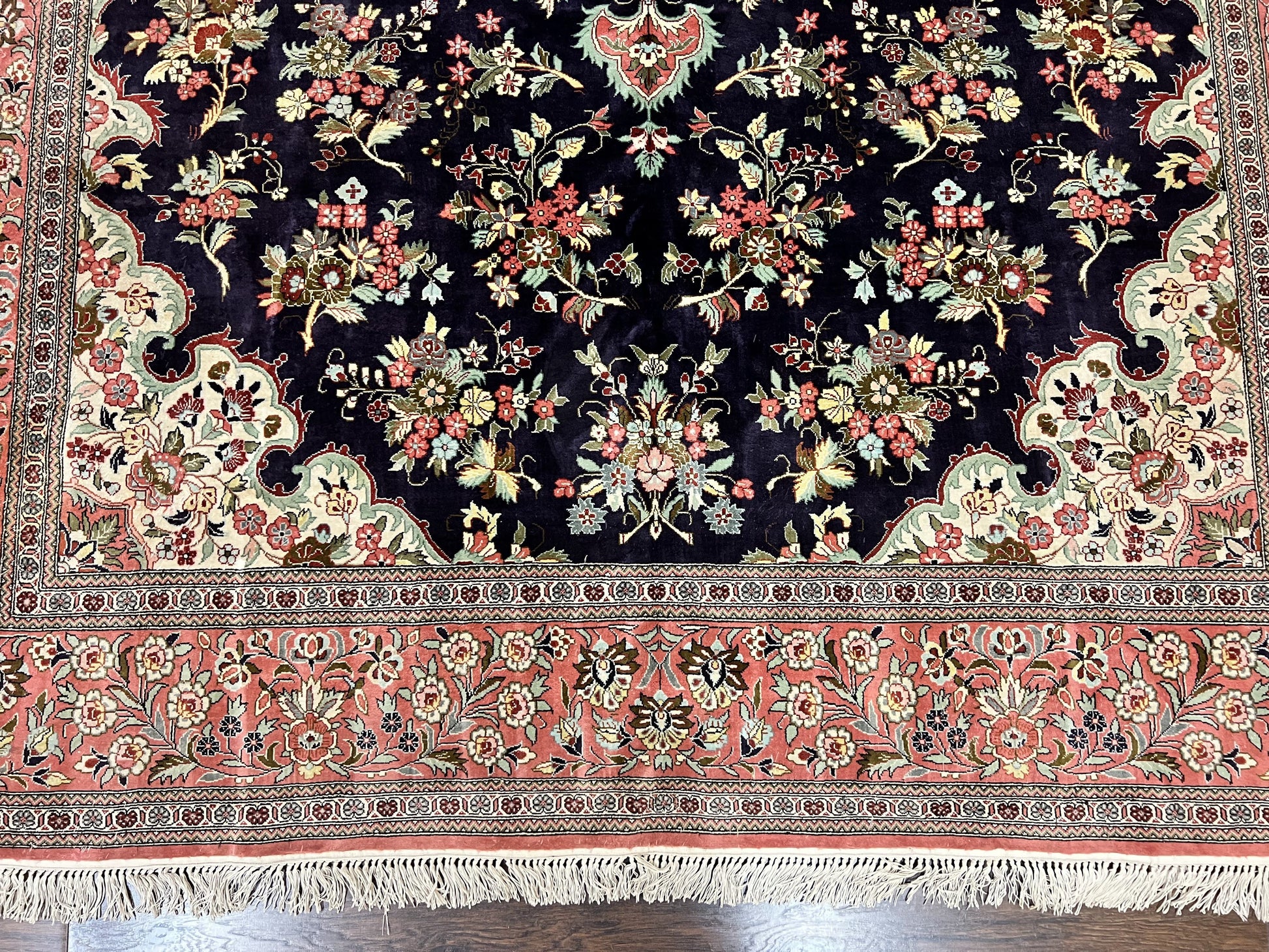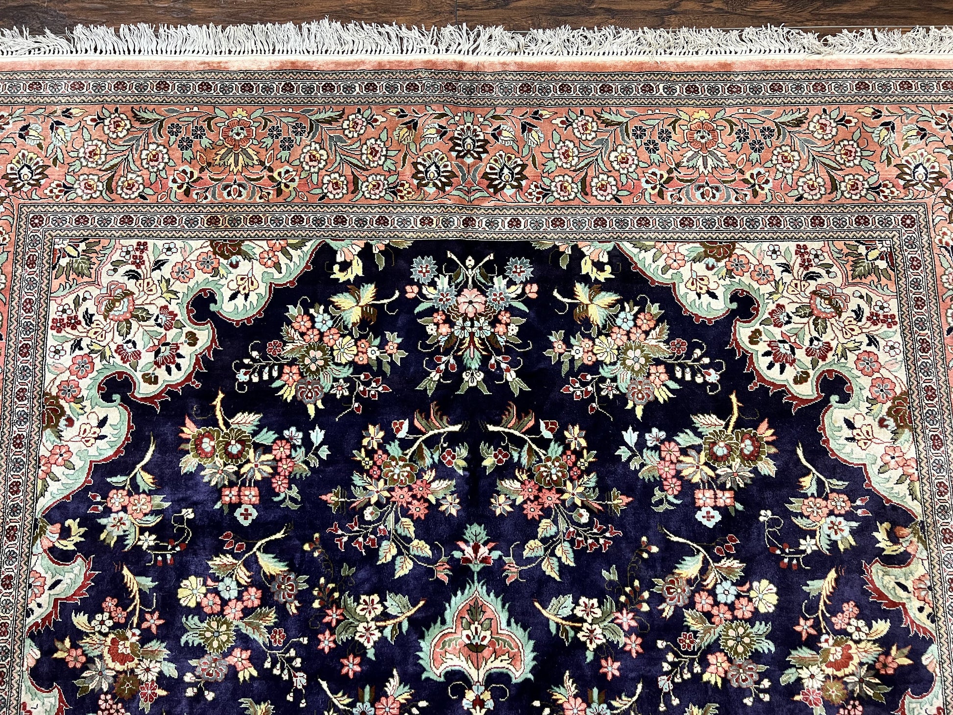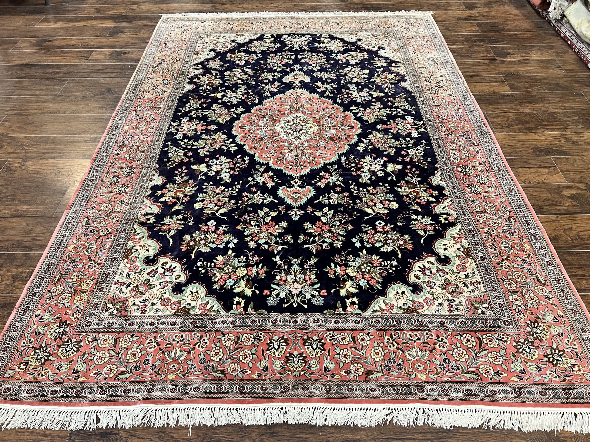 Silk Persian Qum Rug 7x9 Hand Knotted Navy Blue Salmon Floral Medallion Authentic Oriental Carpet