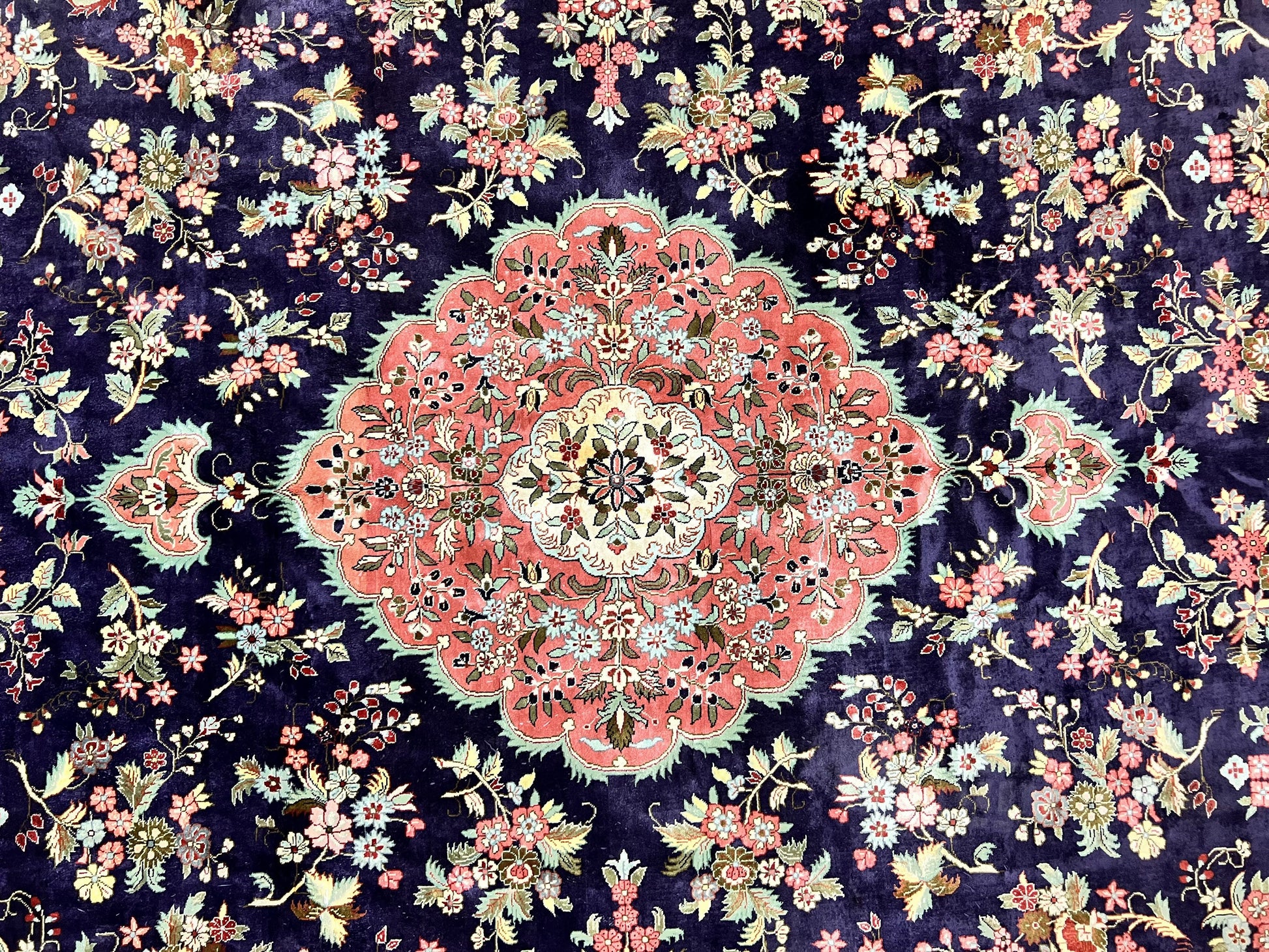 | Condition/Notes | A beautiful semi-antique genuine silk rug in very good condition. Very finely hand knotted, approximately 300 KPSI. Free of stains, odors, discolorations, tears, etc. Good pile & fringes. Recently cleaned and ready to be enjoyed in your space. |